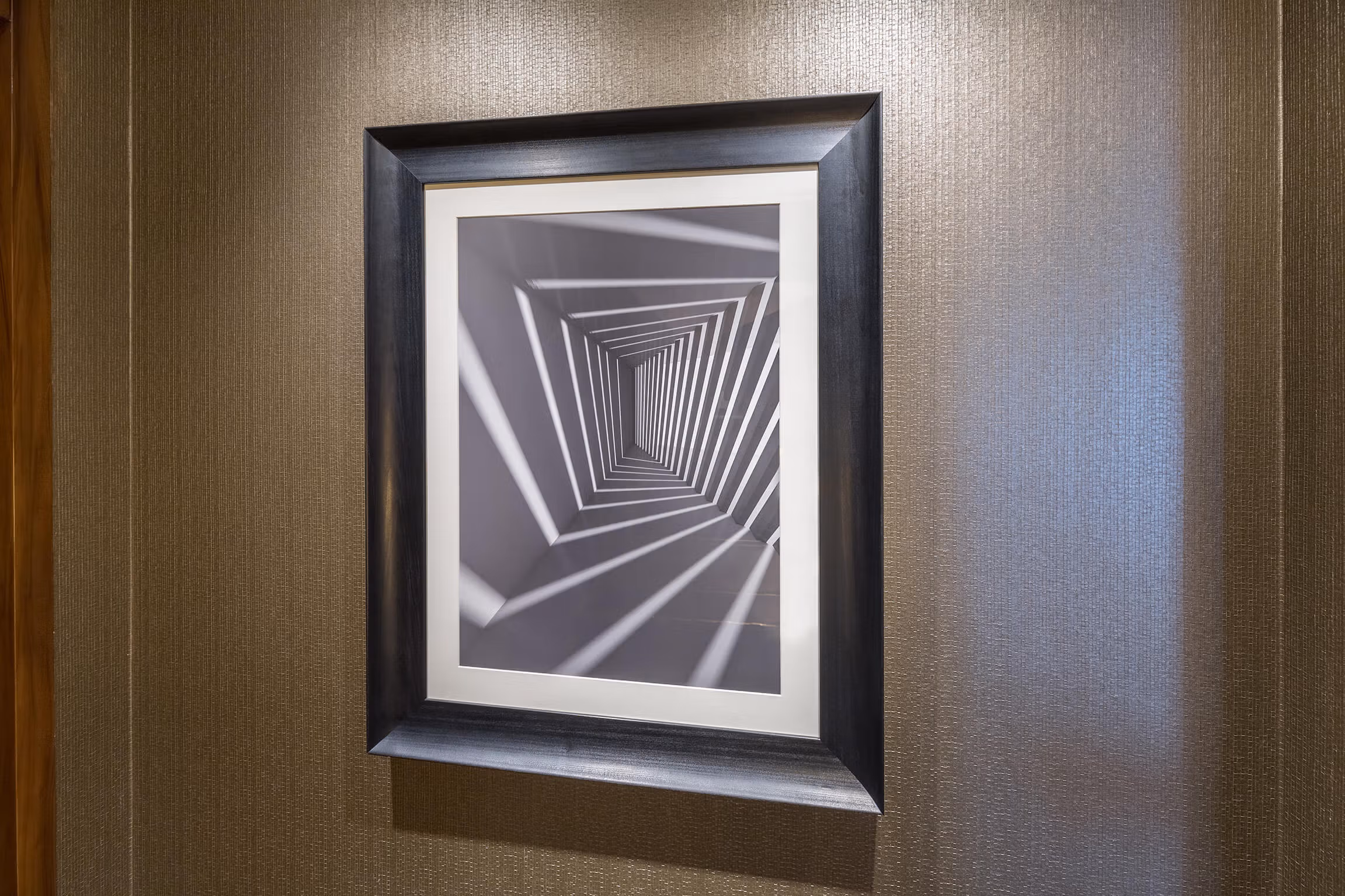 The Mashrabiya is a projecting oriel window that is enclosed by carved wood latticework and was a traditional element in Arabic architecture from the Middle Ages. Taking the Mashrabiya as a muse, ArtLink designed and produced a unique wall sculpture composed of Arabic letters from a local pearl diver’s sea shanty, which was then printed with images of 19th century maps from the Gulf region when it was a line of pearl-diving villages. The laser has replaced the hand of a craftsman, taking a contemporary approach to an extremely traditional design technique.