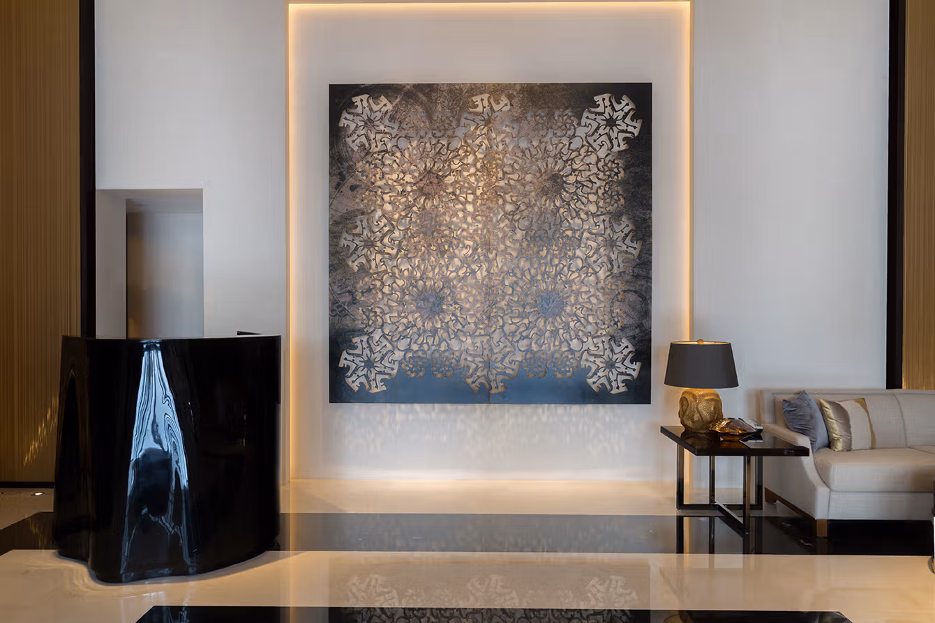This collection is based on the interplay between Dubai’s historically significant local culture and its prominent global role. With a focus on intricate handwork and pattern, ArtLink created a compelling discourse by intertwining contemporary abstract works with works by local craftsmen. The diversity of mediums, including oil, ink, photography, reliefs and sculpture alongside the locally-produced works, reflect Dubai and its important role within its immediate region and the world at large.