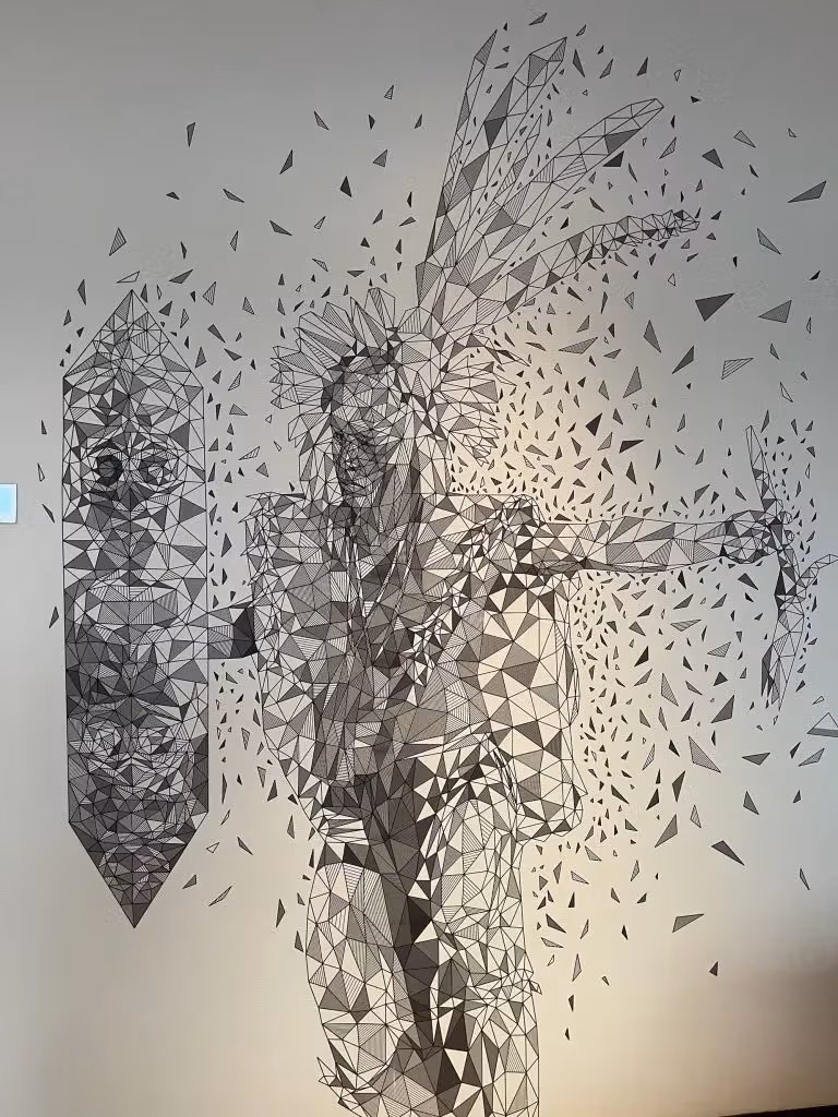 Her intricate patterned works celebrate and blend native culture and the natural landscape of Malaysia, as seen in the second piece. The large-scale features various elements from Kota Kinabalu, including Mount Kinabalu and local flower species, capturing the spirit and biodiversity of the region.