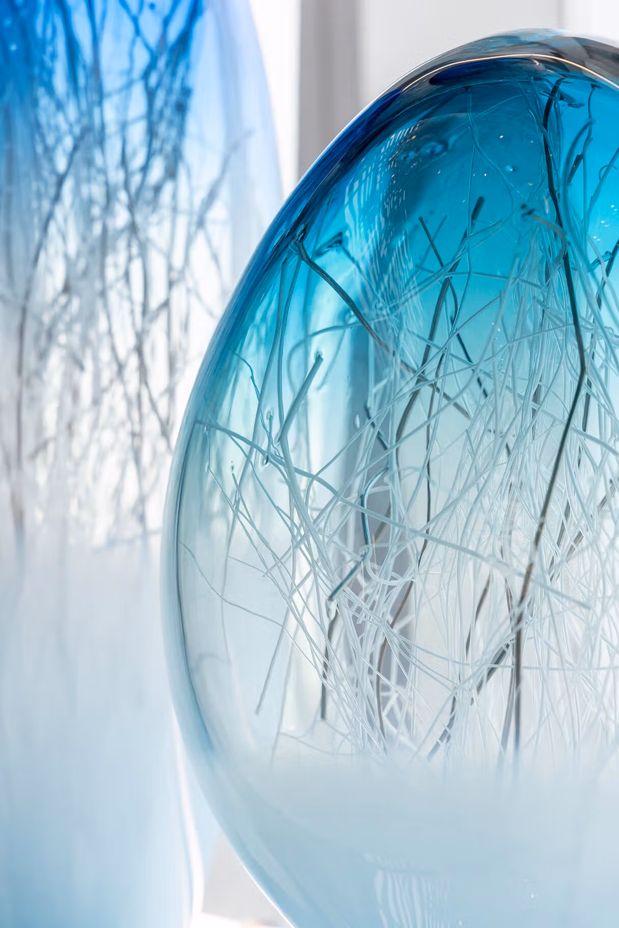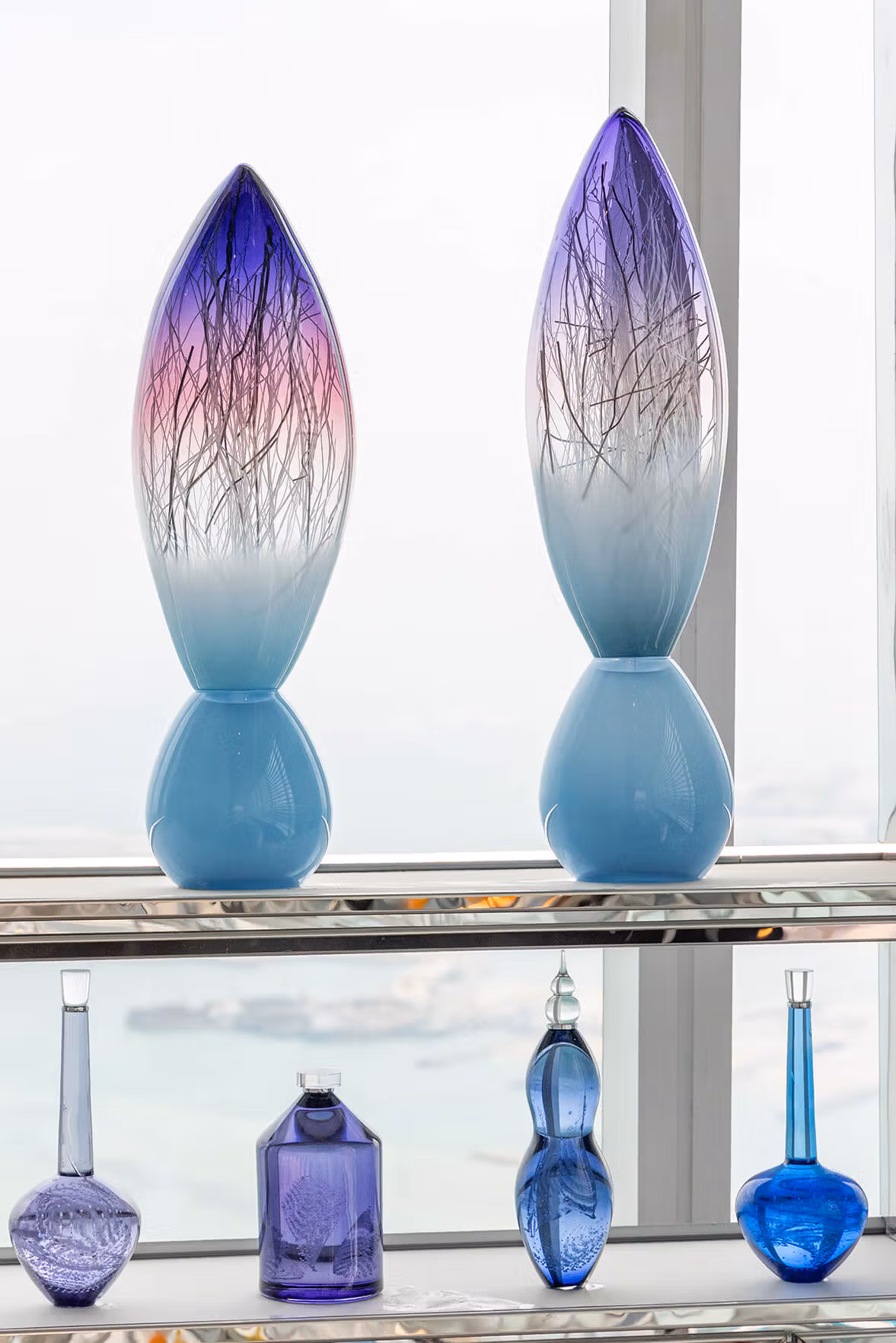 The installation was crafted by master glass artisan Louis Thomson using sand sourced from the Qatari desert and beaches. The design incorporates forms inspired by Qatari culture and landscape, creating a meaningful connection between material, place, and concept.
