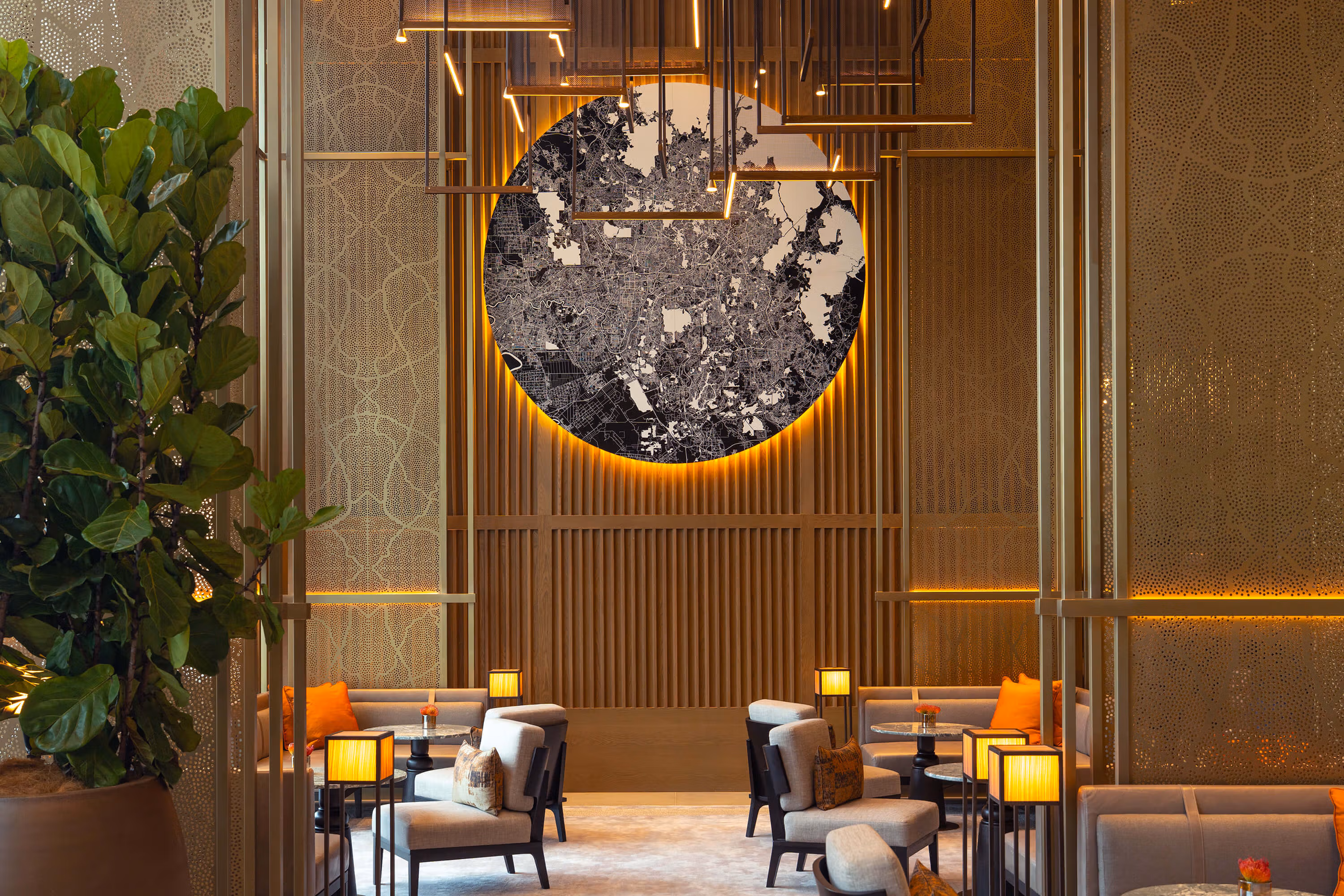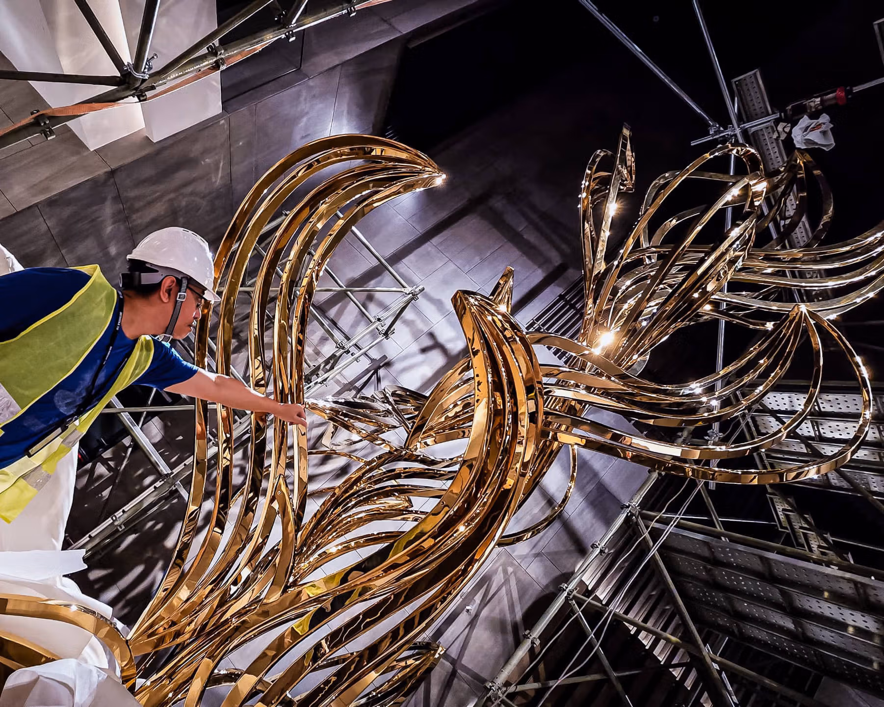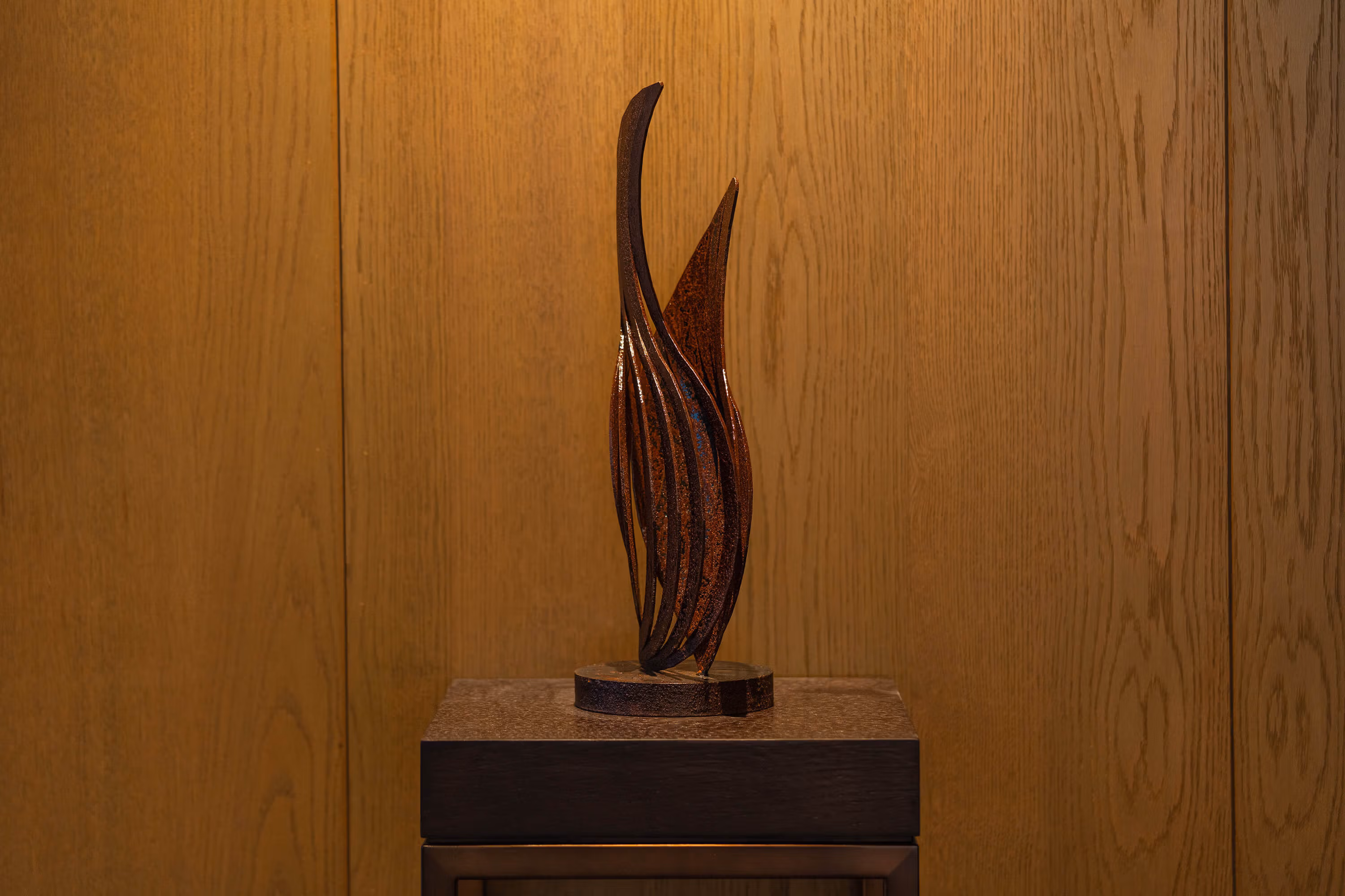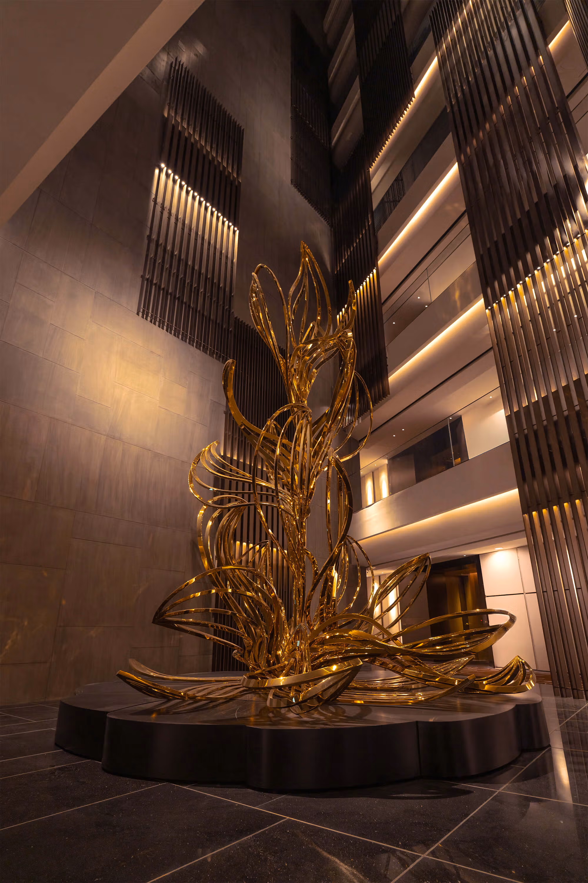 As guests step into the atrium, they are met by a breathtaking six meter tall sculpture by acclaimed Malaysian artist Abdul Multhalib Musa. Drawing inspiration from Malaysia’s lush flora and the motifs woven throughout its rich cultural heritage, Abdul transforms steel into flowing, organic forms that seem to move with light and air. A highlight of the collection, this special commission celebrates the local flora and the artistry of Malaysia, offering a striking first impression for every visitor. Bringing the piece to life was no small feat. Because of the hotel's location on the 102nd floor, the sculpture had to be transported in small sections, and assembled on-site by a skilled logistics team. Even the base was engineered in modular parts, with each connection point designed to blend seamlessly into the form so that every joint became an intentional part of the sculpture’s design.