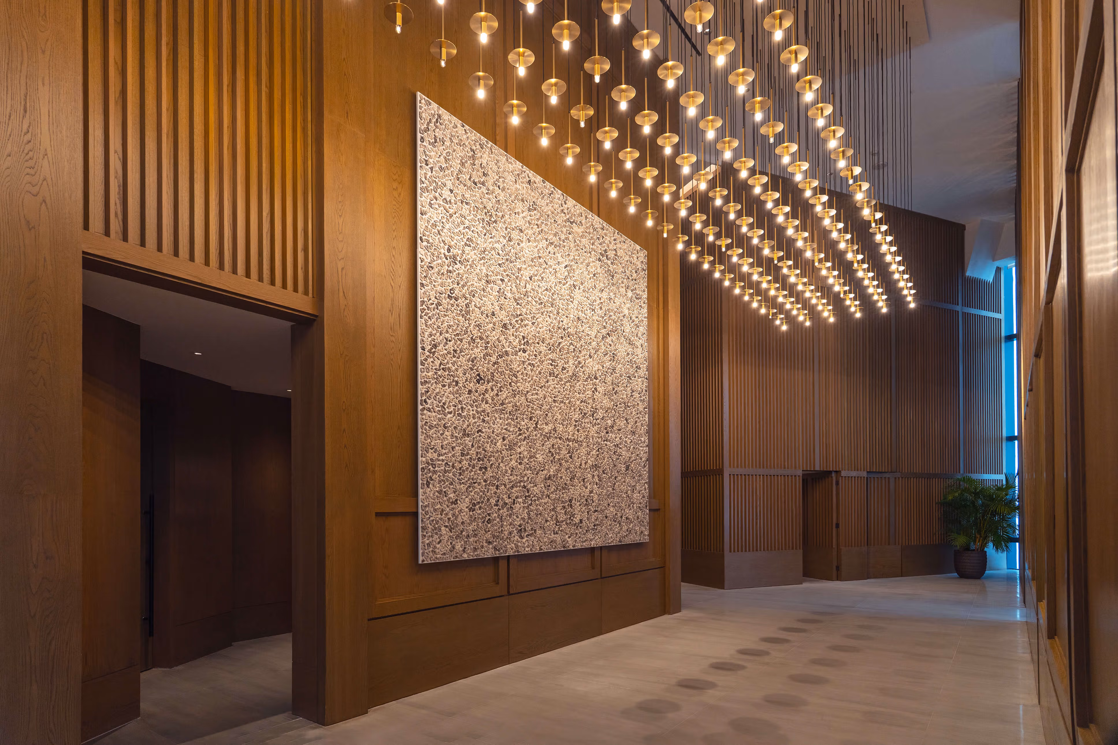 A series of works located throughout the corridors on each floor take inspiration from the songket weaving of Terengganu, Malaysia, with brushstrokes that mimic the interlacing of threads. Commissioned for the hotel, the pieces also echo the artistry of batik, celebrating Malaysia’s rich textile heritage.