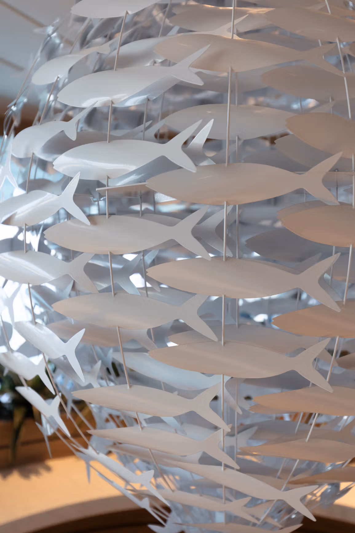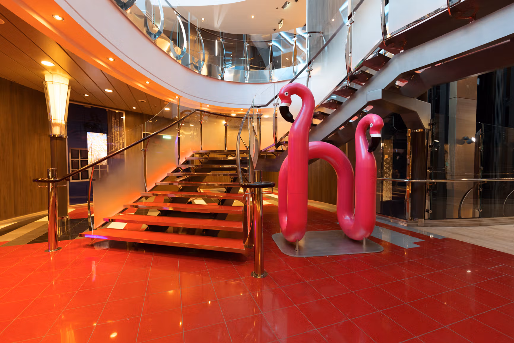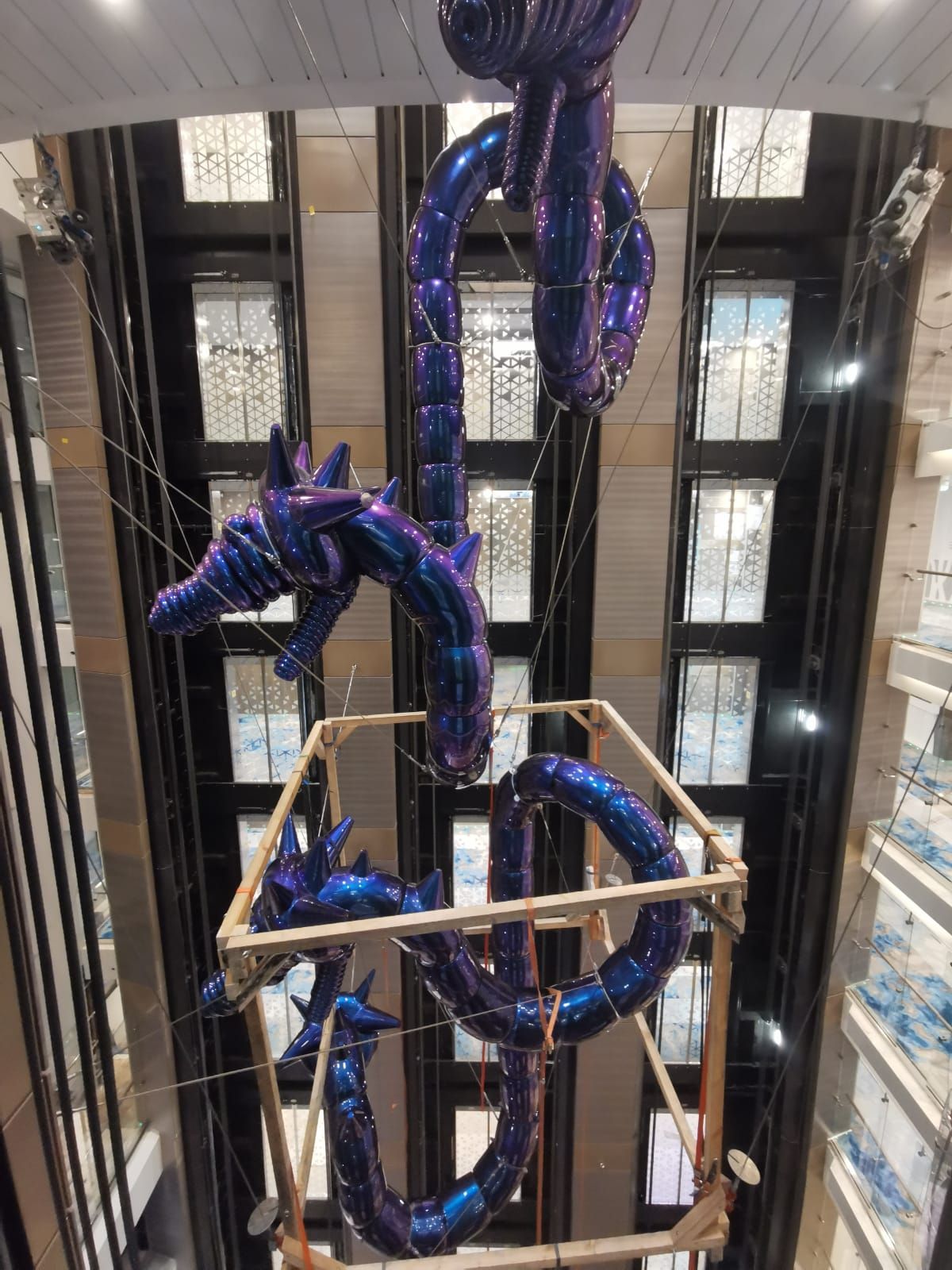 This playful and interactive work accompanies the guests as they venture from one activity to another. The impressive 2,200kg statement is floating in the most central space of the ship, radiant and mesmerizing in its blue chrome scales. Without a doubt one of the largest and most iconic works to be seen aboard a vessel.