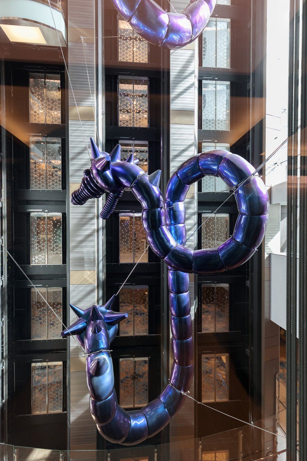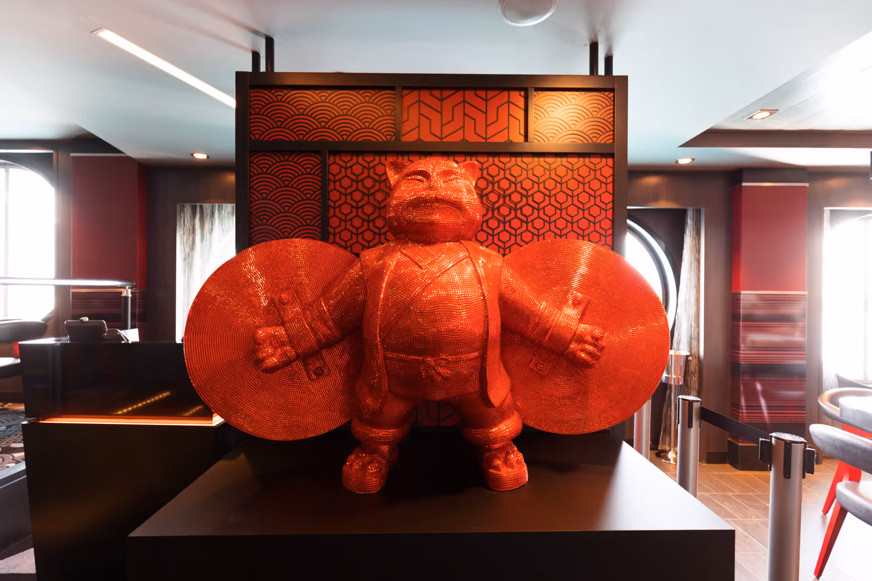The symbol of luck, prosperity, and power, towering across 11 decks, is the monumental Dragon Robots. This whimsical version of the fantastic creature is a beautifully crafted adaptation of ancient imagery from myths and lore. The artist considered a variety of sea creatures to swim between decks before having his ah-ha moment. In Chinese mythology, dragons were believed to move entire bodies of water, and despite being wingless had the ability to fly. The dragon itself is truly the wonder of the sea and became the perfect embodiment of the journey that guests take while onboard.