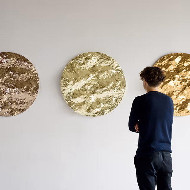 These unique reflective works glimmer in shades of gold and are beaming with affluence. The artist used thermoformed glass, a unique process that allows him to create texture without losing the perfection of the circle. Through this technique, a striking surface was constructed, so that the glass reflects the light in a different way from every angle. The artist used every shade of gold leaf available to reflect the changing shades of a golden sun setting into the ocean.