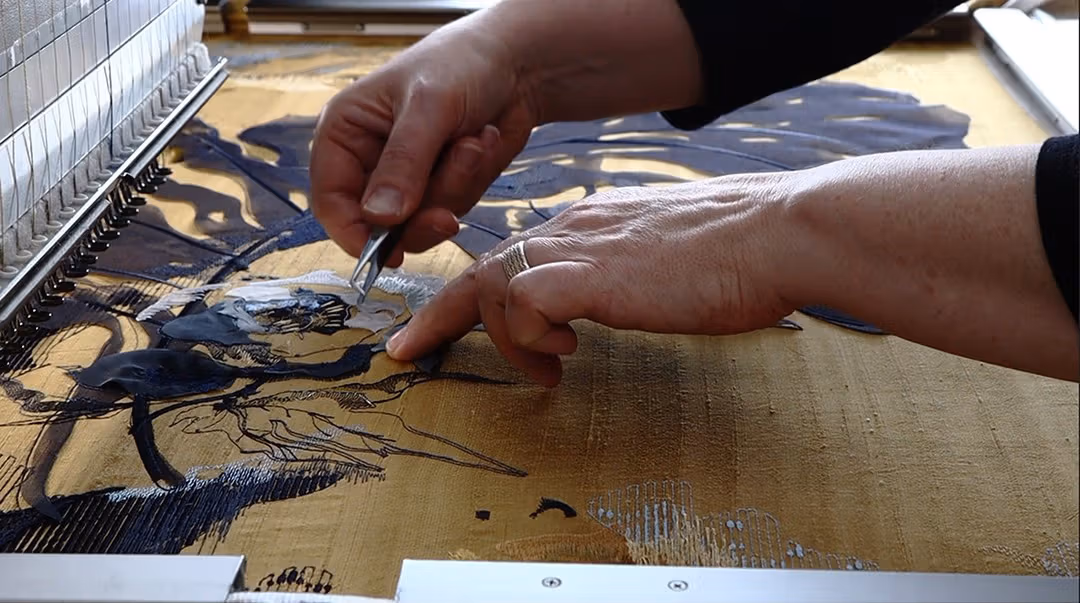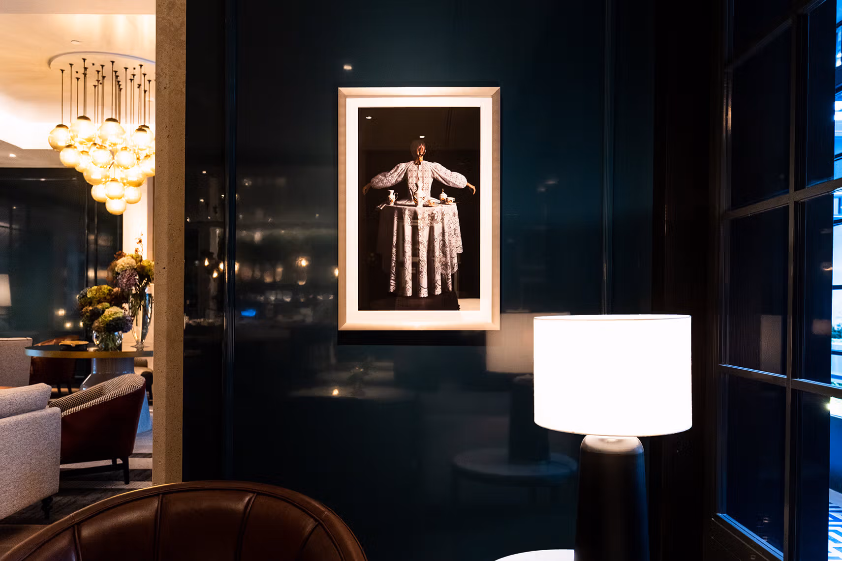 A tailor-made piece by artist Jacky Puzey draws inspiration from Madrilenian aesthetics and Spanish tailoring from Balenciaga to Oteyza. Introducing an interplay between light and dark, detail and color, the artwork fuses the sense of opulence, grandeur and drama inherent in Spanish architecture, court painting and fashion. The richness of historical costumes and textiles, combined with contemporary craftmanship, create a unique 3D tableau, an ode to local heritage.