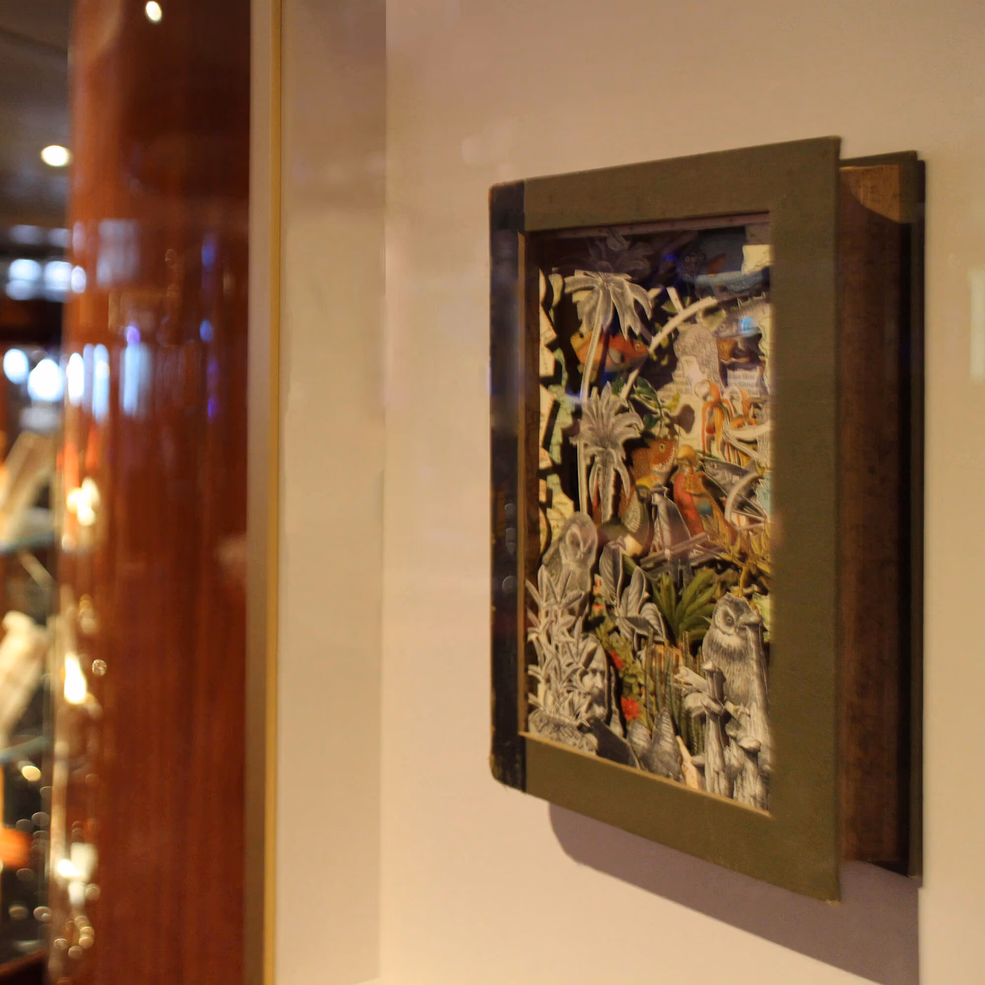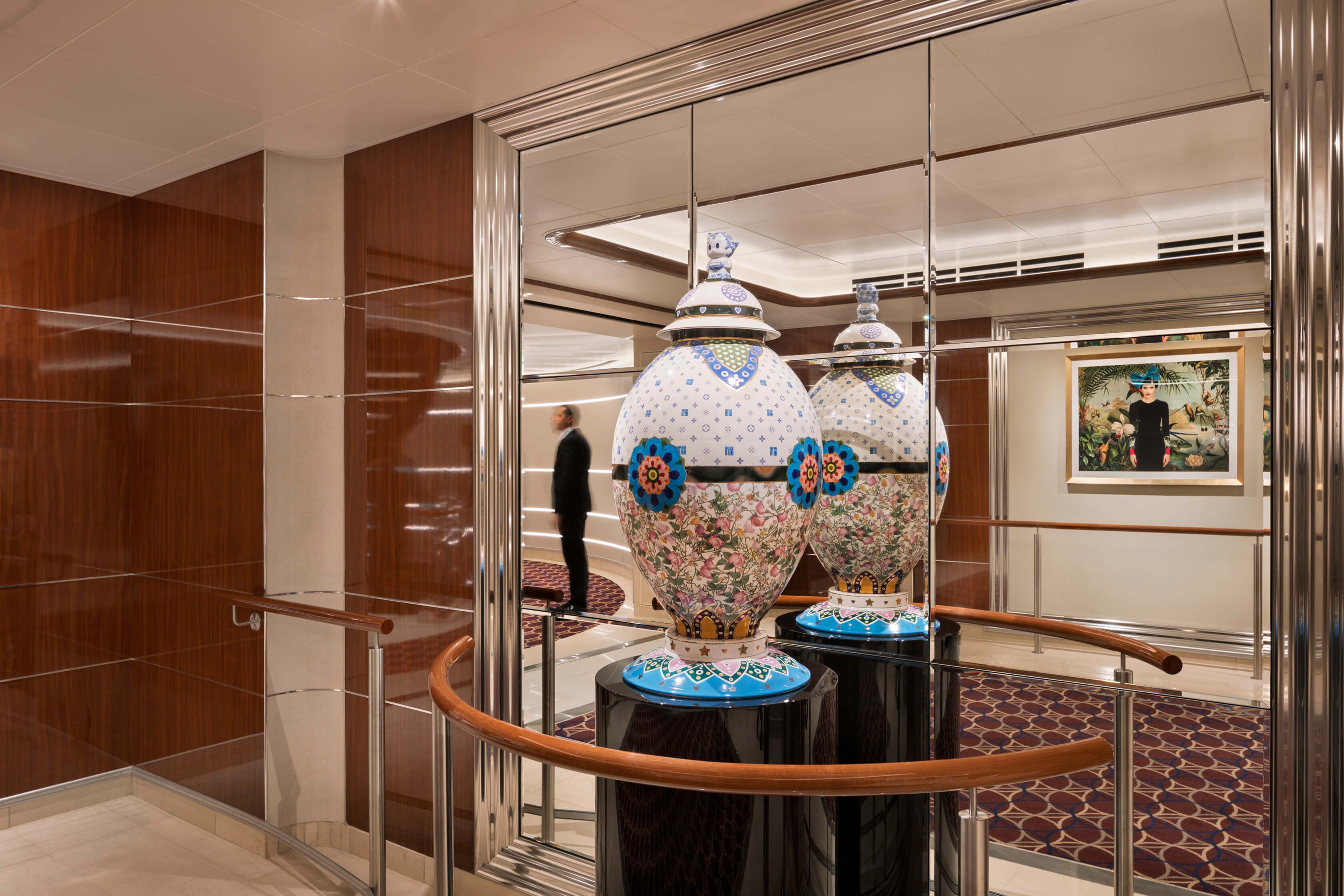 ArtLink installed the work of Korean ceramic artist Yoo Eui Jeong, whose vases explore the theme of travel and cross-cultural pollination in two bespoke pieces for the Seabourn ships. Jeong uses timeless Korean vase-masking techniques to produce works that are a bricolage of cultural references: Western pop icons collide with traditional Asian design motifs to create one-of-a-kind vases that are displayed in the Lift Lobbies of the Encore and Ovation. Since collaborating with ArtLink, Jeong has become more established and has recently exhibited in the V&A.