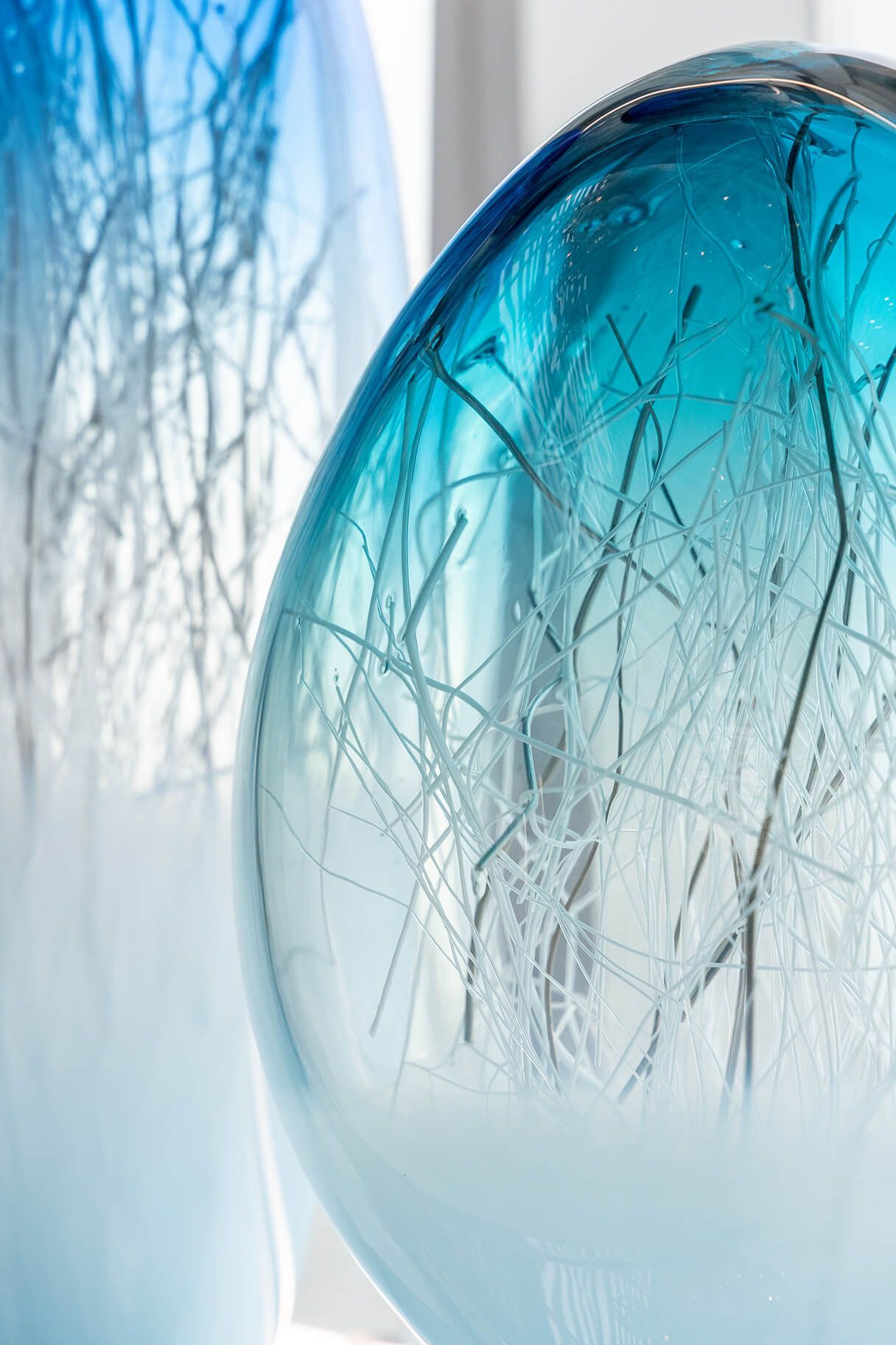 The larger-scale blown glass works in the collection showcase intricate internal structures that juxtapose their polished outer surface which enclose them within a realm brimming with electrifying vitality.