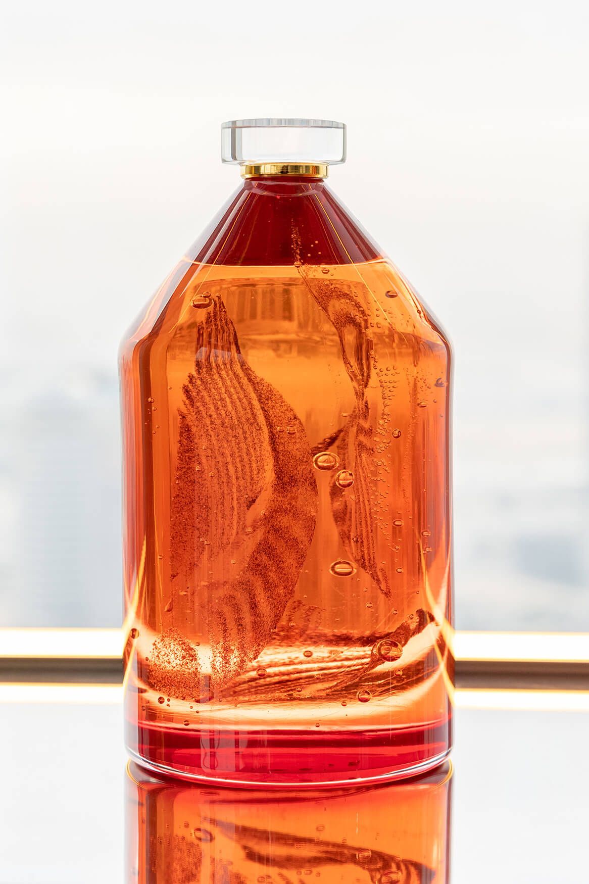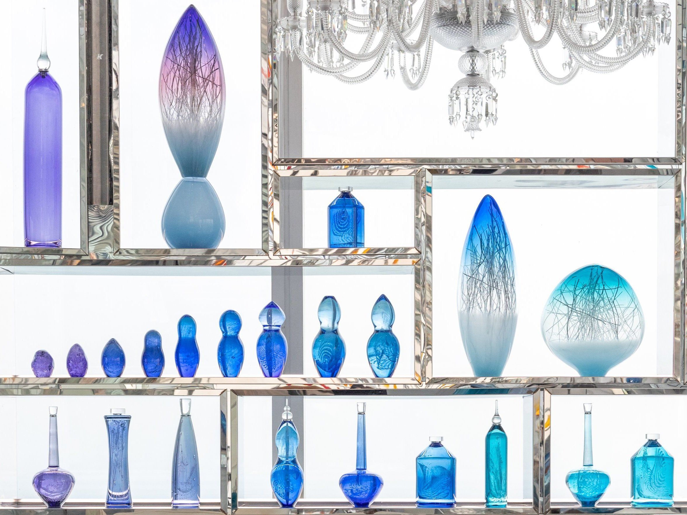Crafted into solid glass, the pieces cleverly simulate the illusion of a containing a local specifmen suspended in a richly coloured medium. Each piece that is adorned with a lid or stopper enhances the illusion of a liquid-filled vessel, evoking the sense of an archival collection made up of precious inclusions from Qatar.