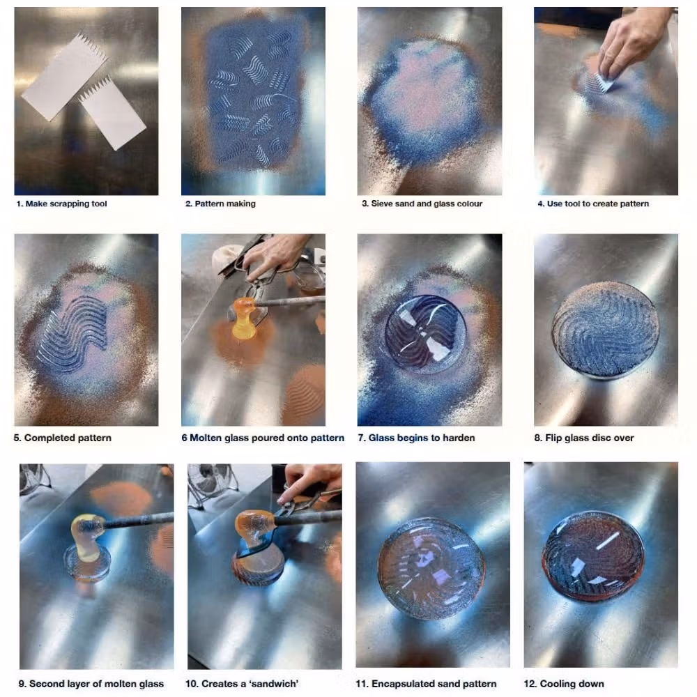 Delicately suspended within the glass, these fine trails of sand create bubbles and a sense of dynamic movement, imparting an effervescent sparkling effect. Follow the process below to see how the artists created these pattens and visual effects using sand.