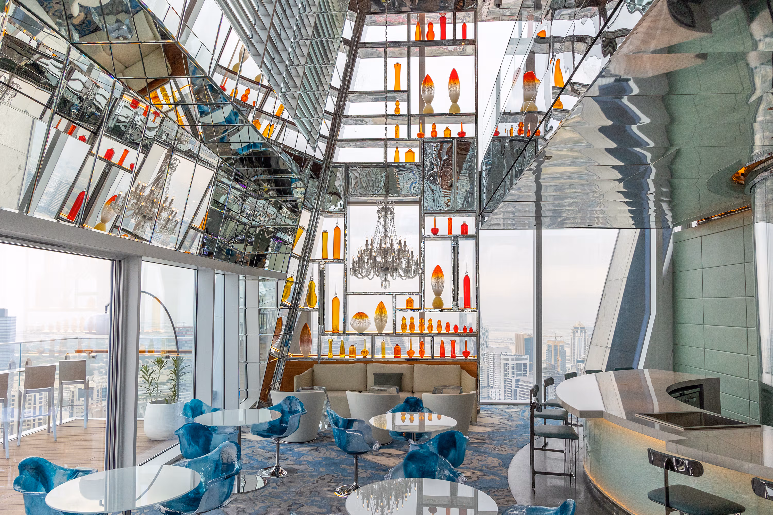 Infusing the Qatari landscape into the striking architectural design of the restaurant, each side showcases a mesmerizing gradient of tones in opposing hues: In the FIRE display earthy tones like bronze, ochre, and tan form the foundation, transitioning through ambers and oranges as the works climb to reach a crescendo of intense reds, reminiscent of the blazing desert sun. Conversely, the ICE display presents a spectrum of cool tones, beginning from aquamarines to azure and violets, evoking the tranquil depths of the ocean.