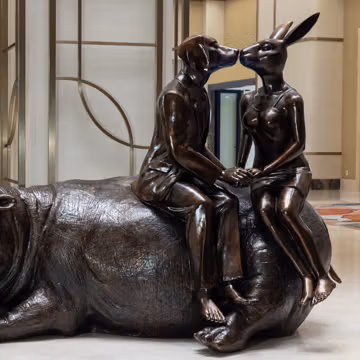 Photographic artist and graphic designer Marlies Plank was commissioned by ArtLink to design three pieces for the hotel, each united through a dreamlike energy of floating animals. Taking center stage is Plank’s nine-piece paneled installation of floating elephants and bubbles in the clouds, reminiscent of a circus performance determined to whisk guests into a different universe. The Vienna born artist superimposes colorful patterns and designs over digital photography to create profound works that explore humanistic ideas whilst conveying emotion through an overlap between real life and a dream state.