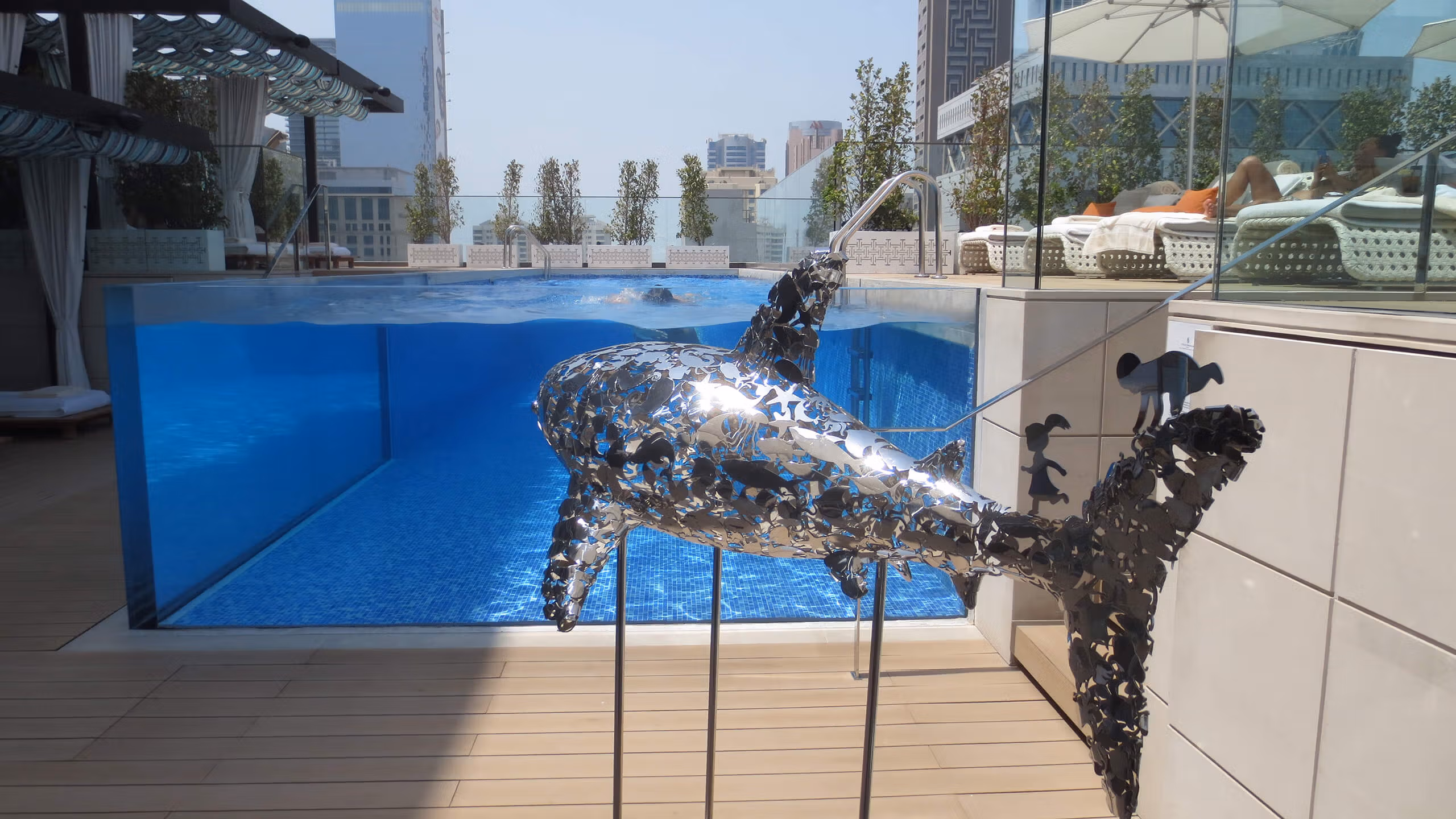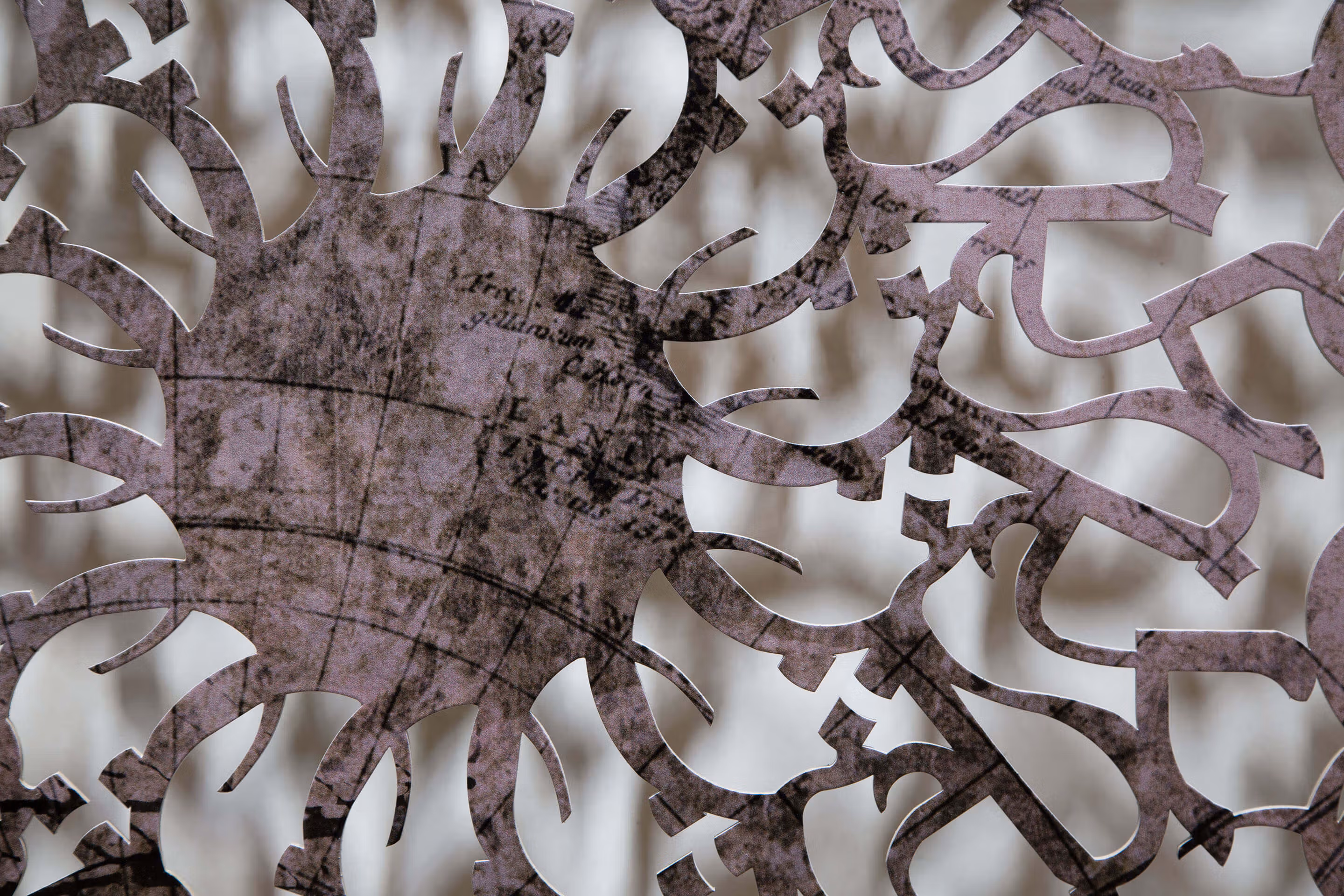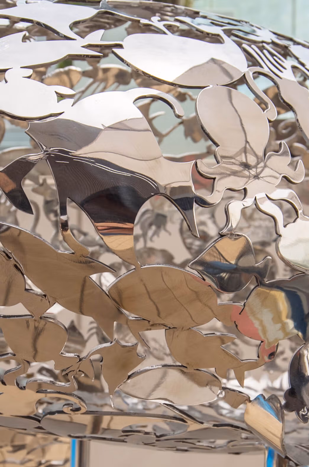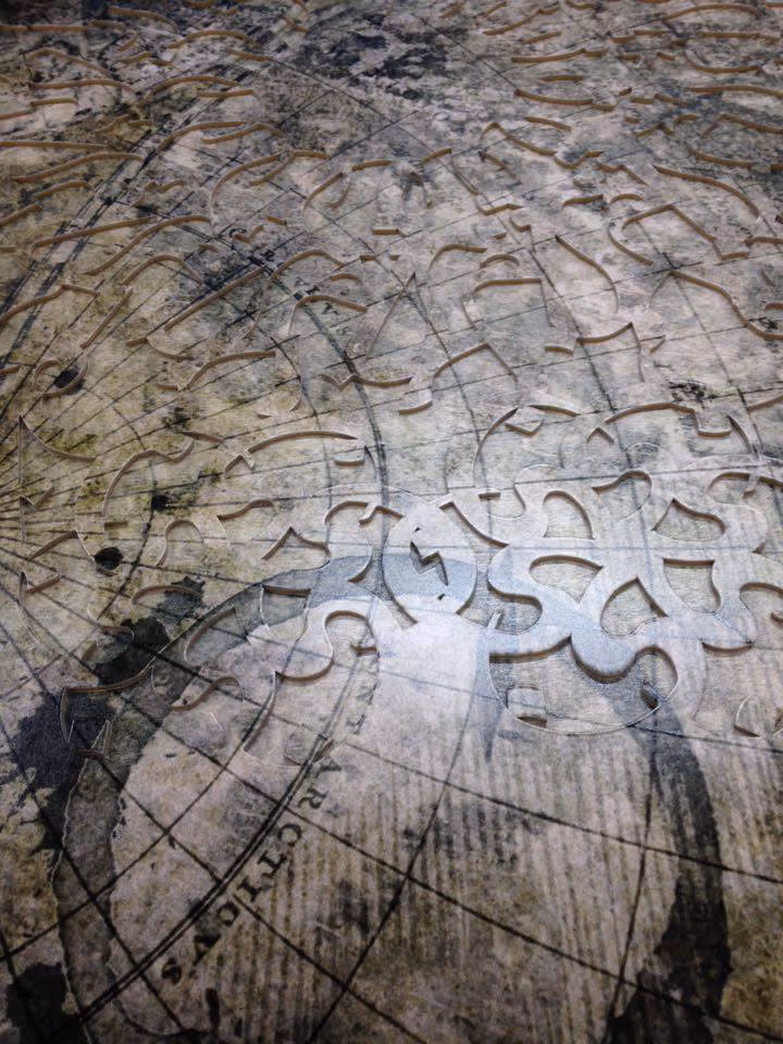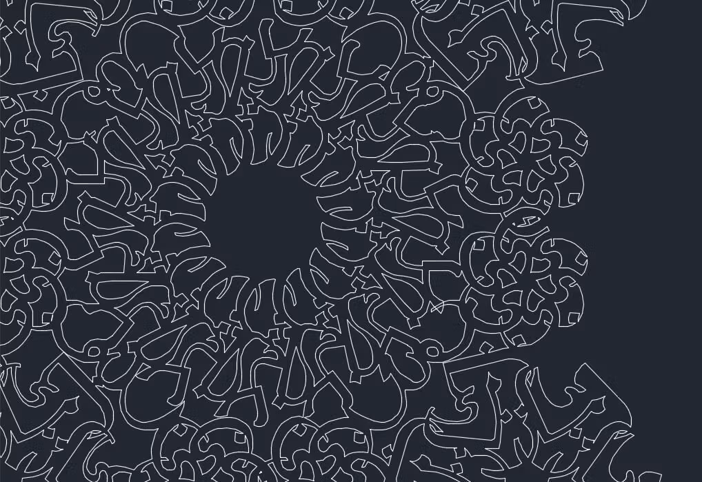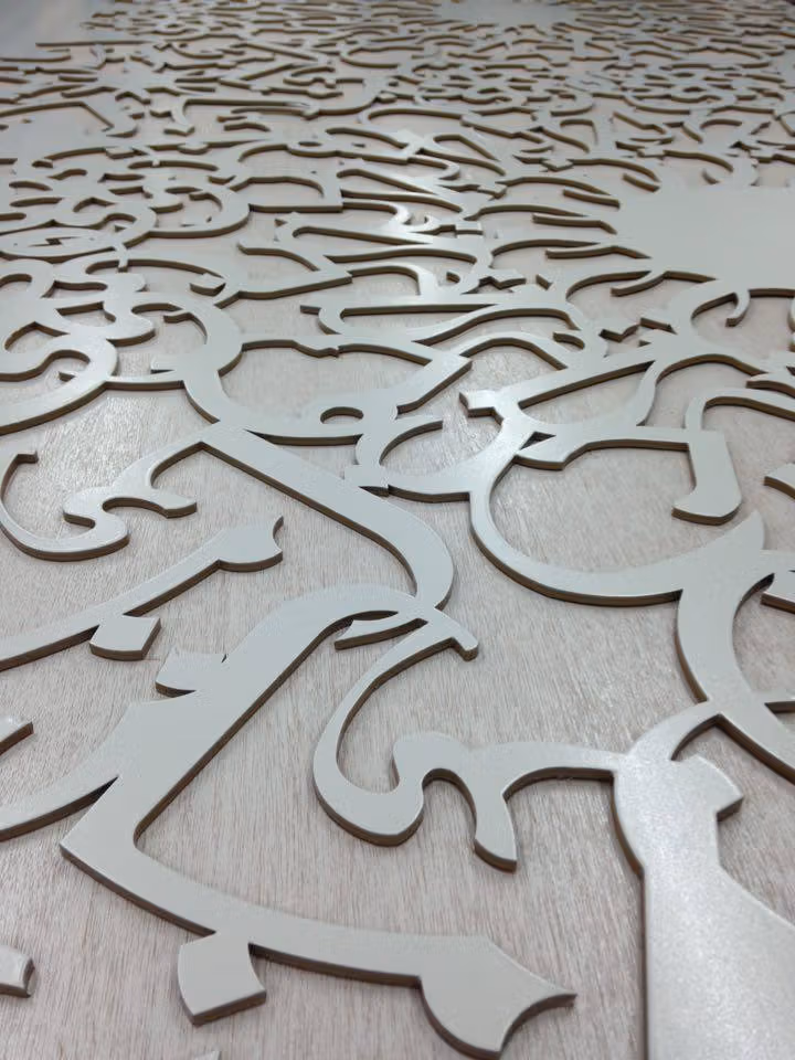 The Mashrabiya is a projecting oriel window that is enclosed by carved wood latticework and was a traditional element in Arabic architecture from the Middle Ages. Taking the Mashrabiya as a muse, ArtLink designed and produced a unique wall sculpture composed of Arabic letters from a local pearl diver’s sea shanty, which was then printed with images of 19th century maps from the Gulf region when it was a line of pearl-diving villages. The laser has replaced the hand of a craftsman, taking a contemporary approach to an extremely traditional design technique.