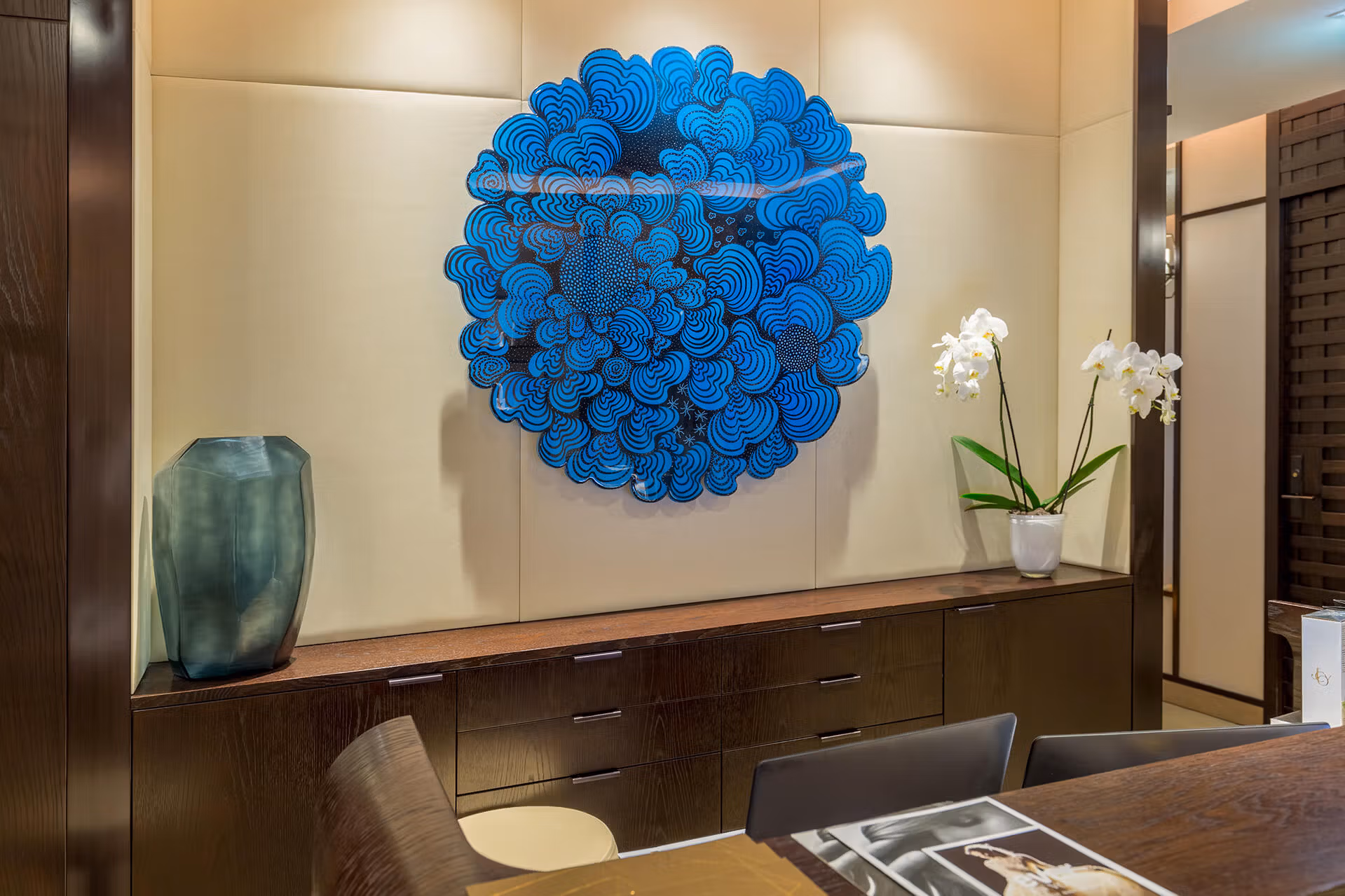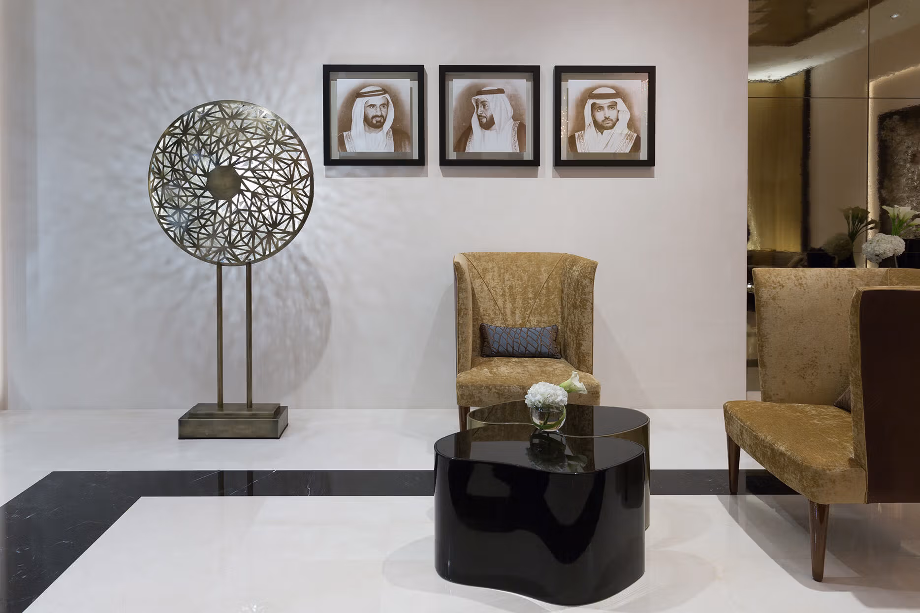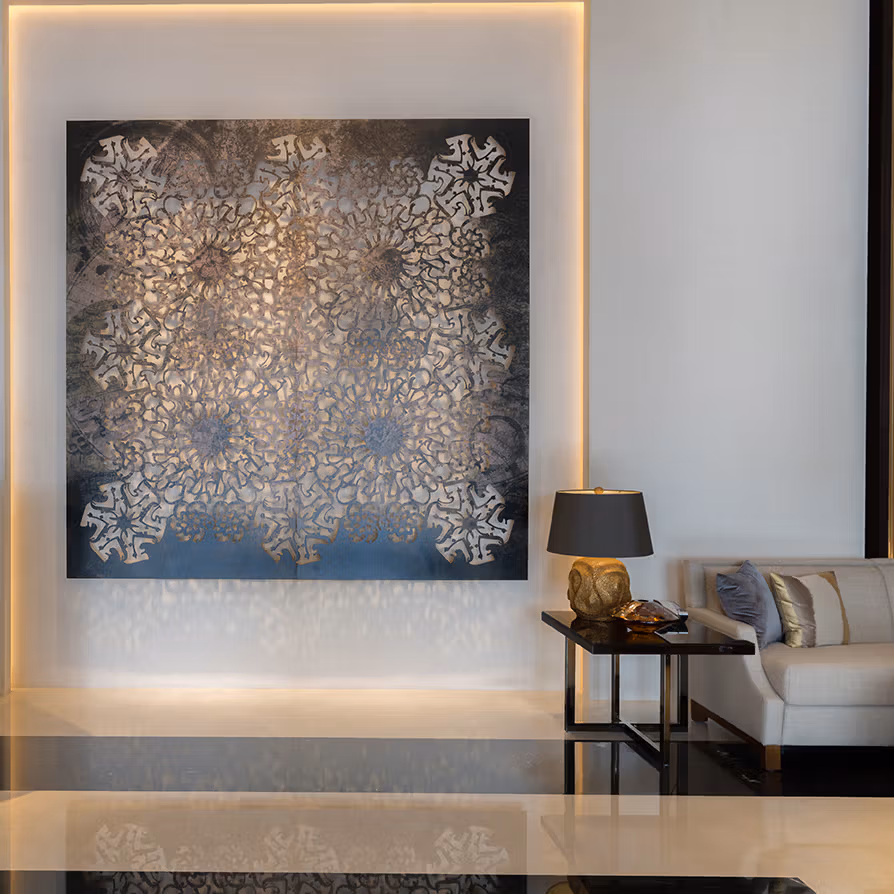 This collection is based on the interplay between Dubai’s historically significant local culture and its prominent global role. With a focus on intricate handwork and pattern, ArtLink created a compelling discourse by intertwining contemporary abstract works with works by local craftsmen. The diversity of mediums, including oil, ink, photography, reliefs and sculpture alongside the locally-produced works, reflect Dubai and its important role within its immediate region and the world at large.