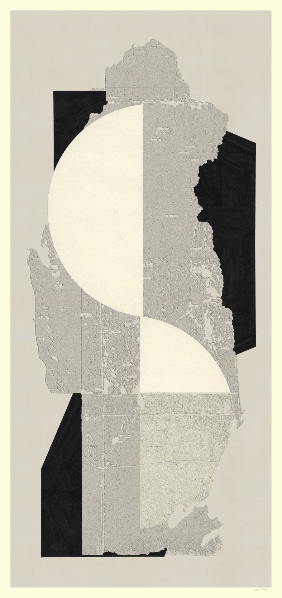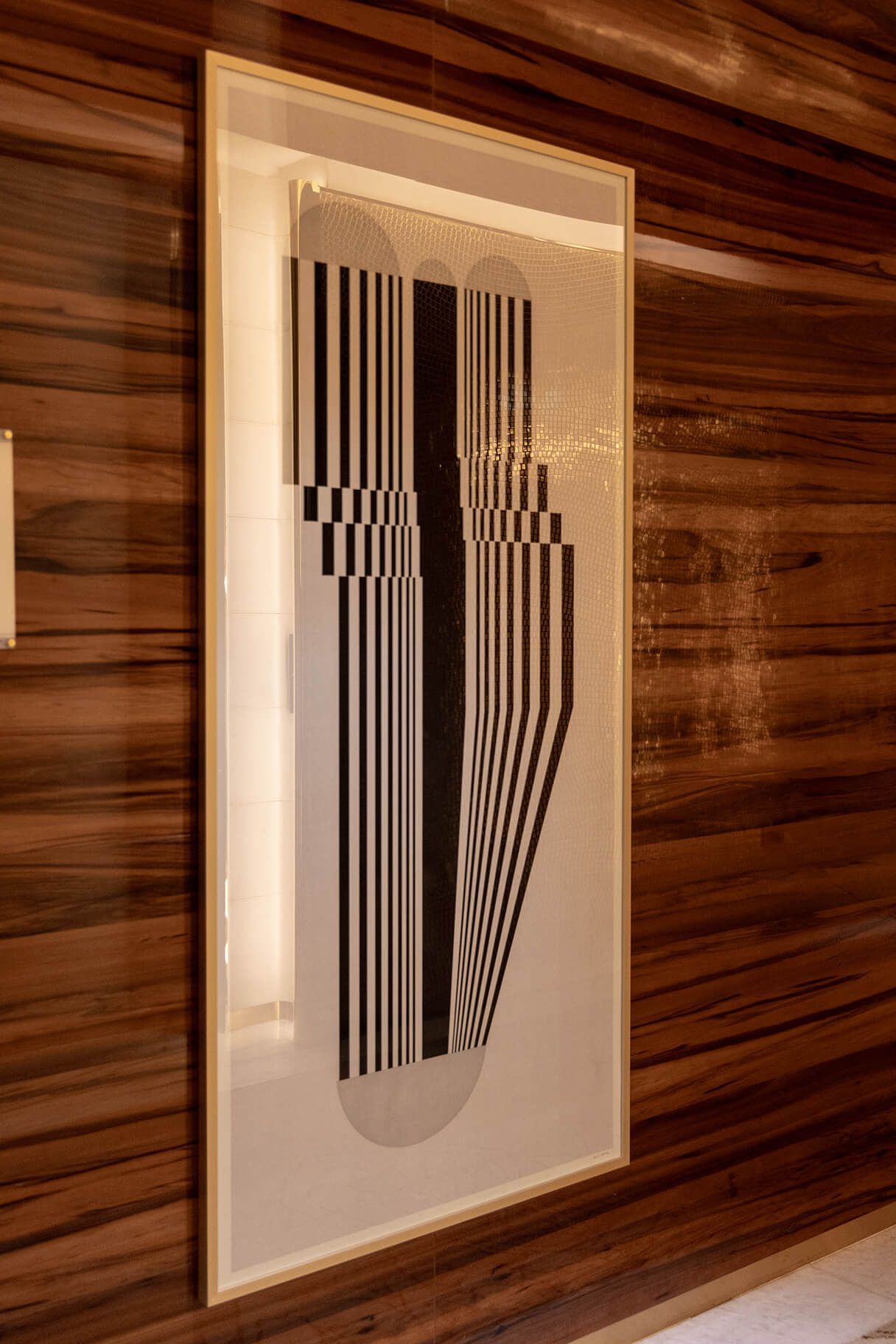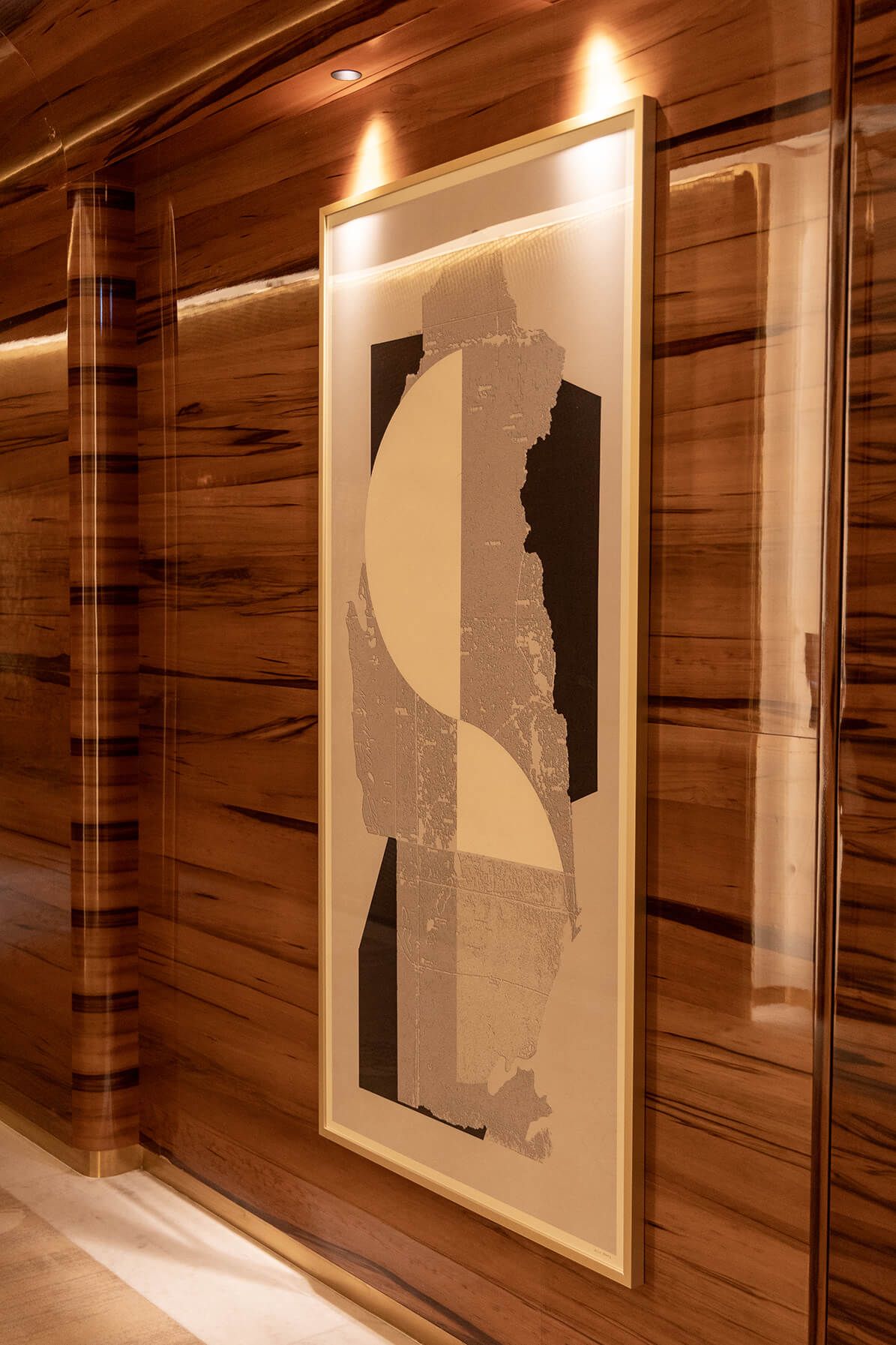 The series by Jesús Perea in the circulation corridors starts on the first floors with a more literal identification with Qatar and other cities of the world, becoming more abstract as one goes up: From the first to the 13th floor, the pieces feature different places worldwide where Katara has landmark projects. Using maps from these locations as a canvas, the artist then applied his signature abstract designs alluding to the specificities of the site, the contours of the buildings, their design and spirit. From the 14th floor to the top, the works are inspired by the views from the Katara Towers in Lusail and to the relation of the building to its surroundings – in land, water and sky. The combination of cartography and abstraction brings in the viewer to both enjoy the image and appreciate the site. Each floor is coded with a different tonality, moving from warm colors at the first 10 floors, cooler colors at the next 10 floors, and monochromatic works at the top floors. Overall, 109 unique works spread over 29 floors.
