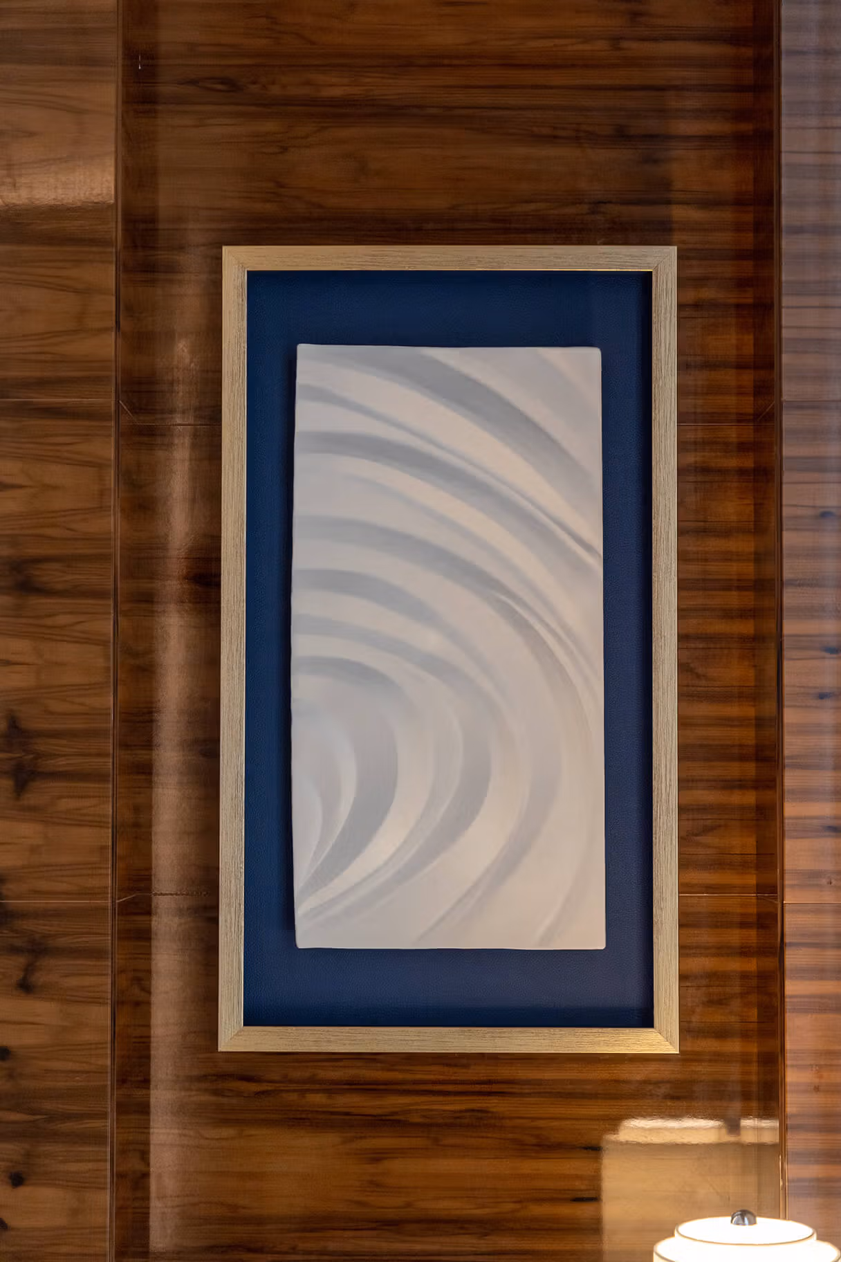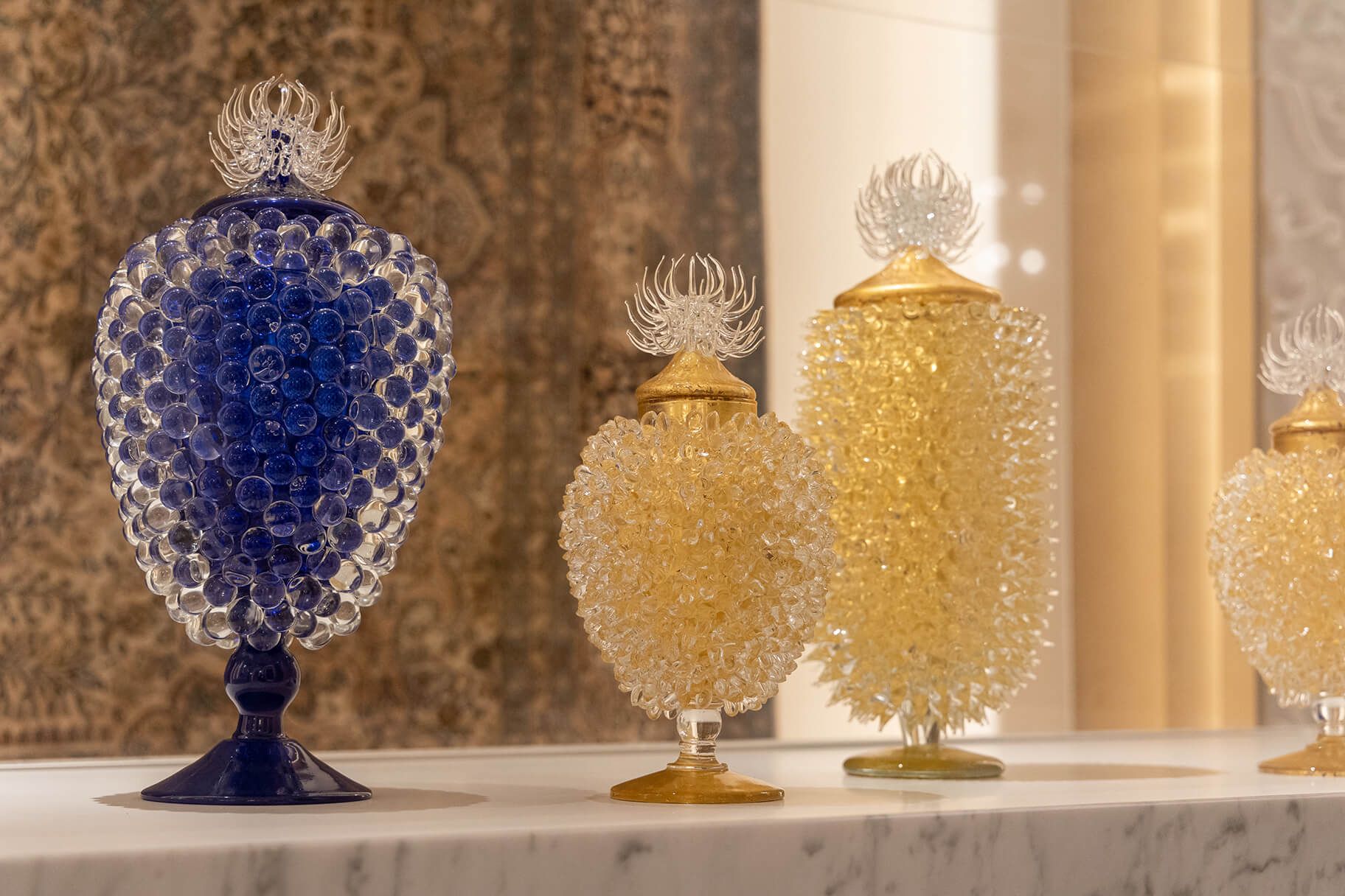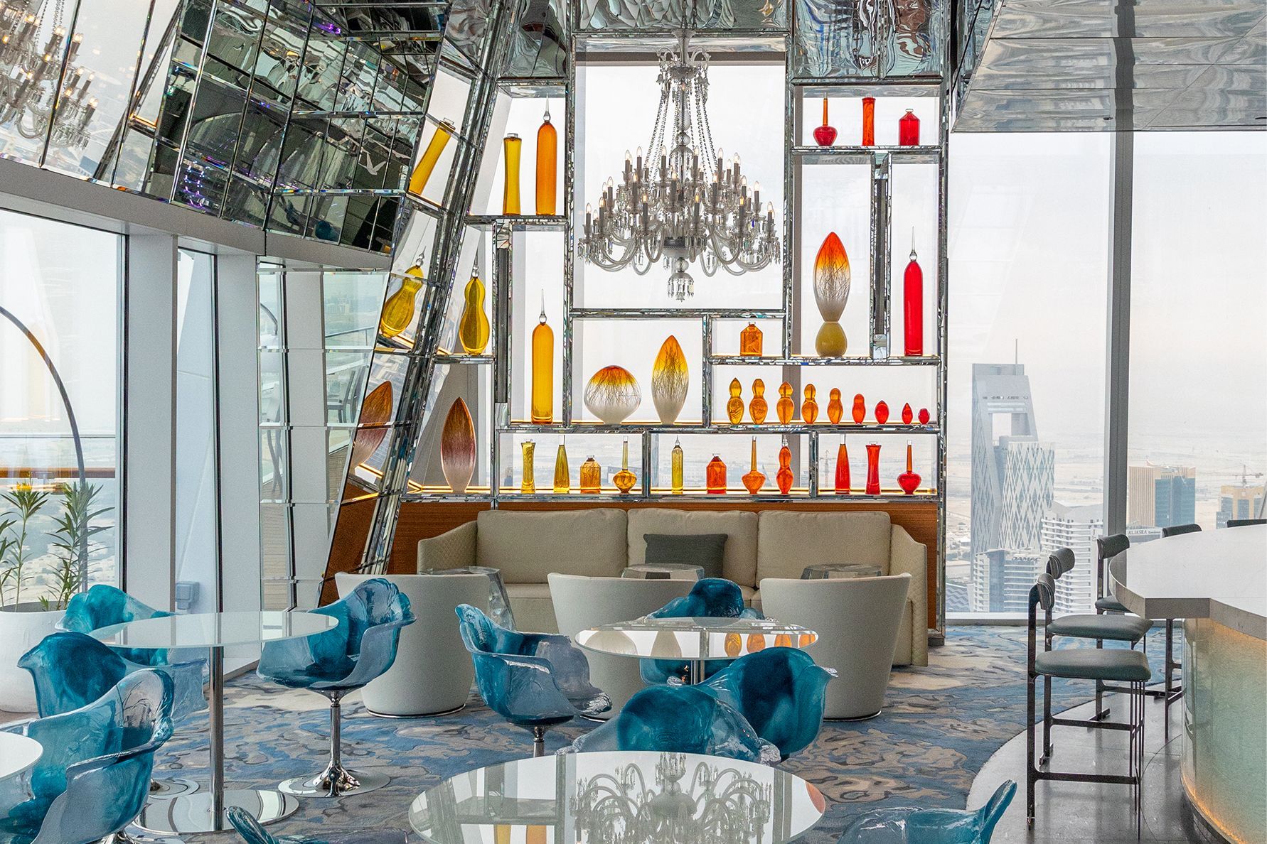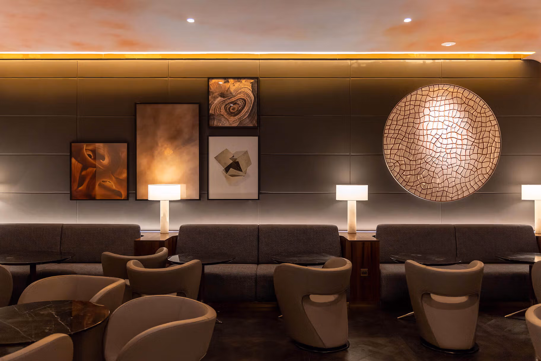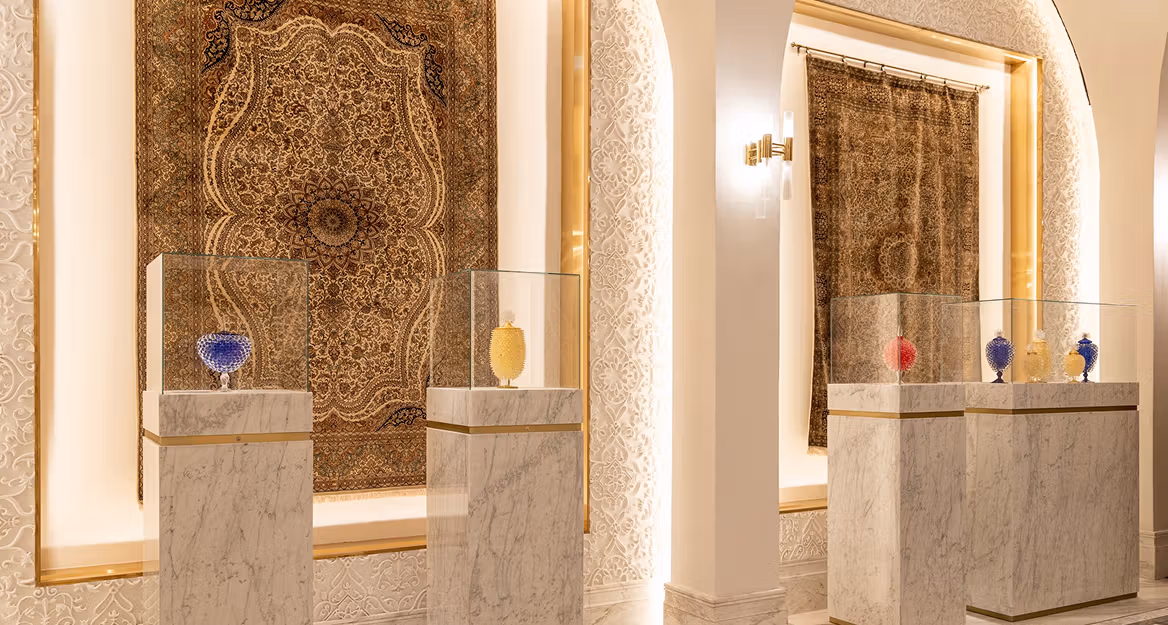 Qatar’s position at the crossroads of major trade routes has long brought diverse influences and materials to its shores, shaping a tradition of refined craftsmanship. The works in the Amiri Lounge draw inspiration from the art of jewelry-making. Glass artists James Lethbridge and Hanne Enemark were inspired by the exceptional pieces in the Al Thani Collection in Paris—assembled by the Qatari royal family—echoing a legacy of evolving artistic excellence.
