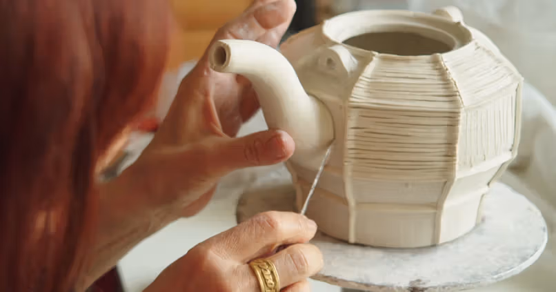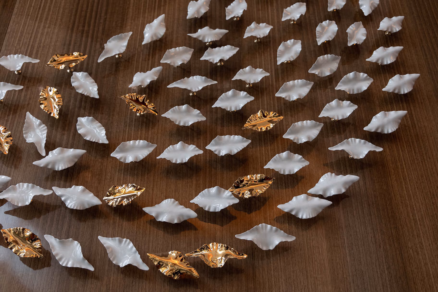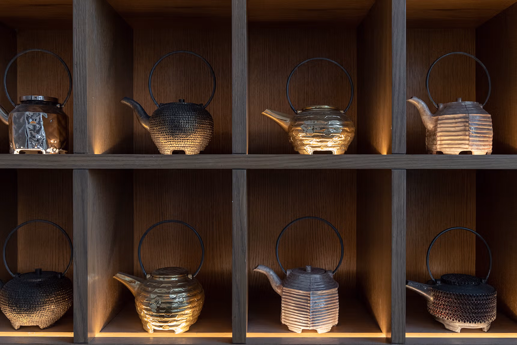 The wall of teapots pays tribute to the deep-rooted Qatari culture of hospitality. Master artisan Kati Jünger worked side by side with her village to produce these 64 teapots, reflective of the communal gatherings of Qatari people in winter—returning from the sea to share tea and stories on land.