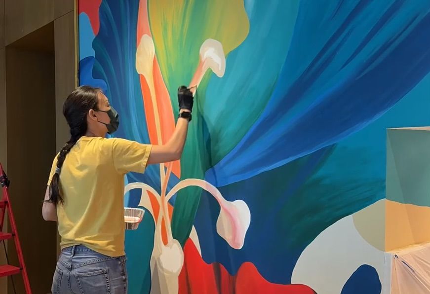 This site-specific mural by Malaysian artist Cassie Wong reinterprets the country’s national flower, the hibiscus, through a contemporary lens. Rather than depicting it in its traditional form, Wong deconstructed its elements into expressive shapes and dynamic compositions, symbolising strength, unity, and vibrancy. Influenced by the flowing lines of nature, the soft movement of fabric, and the intricate patterns of Malaysian batik, the mural evokes a sense of grace and cultural richness.