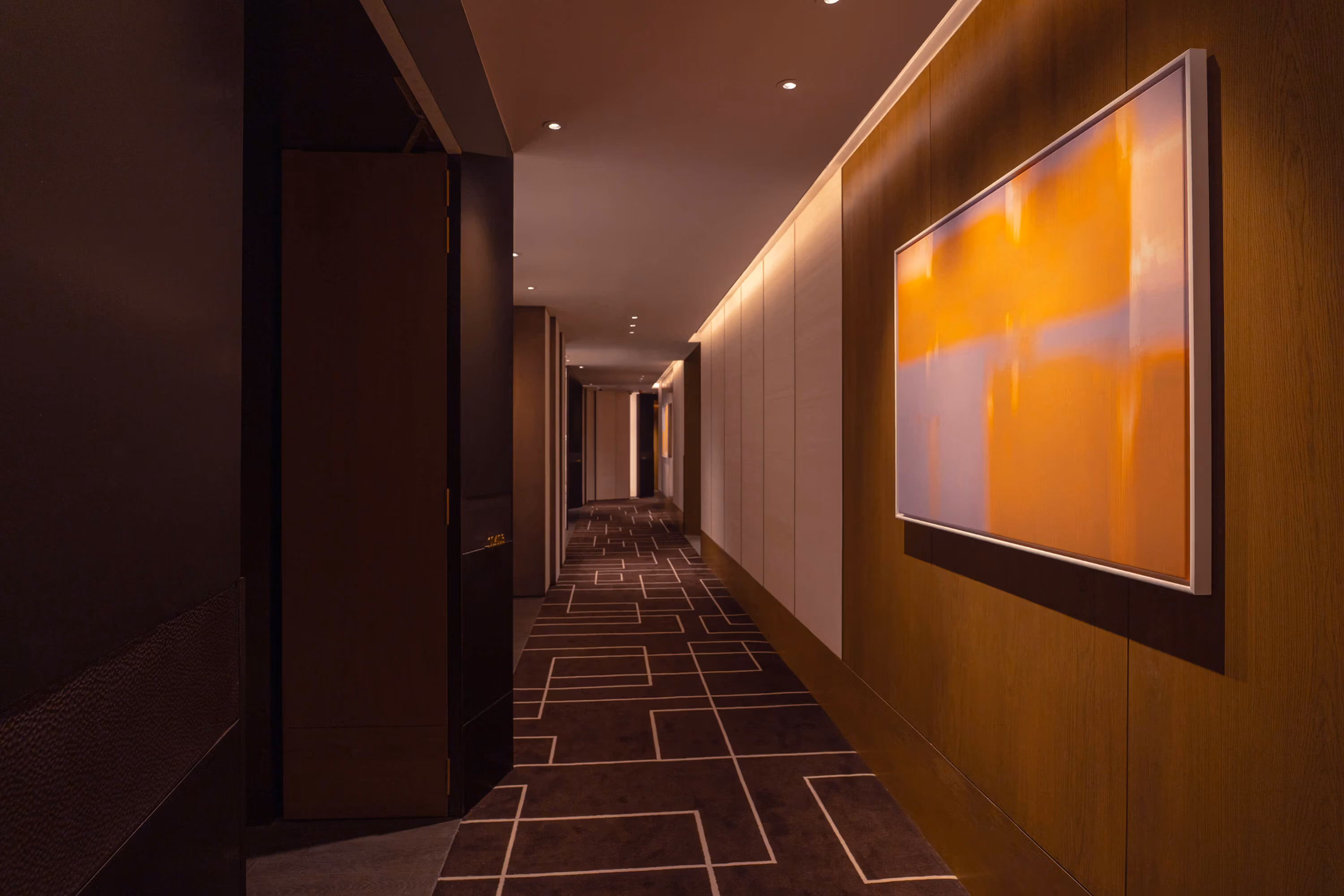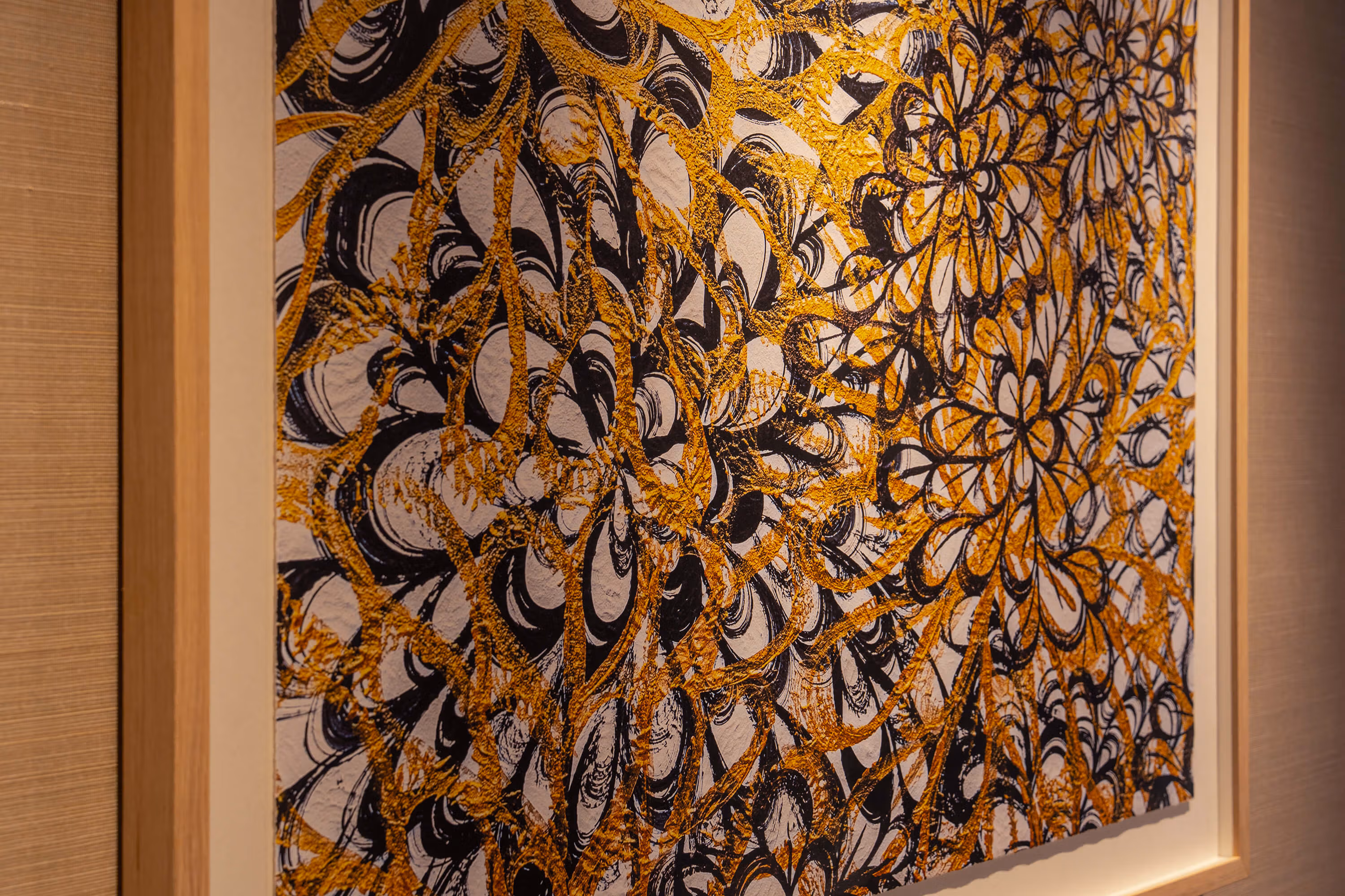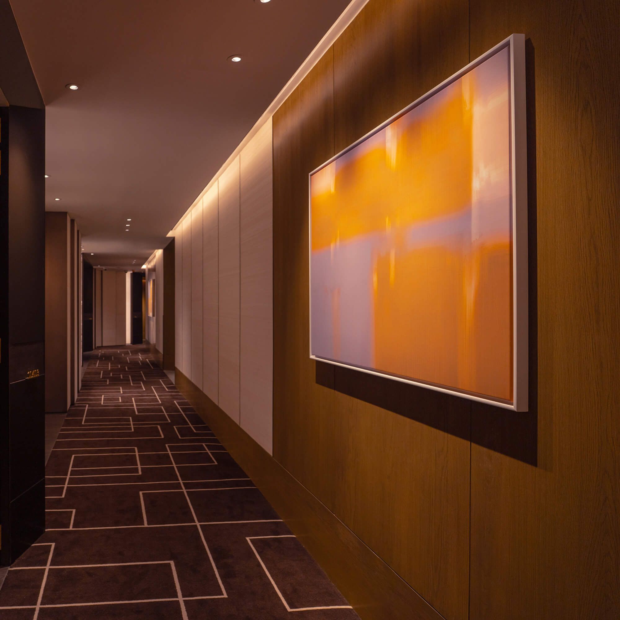 A series of works located throughout the corridors on each floor take inspiration from the songket weaving of Terengganu, Malaysia, with brushstrokes that mimic the interlacing of threads. Commissioned for the hotel, the pieces also echo the artistry of batik, celebrating Malaysia’s rich textile heritage.