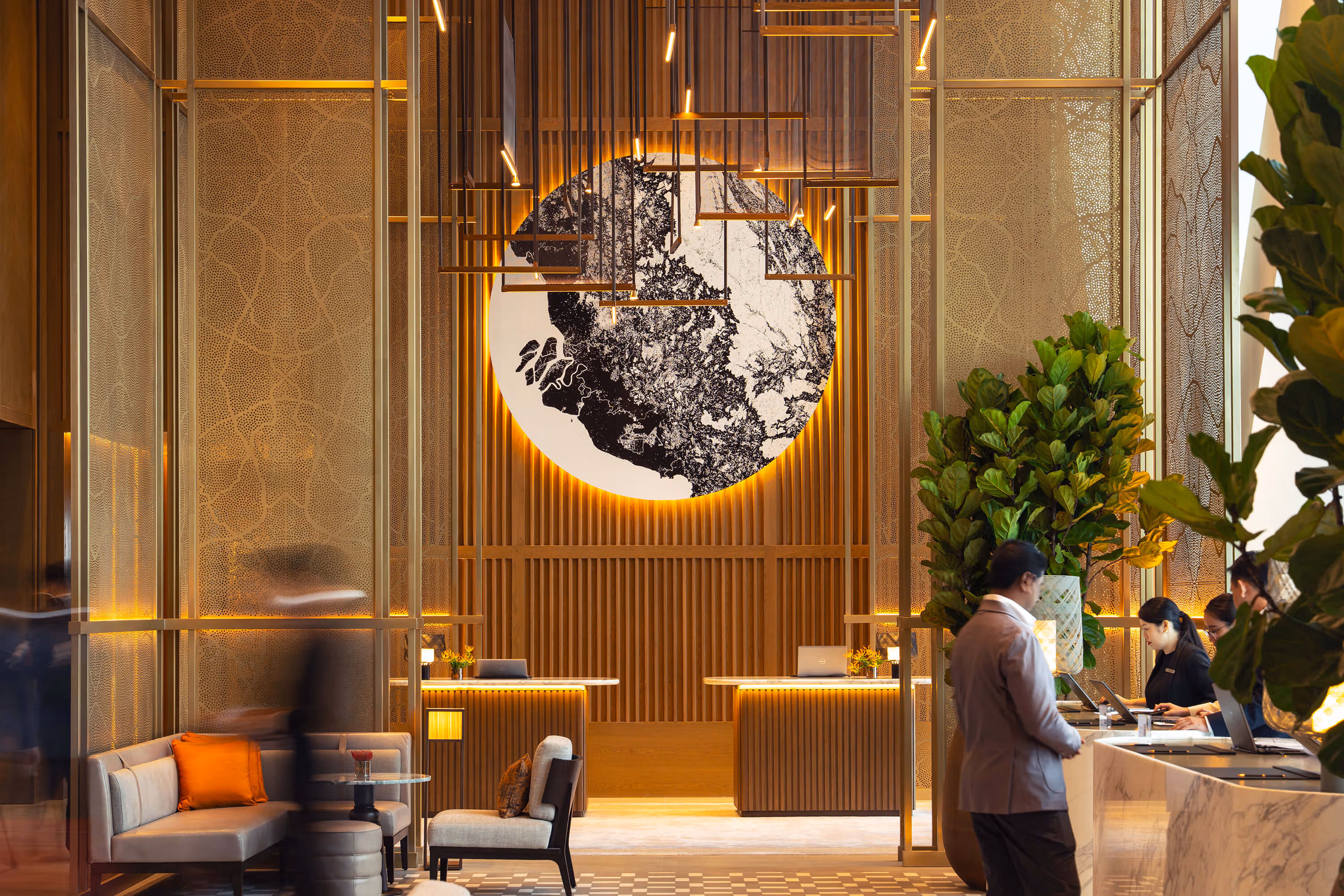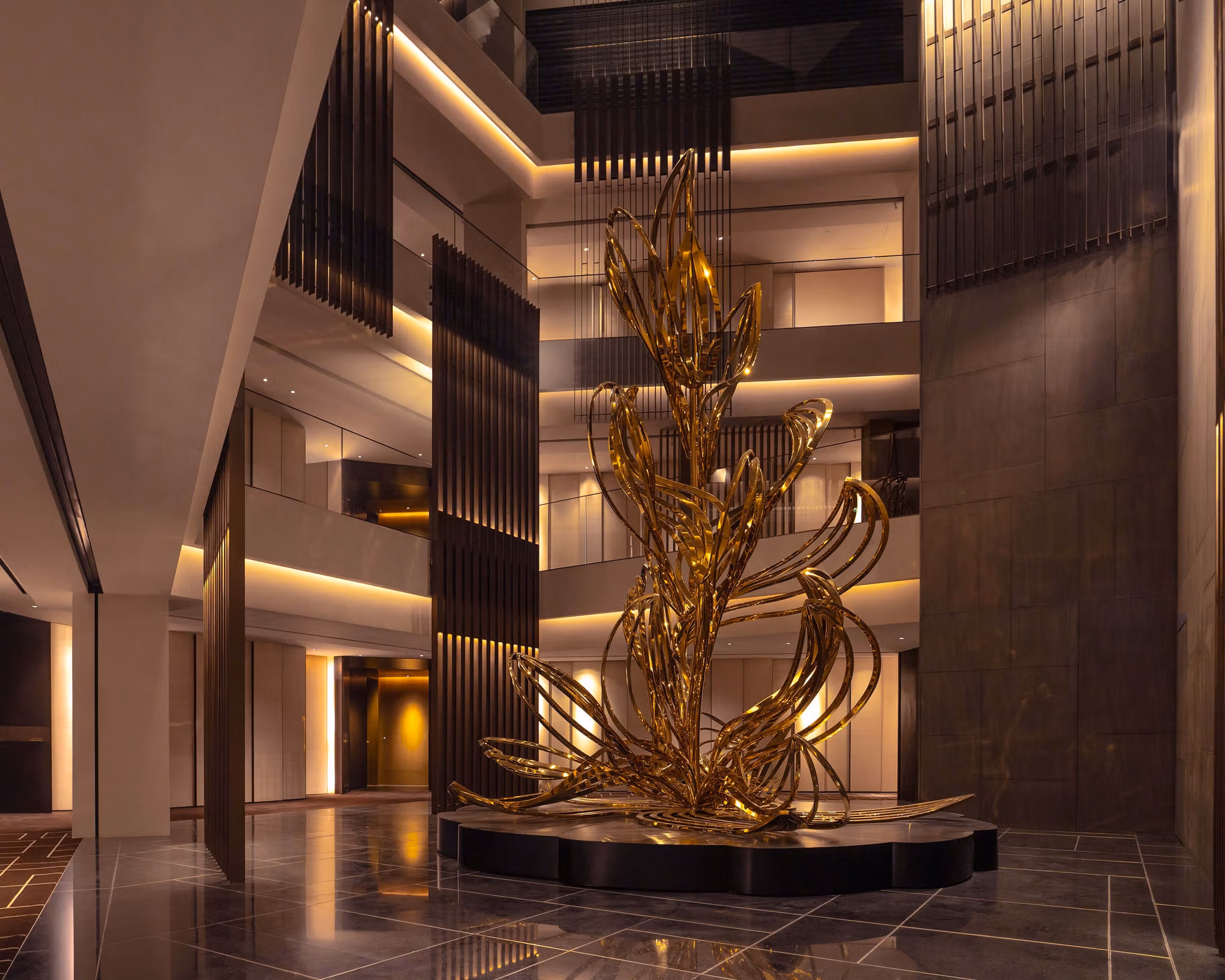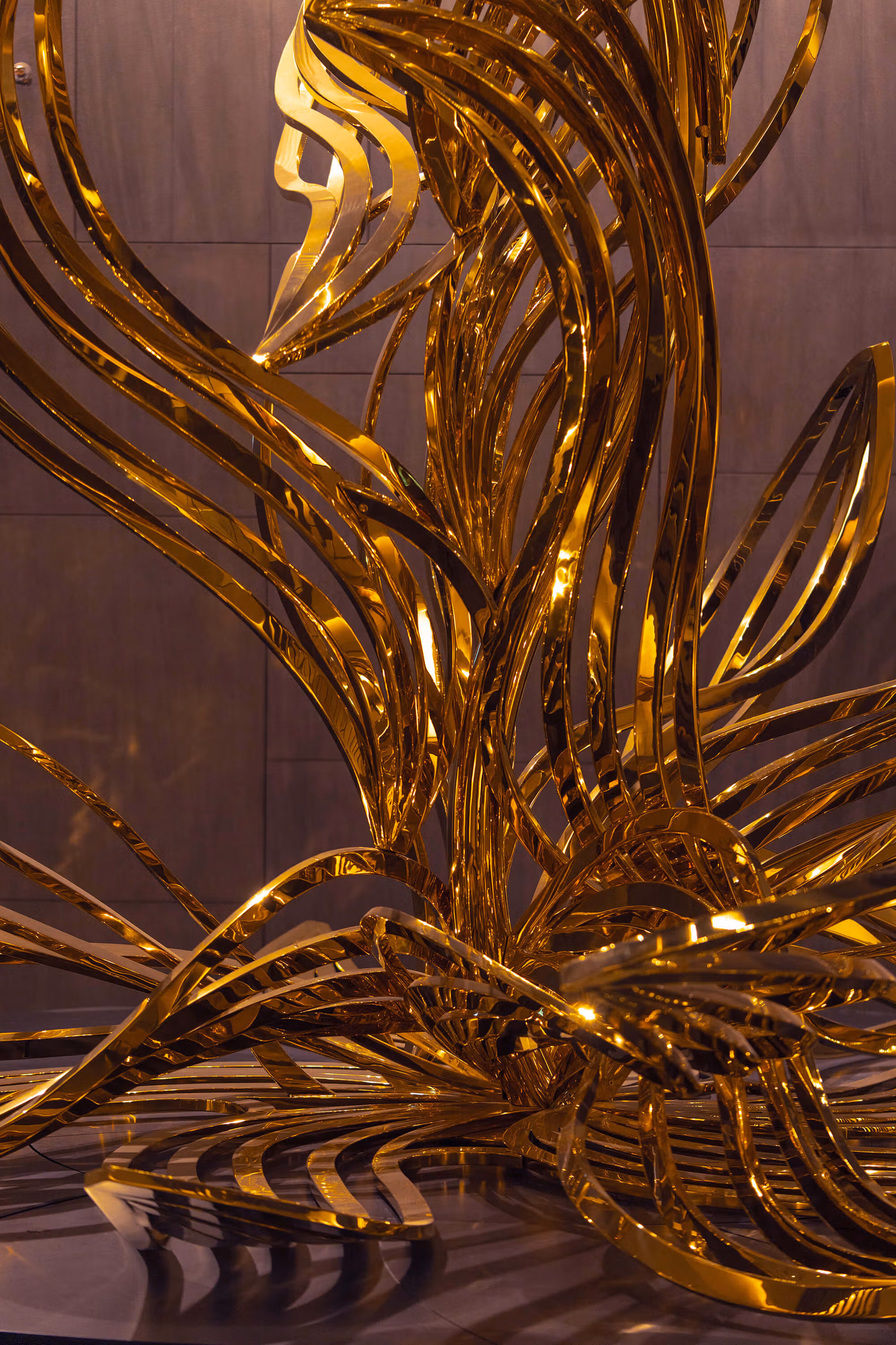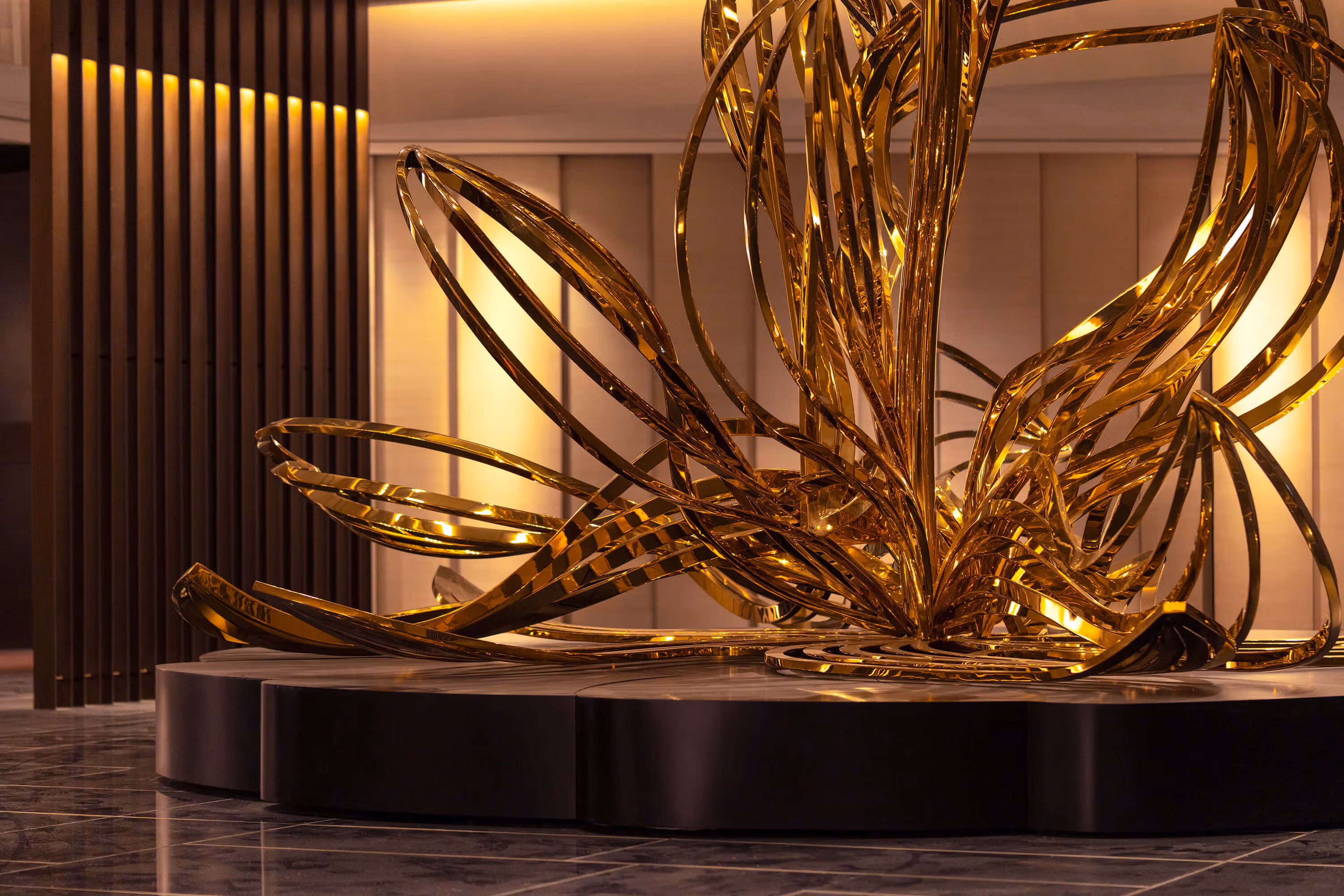 As guests step into the atrium, they are met by a breathtaking six meter tall sculpture by acclaimed Malaysian artist Abdul Multhalib Musa. Drawing inspiration from Malaysia’s lush flora and the motifs woven throughout its rich cultural heritage, Abdul transforms steel into flowing, organic forms that seem to move with light and air. A highlight of the collection, this special commission celebrates the local flora and the artistry of Malaysia, offering a striking first impression for every visitor. Bringing the piece to life was no small feat. Because of the hotel's location on the 102nd floor, the sculpture had to be transported in small sections, and assembled on-site by a skilled logistics team. Even the base was engineered in modular parts, with each connection point designed to blend seamlessly into the form so that every joint became an intentional part of the sculpture’s design.