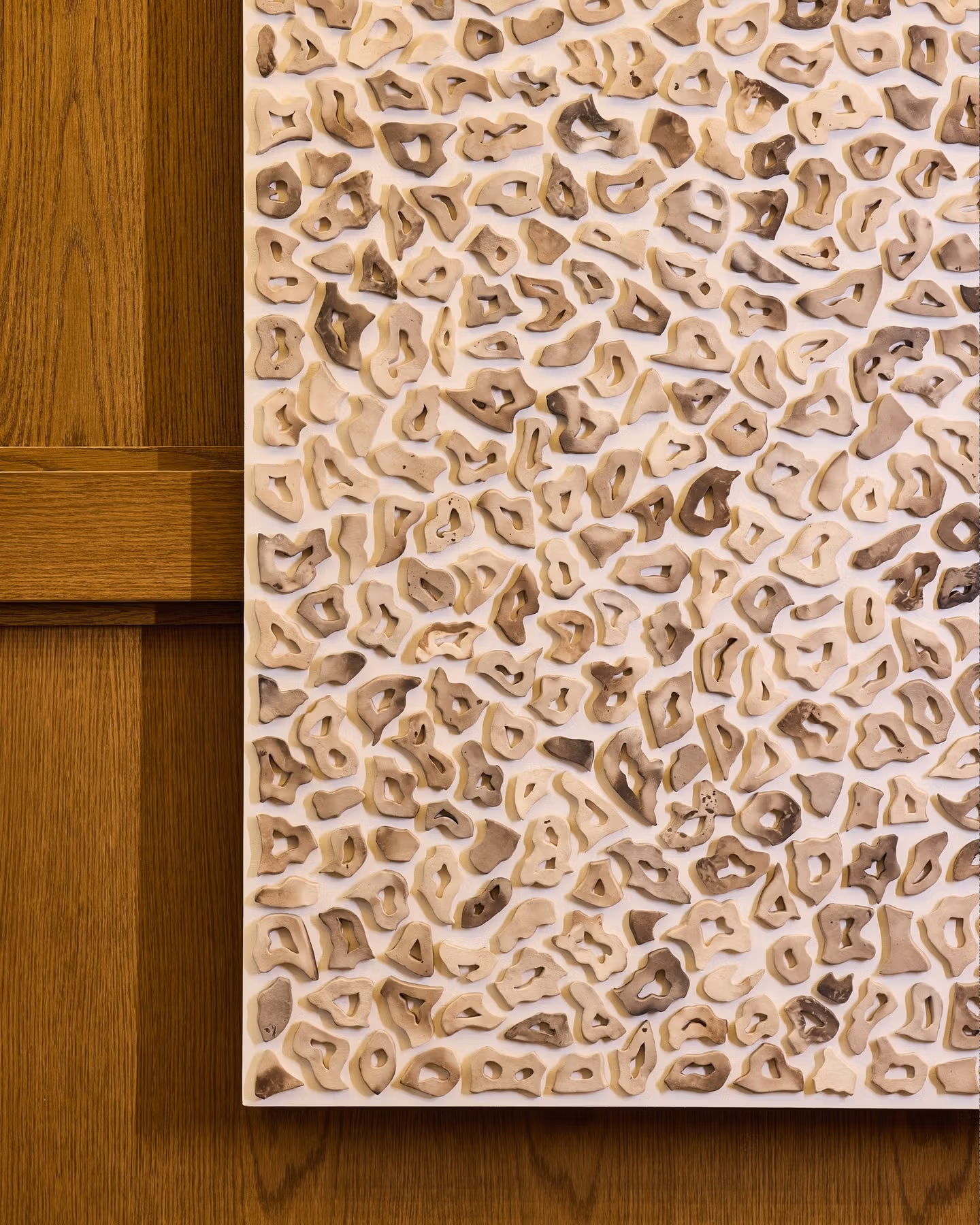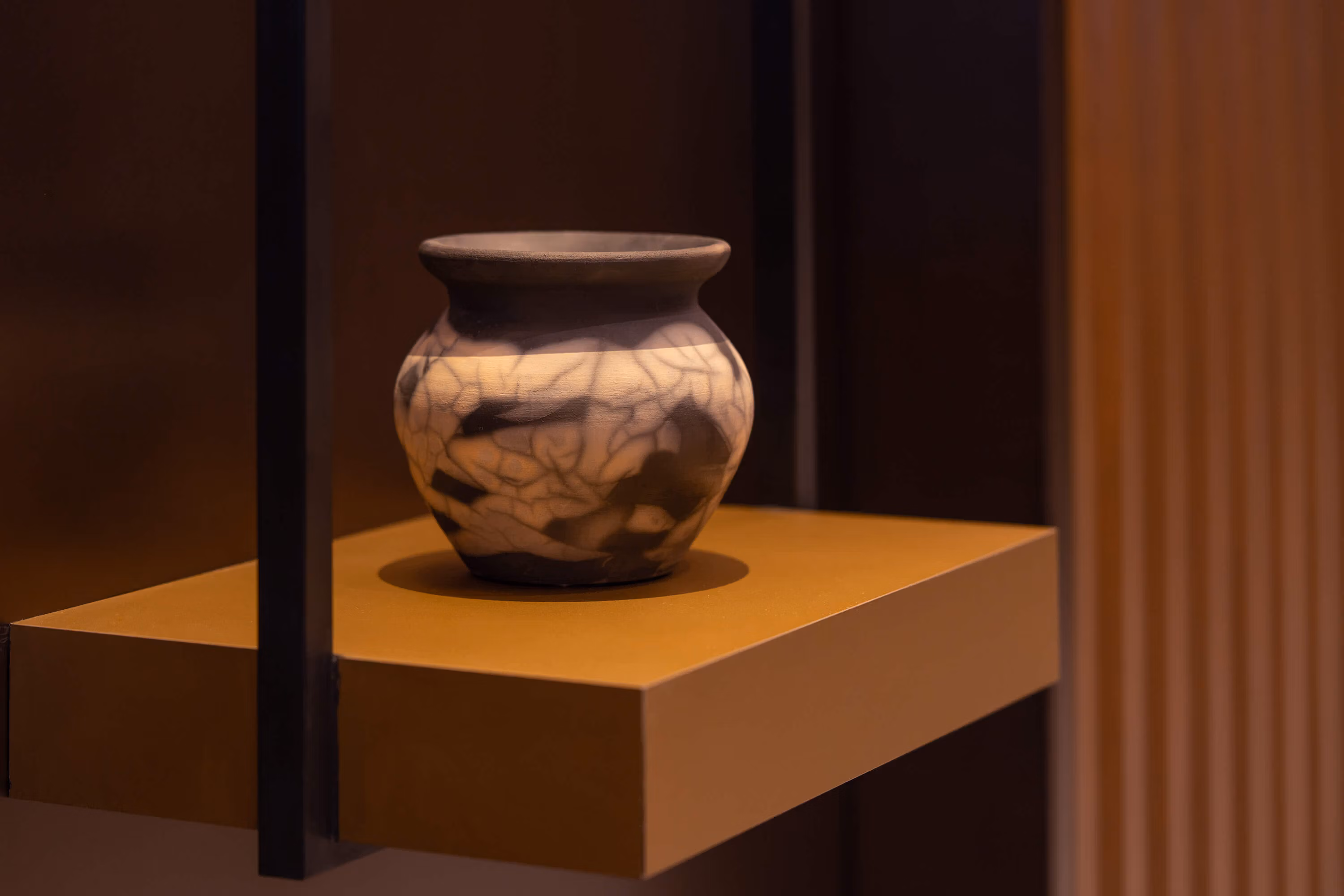 This commissioned installation by Malaysian artist Agnes Lau is composed of more than 5,500 hand-shaped pieces of smoke-red white clay. Each fragment carries the subtle marks of transformation, like the delicate traces of decay in nature. Individually, they tell their own unique story. Together, they form a flowing, layered narrative that honours change and the traces it leaves behind.