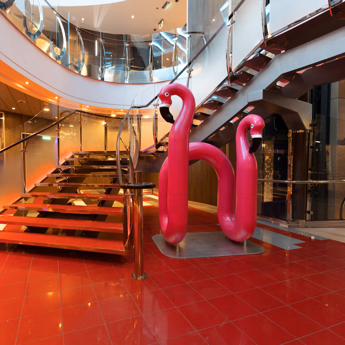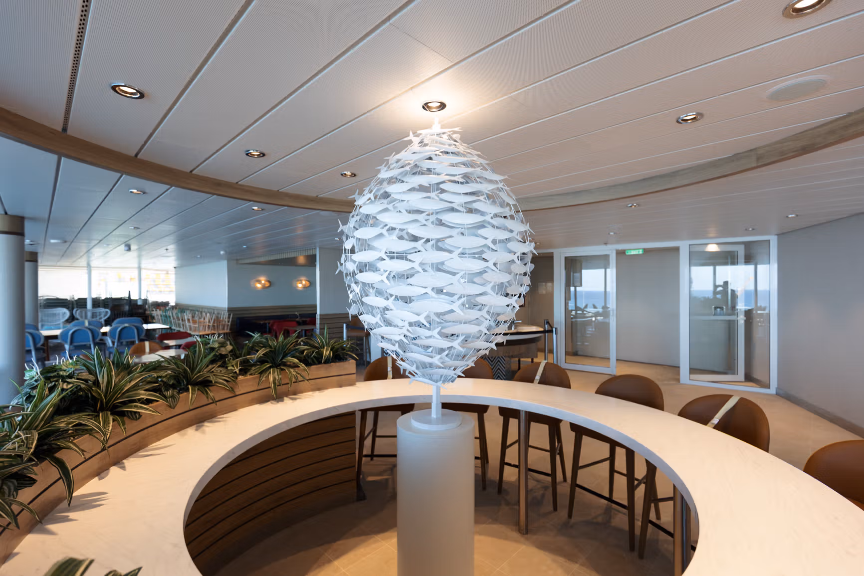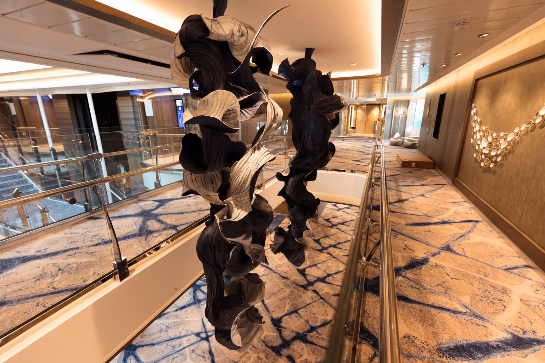 This playful and interactive work accompanies the guests as they venture from one activity to another. The impressive 2,200kg statement is floating in the most central space of the ship, radiant and mesmerizing in its blue chrome scales. Without a doubt one of the largest and most iconic works to be seen aboard a vessel.