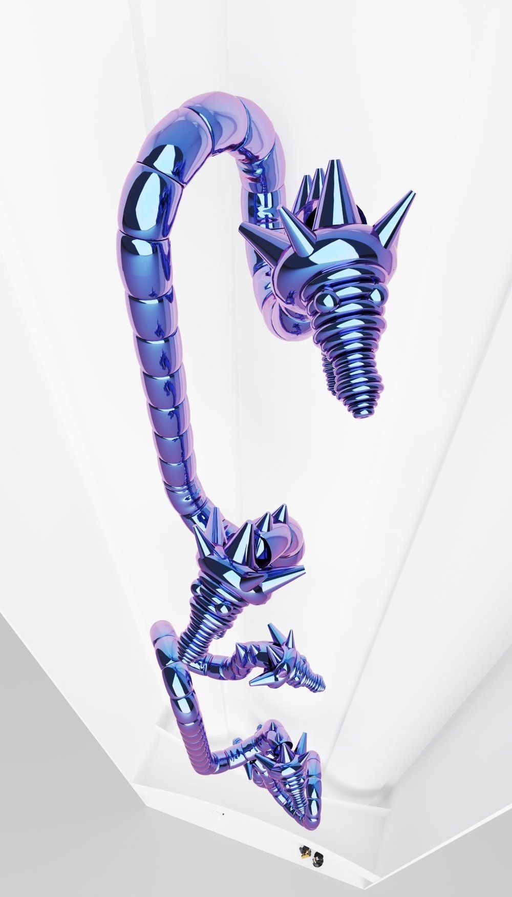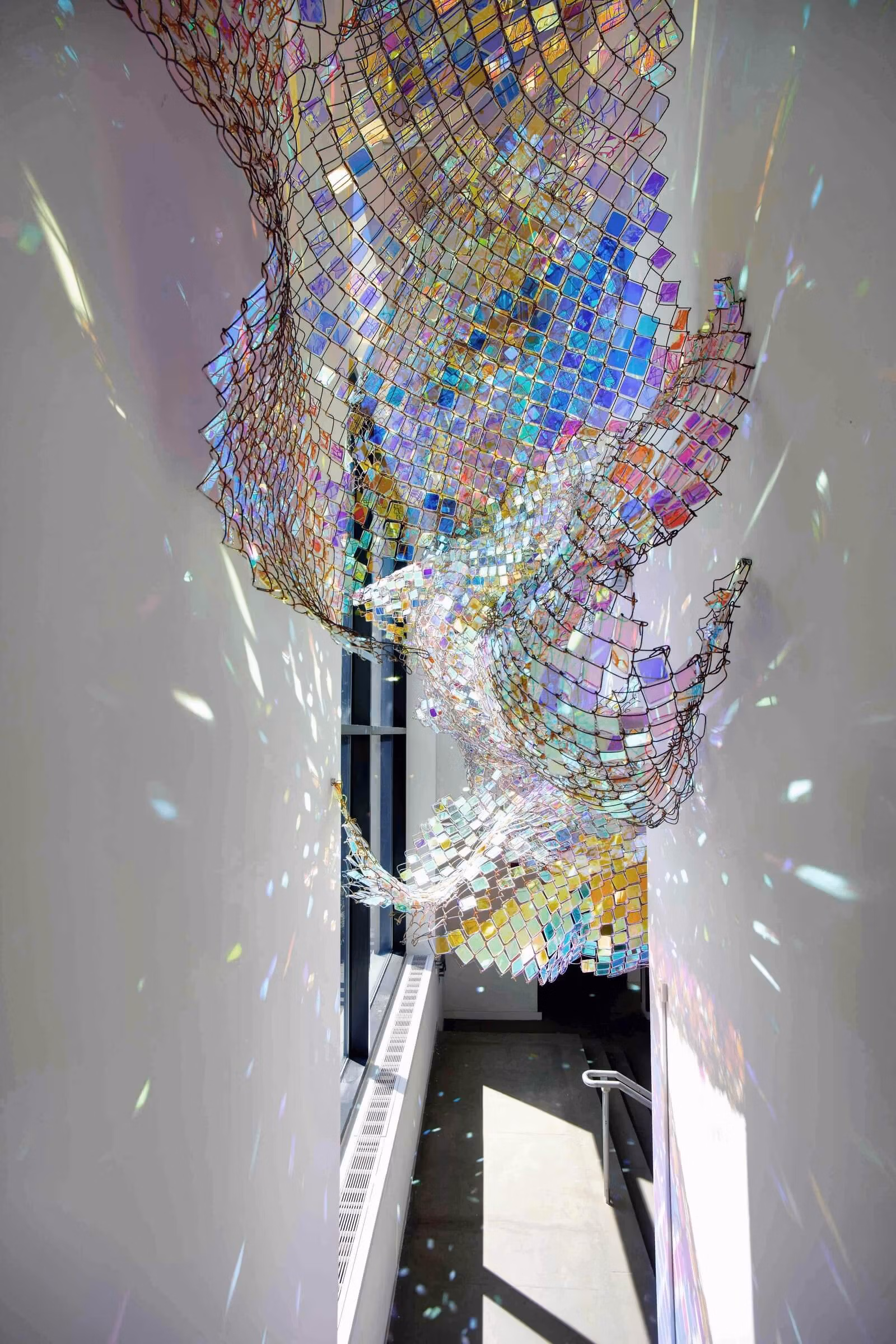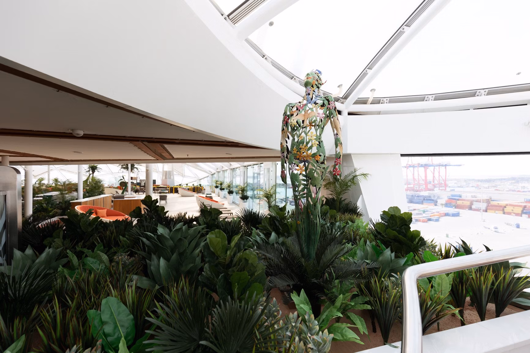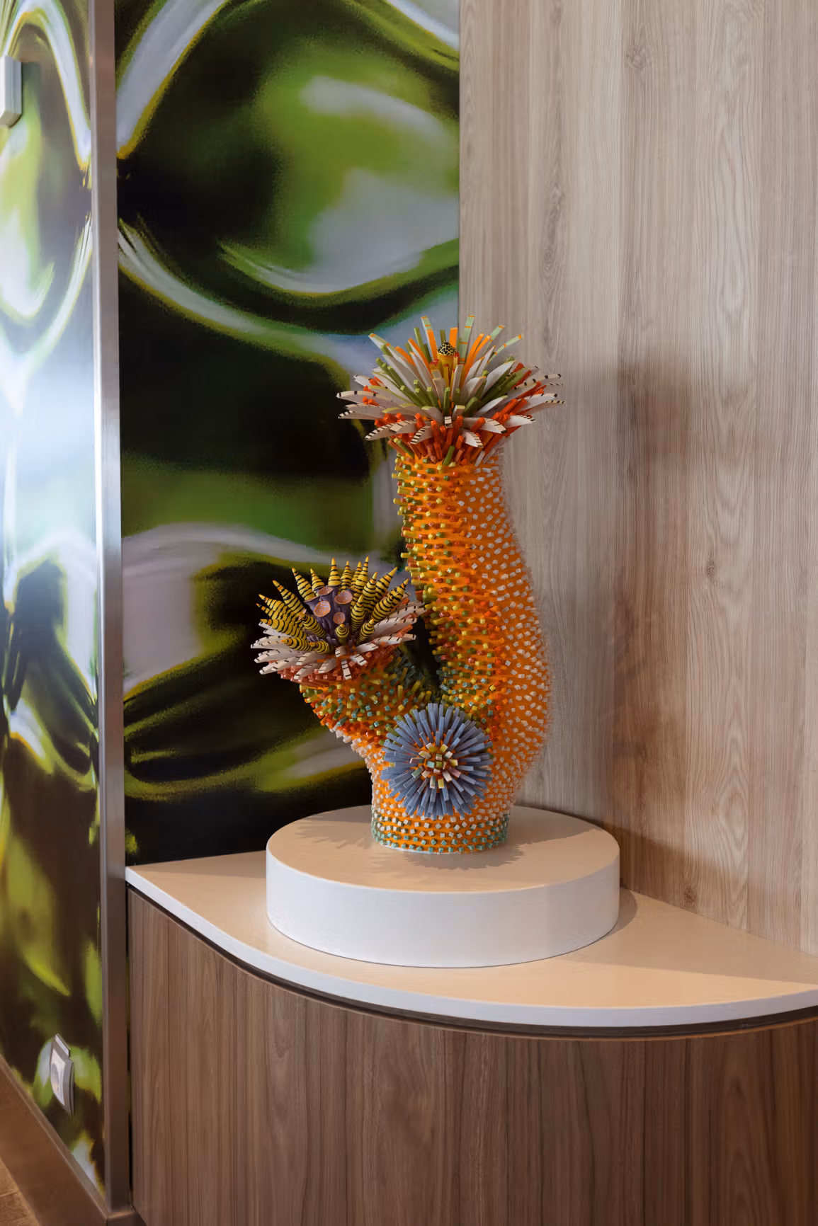 This playful and interactive work accompanies the guests as they venture from one activity to another. The impressive 2,200kg statement is floating in the most central space of the ship, radiant and mesmerizing in its blue chrome scales. Without a doubt one of the largest and most iconic works to be seen aboard a vessel.