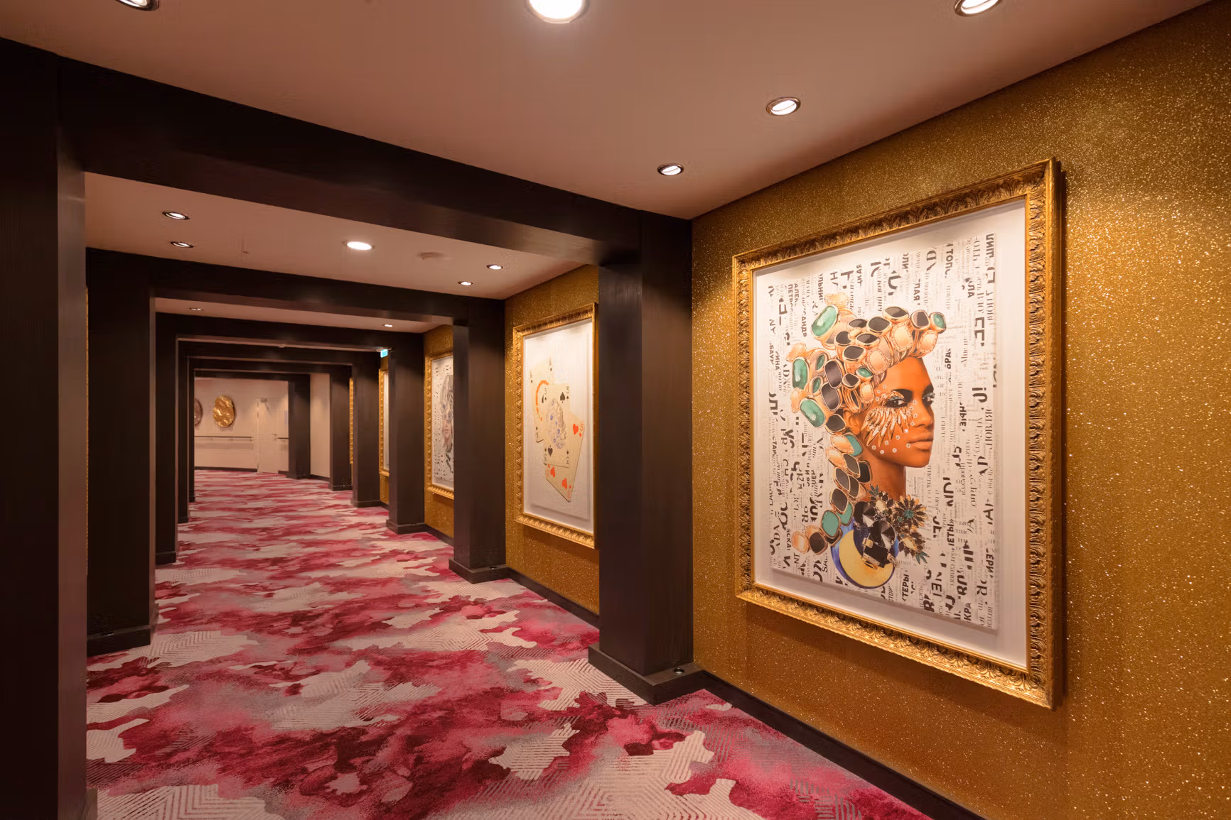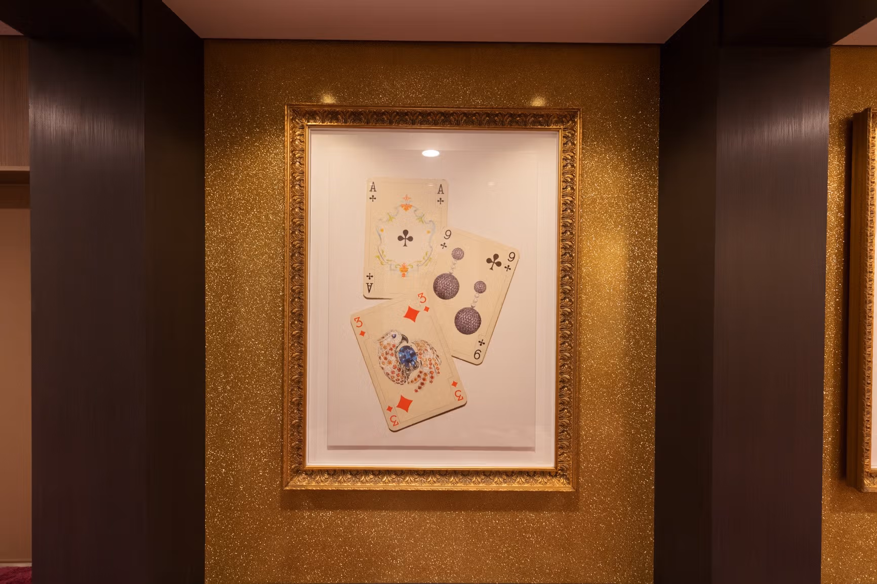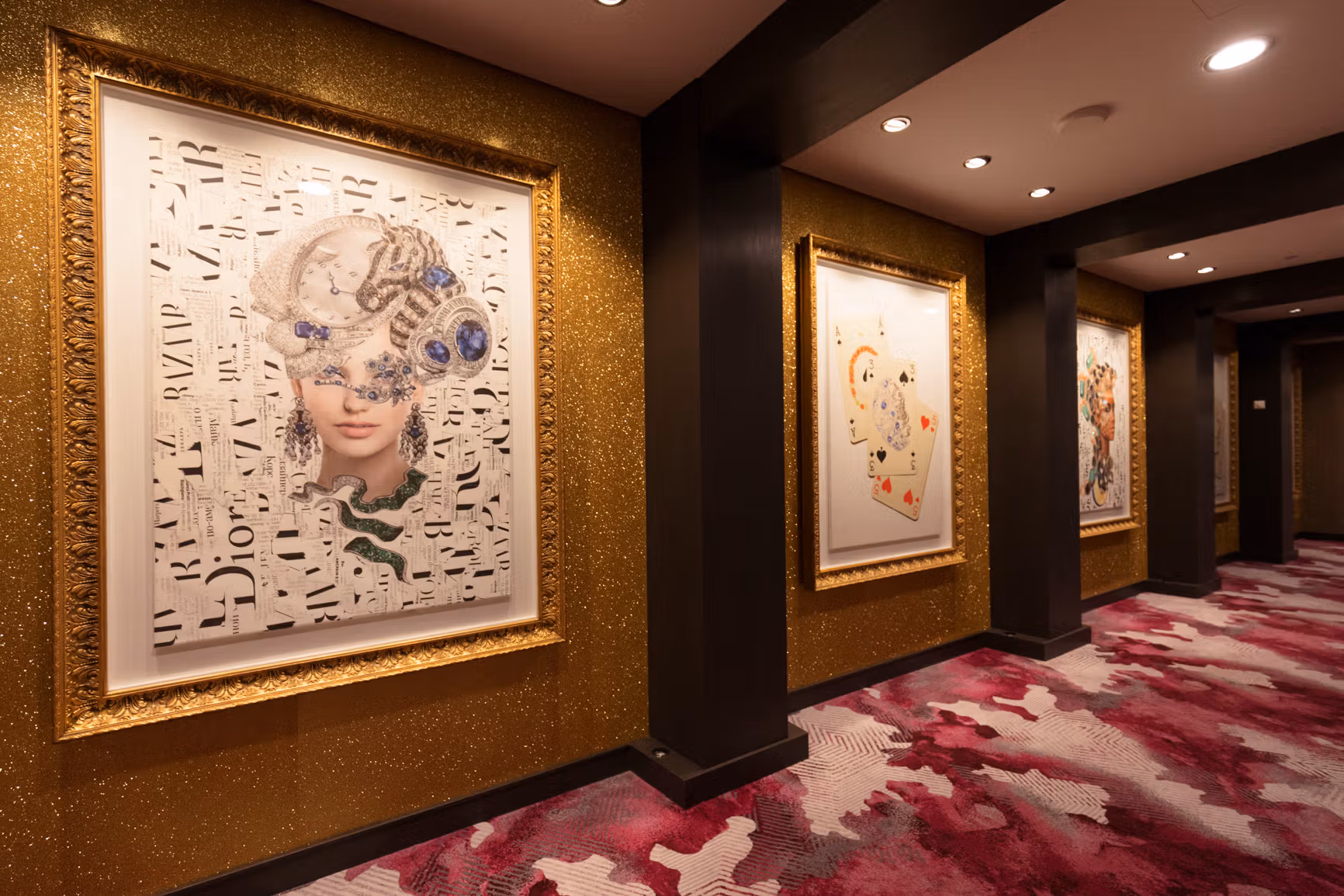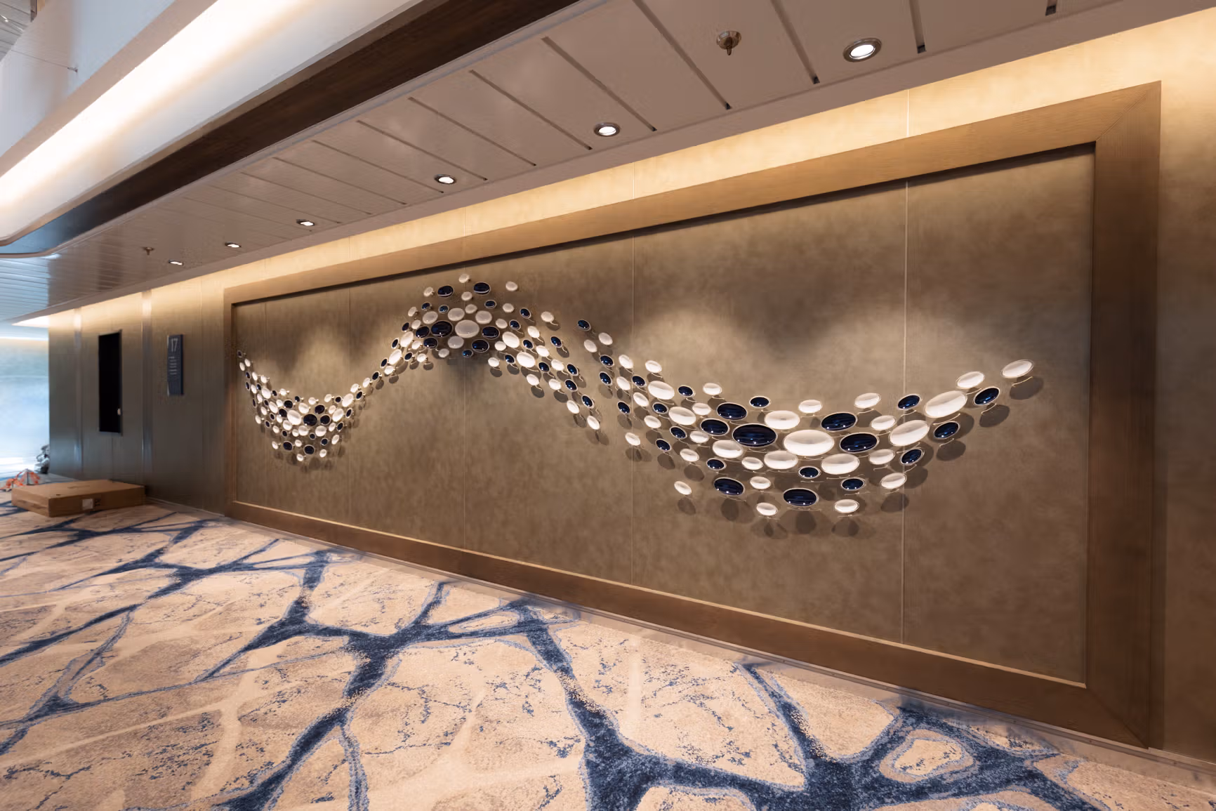 Every space in the ship has a unique narrative to tell of wonder and curiosity. Through the varied art collections, exploring the ship itself becomes a once-in-a-lifetime experience. From a larger-than-life dragon seeming to swim through the decks to the sparkling mixed media works lining the golden walls of the luxurious casino, every art collection reflects the spirit of that space and pulls the guest into a wondrous world of art and play. Inviting them to seek the moment.