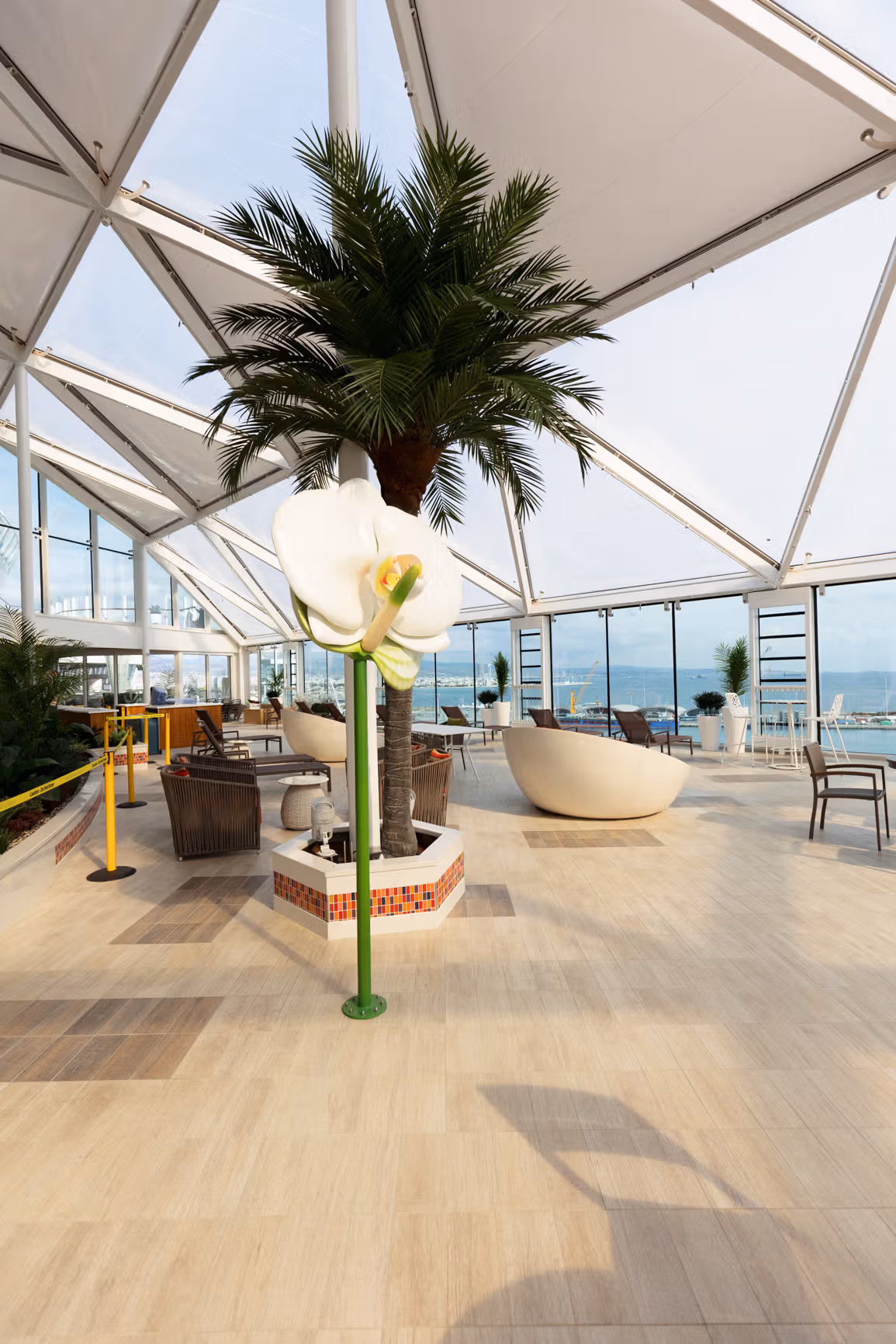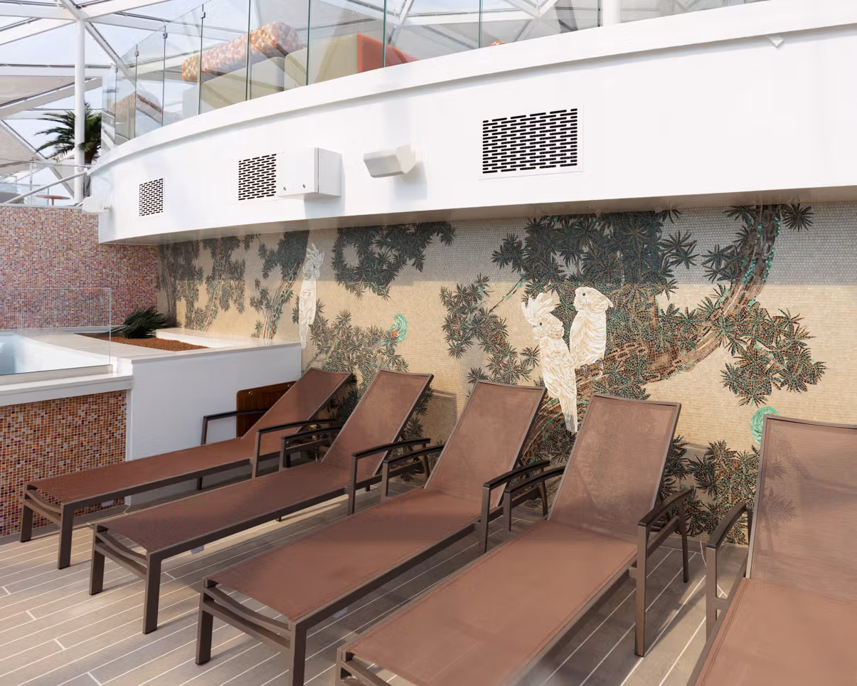 A unique collection for a unique space. The solarium neighborhood spreads across three decks where guests can gather to socialize under the sun, just like any neighborhood park.