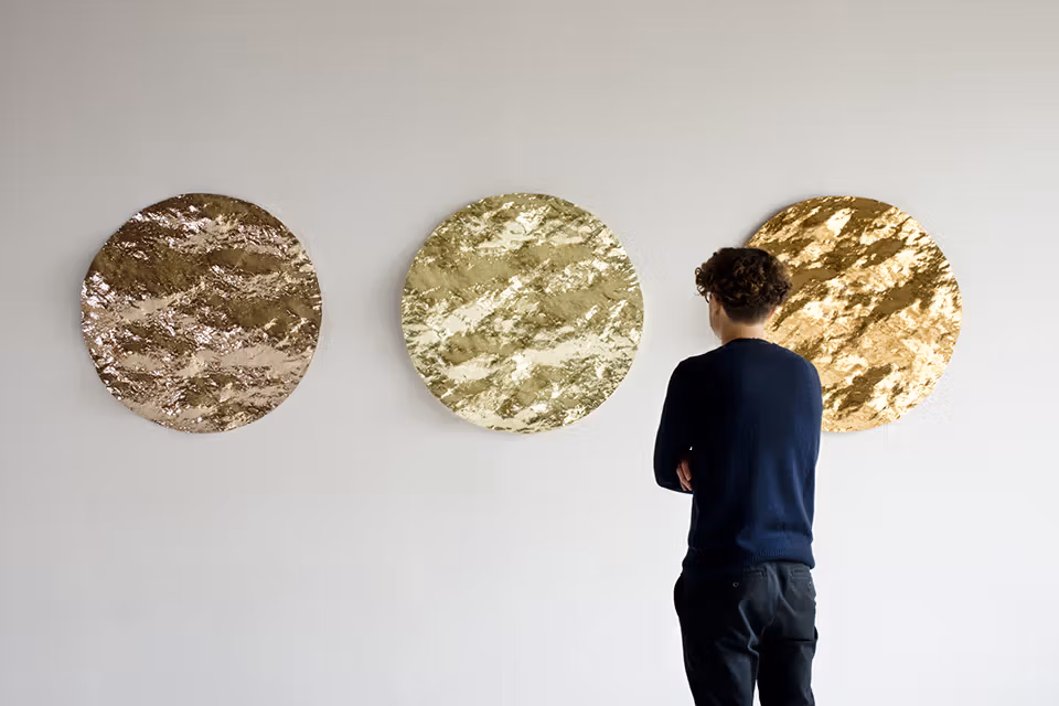 These unique reflective works glimmer in shades of gold and are beaming with affluence. The artist used thermoformed glass, a unique process that allows him to create texture without losing the perfection of the circle. Through this technique, a striking surface was constructed, so that the glass reflects the light in a different way from every angle. The artist used every shade of gold leaf available to reflect the changing shades of a golden sun setting into the ocean.