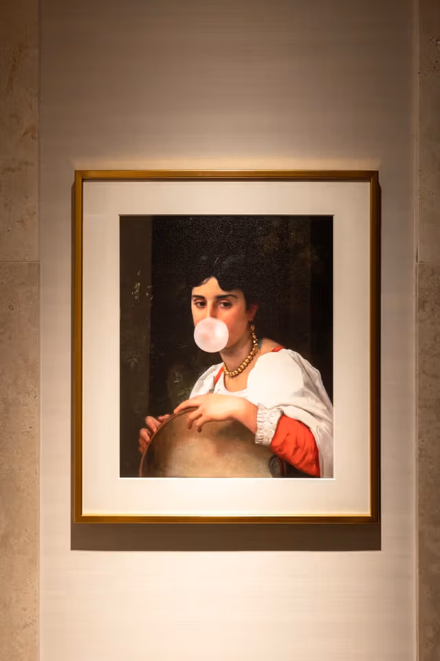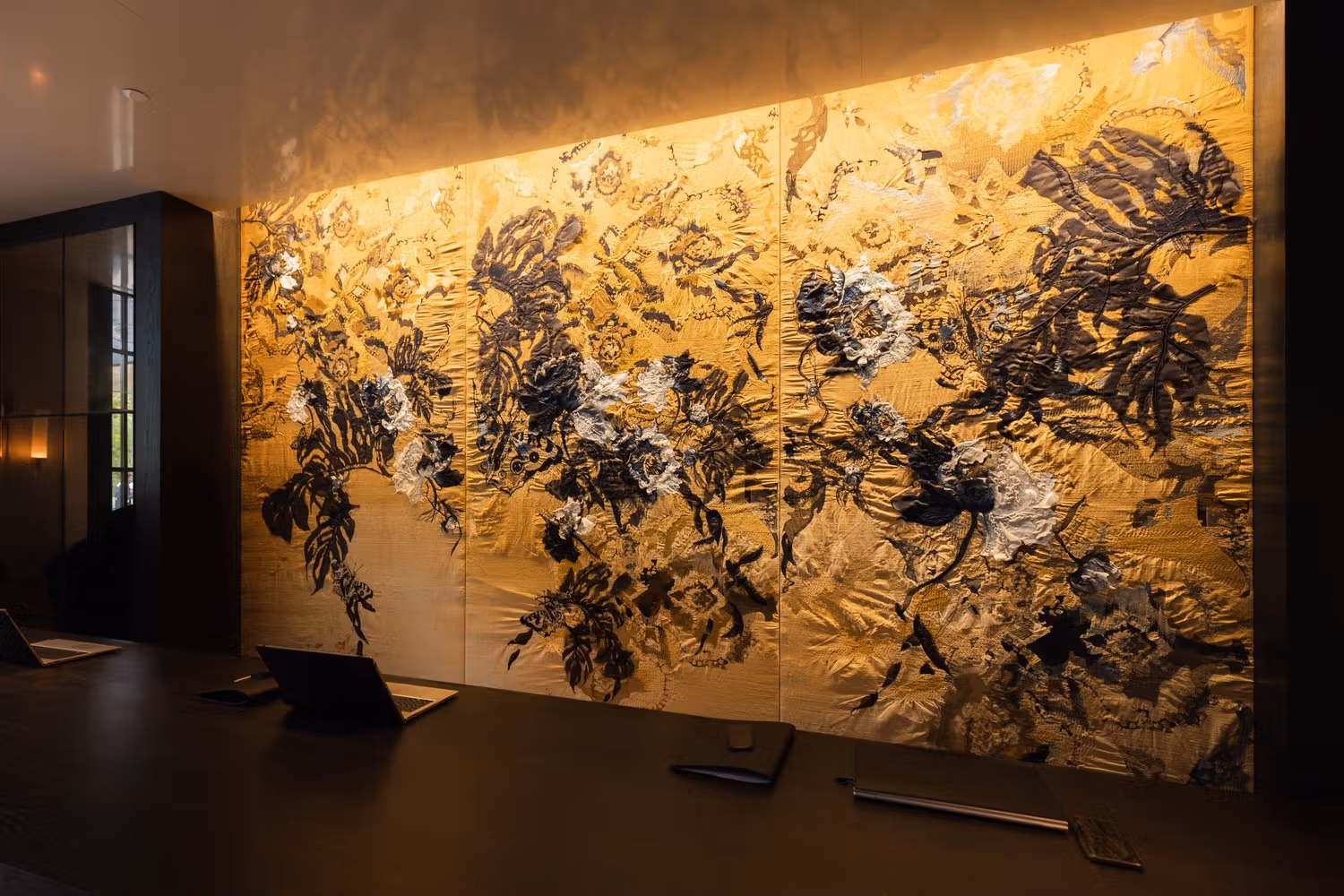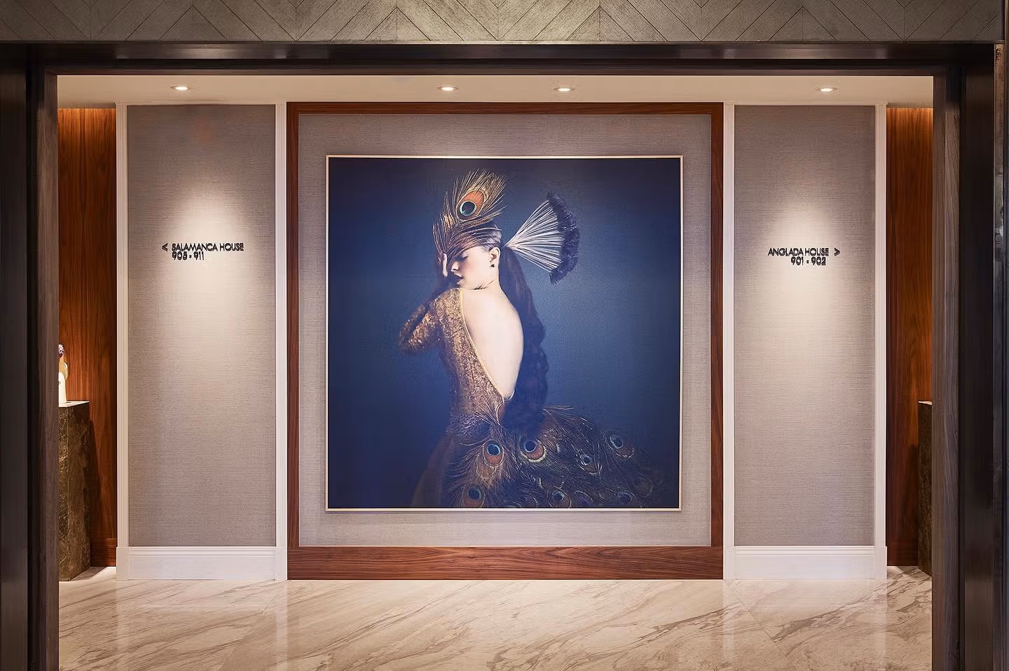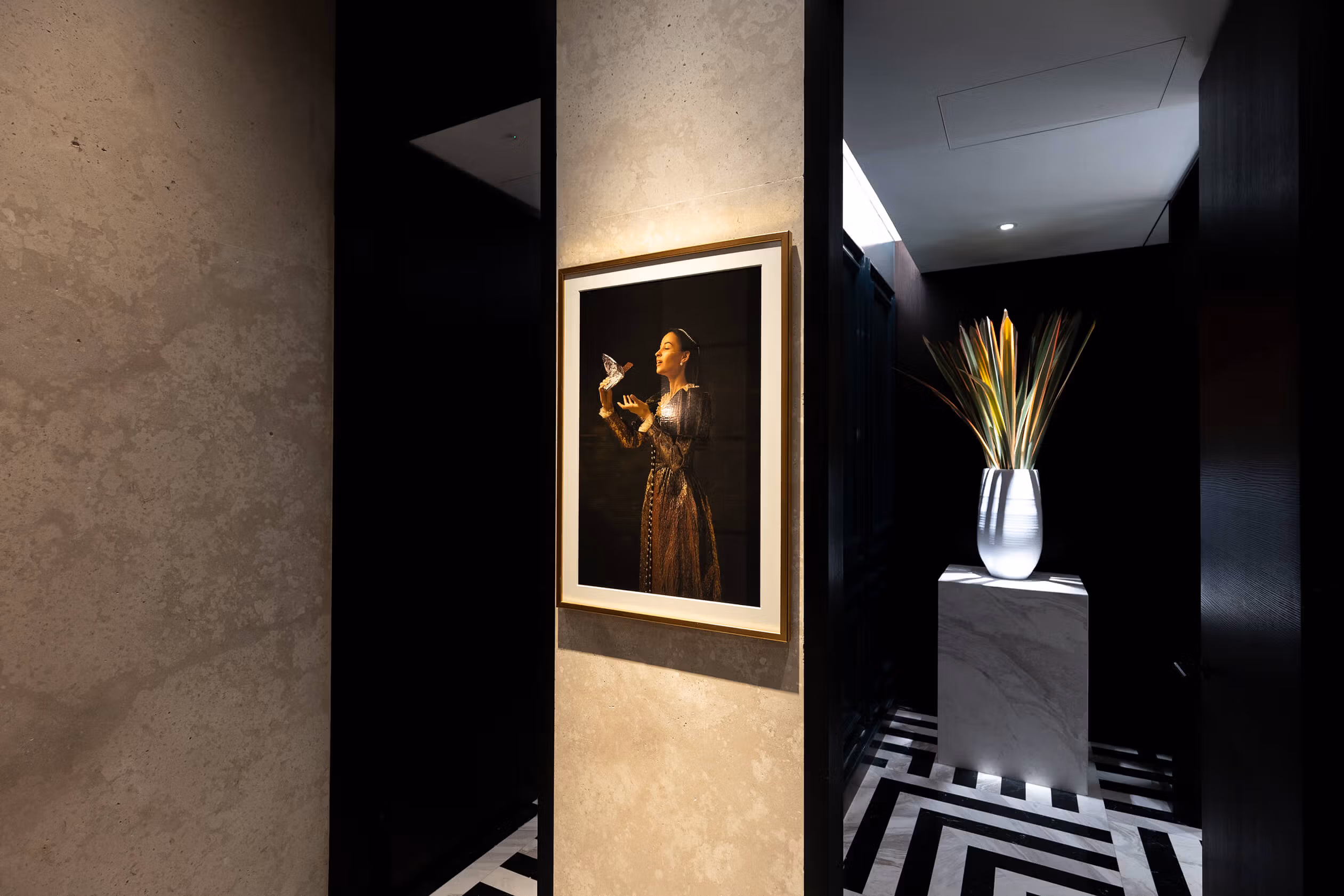 A tailor-made piece by artist Jacky Puzey draws inspiration from Madrilenian aesthetics and Spanish tailoring from Balenciaga to Oteyza. Introducing an interplay between light and dark, detail and color, the artwork fuses the sense of opulence, grandeur and drama inherent in Spanish architecture, court painting and fashion. The richness of historical costumes and textiles, combined with contemporary craftmanship, create a unique 3D tableau, an ode to local heritage.