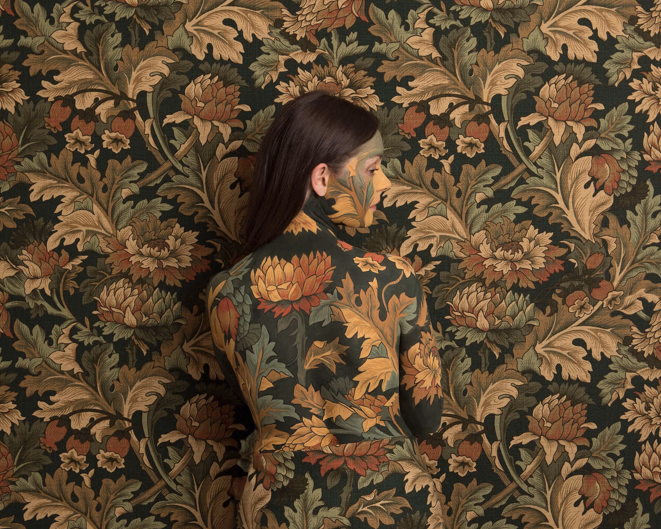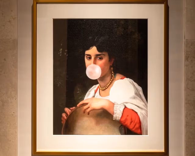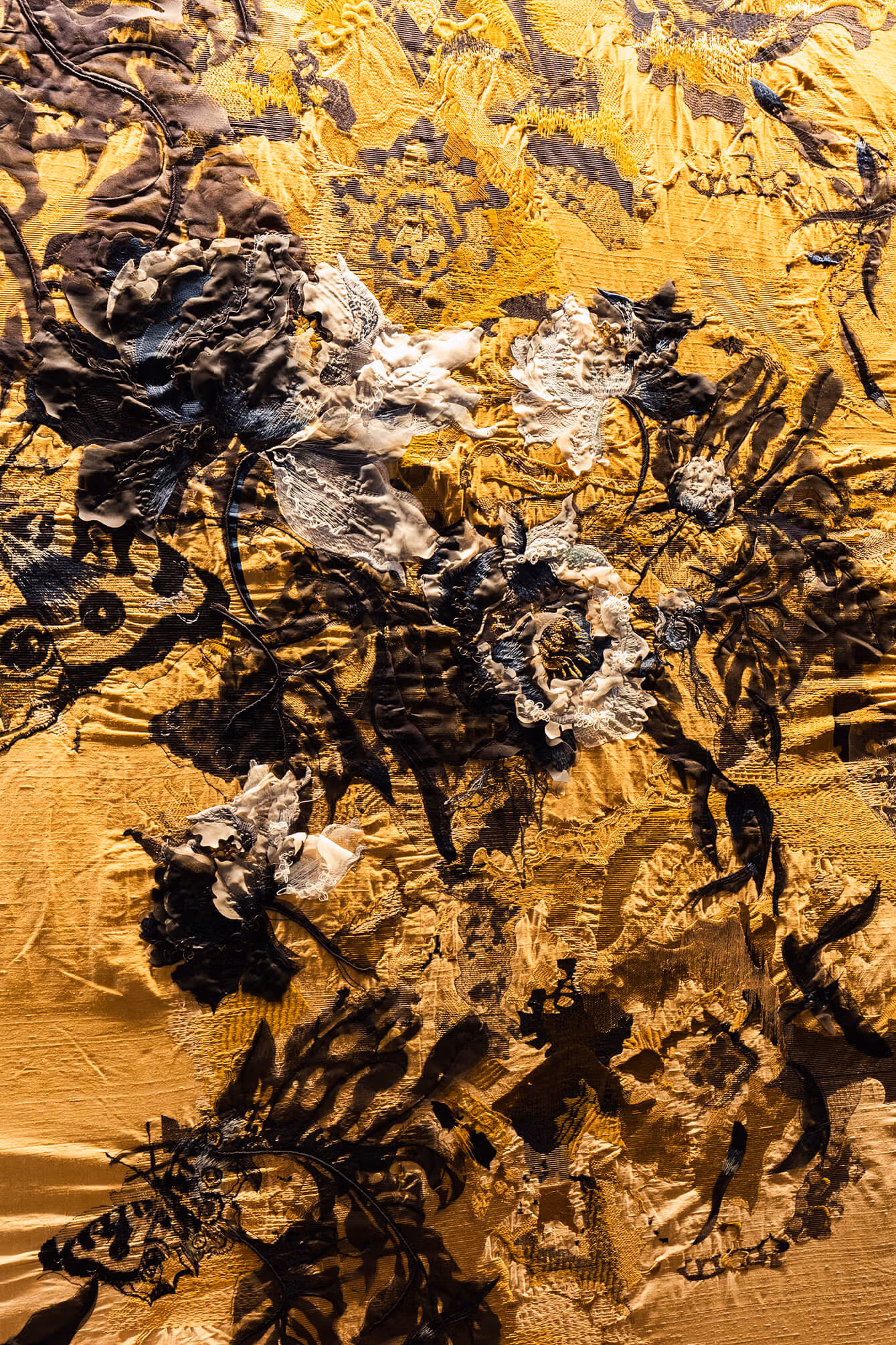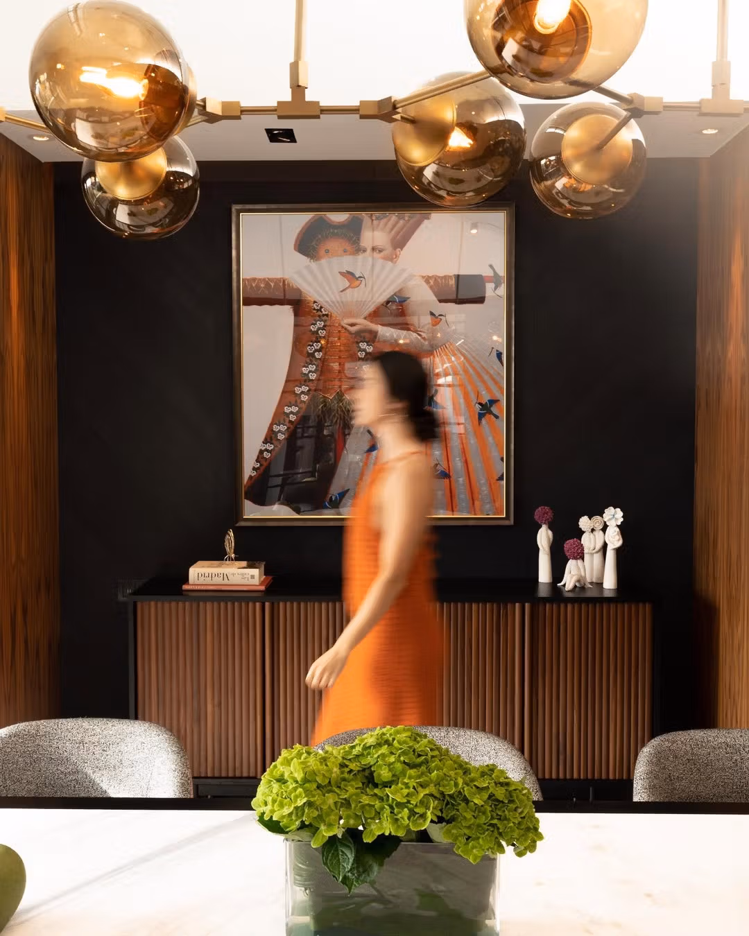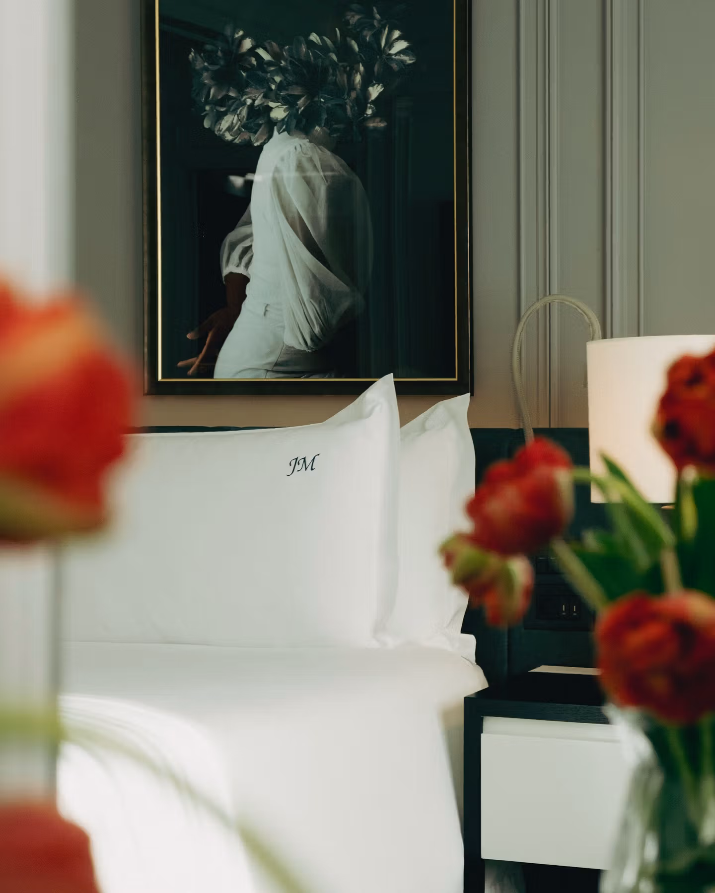 A tailor-made piece by artist Jacky Puzey draws inspiration from Madrilenian aesthetics and Spanish tailoring from Balenciaga to Oteyza. Introducing an interplay between light and dark, detail and color, the artwork fuses the sense of opulence, grandeur and drama inherent in Spanish architecture, court painting and fashion. The richness of historical costumes and textiles, combined with contemporary craftmanship, create a unique 3D tableau, an ode to local heritage.