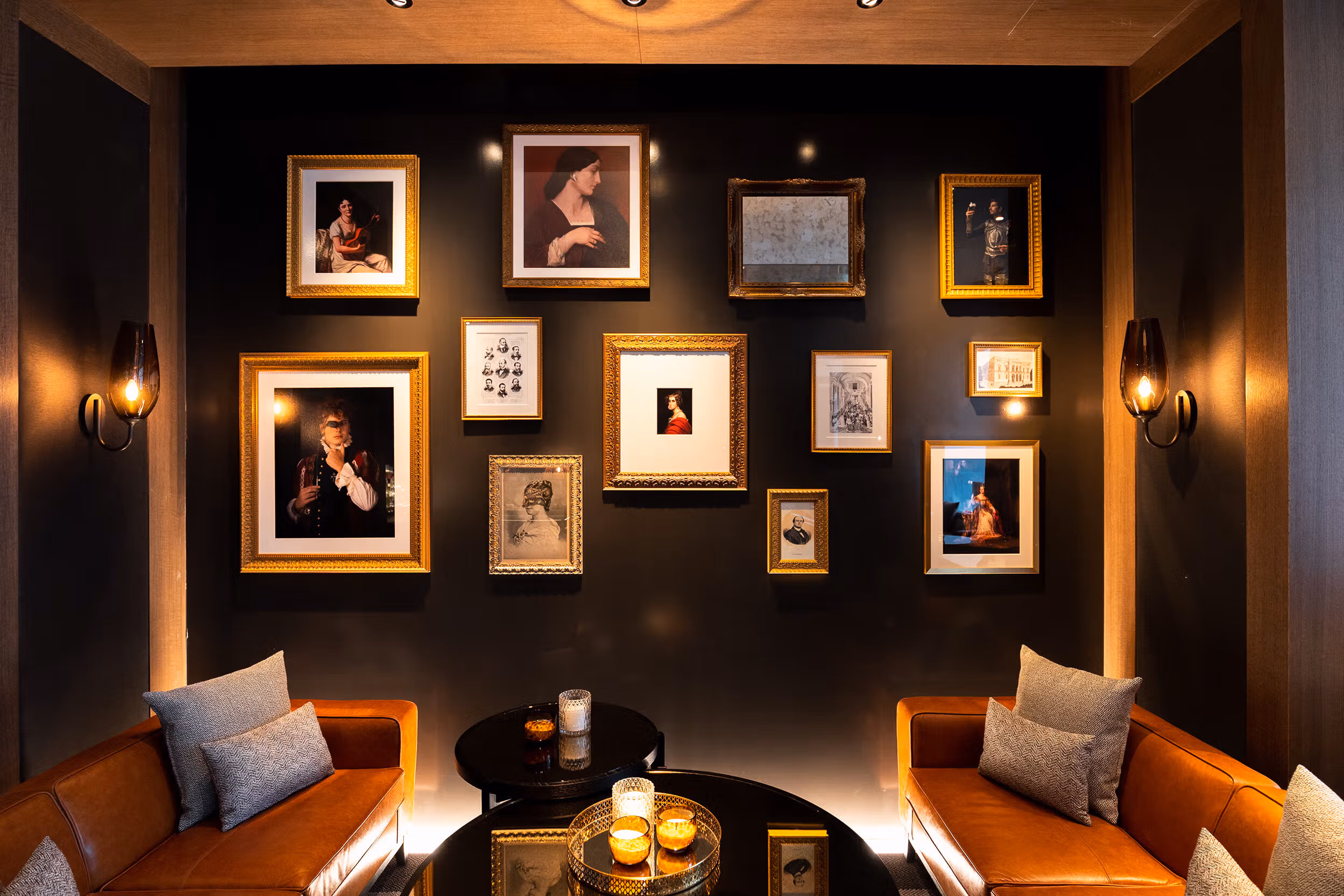 The Bar of the hotel is where visitors gather together to celebrate memorable moments in day-to-day life. There, one would be welcomed by a cascade of personalities who shaped the place throughout history. A collection of real and imaginary portraits pays a humoring homage to the very residential habit of displaying images of loved ones.