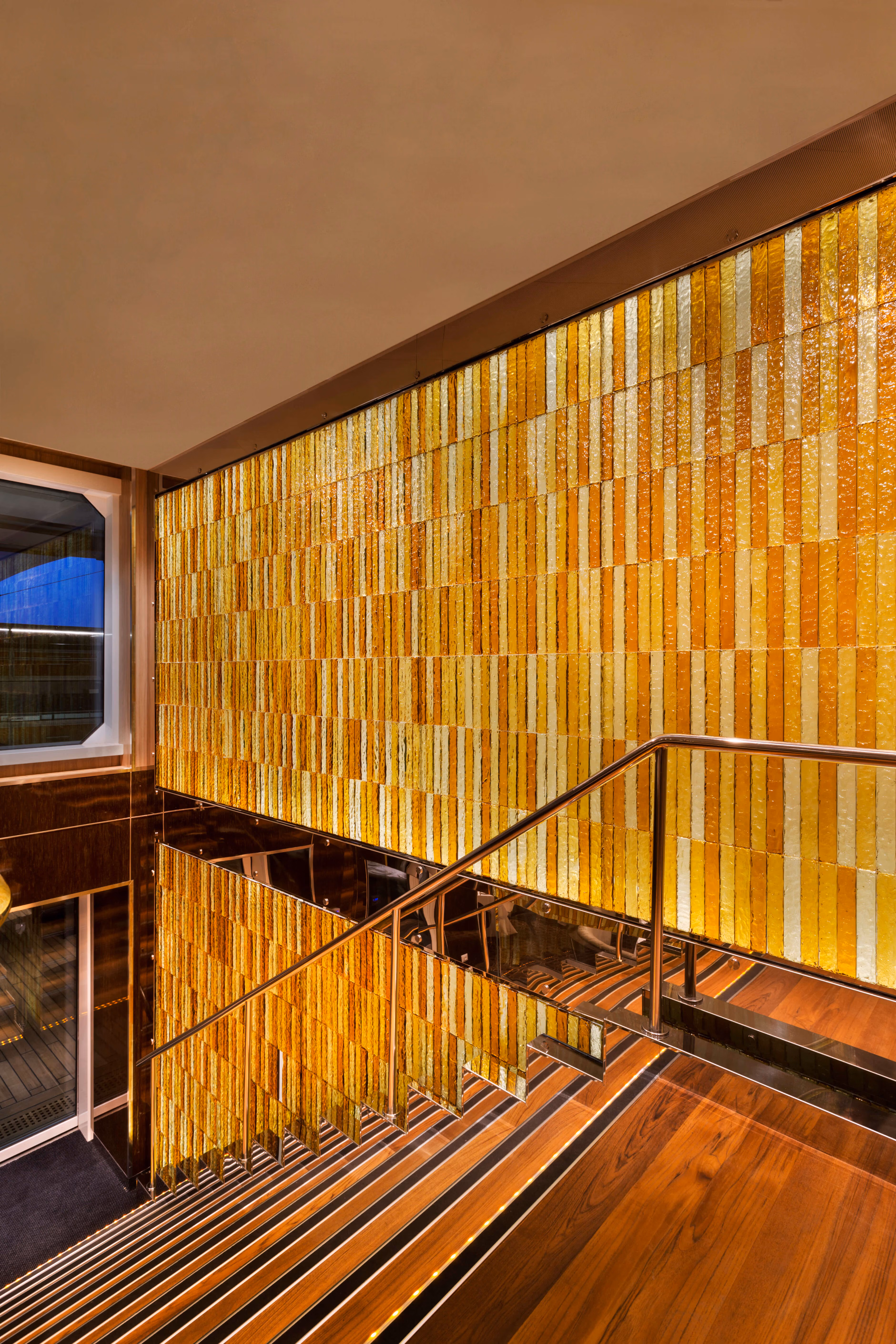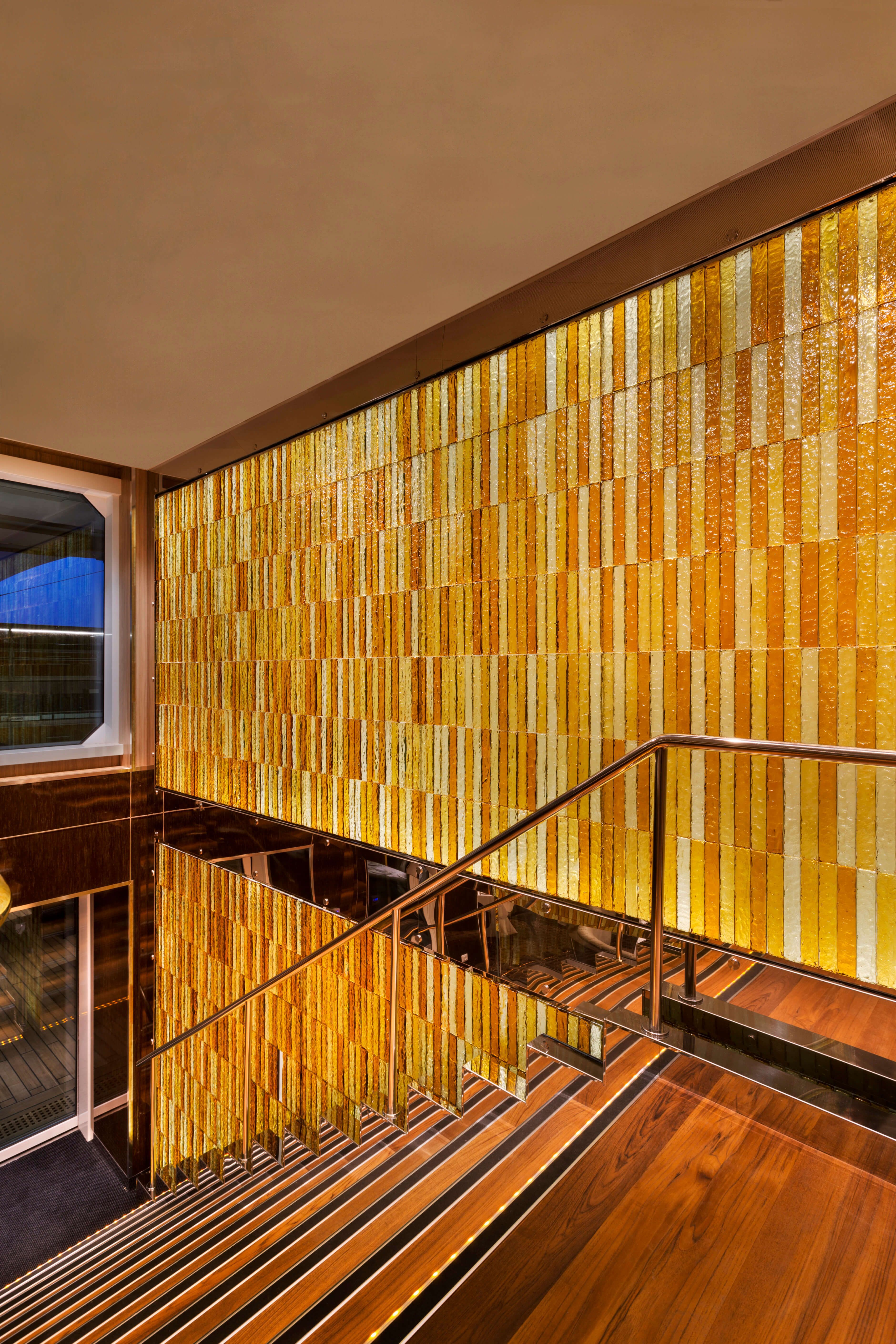 The exciting history of the spice trade and its industry built from transit across oceans inspired the ArtLink-designed wall. From its conception to installation, ArtLink oversaw the construction of 1840 hand-casted glass bricks produced by expert artisans in colors ranging from turmeric to cinnamon, and each brick was hand-cast in sand to create a tactility reminiscent of running one’s hand through ground spices.