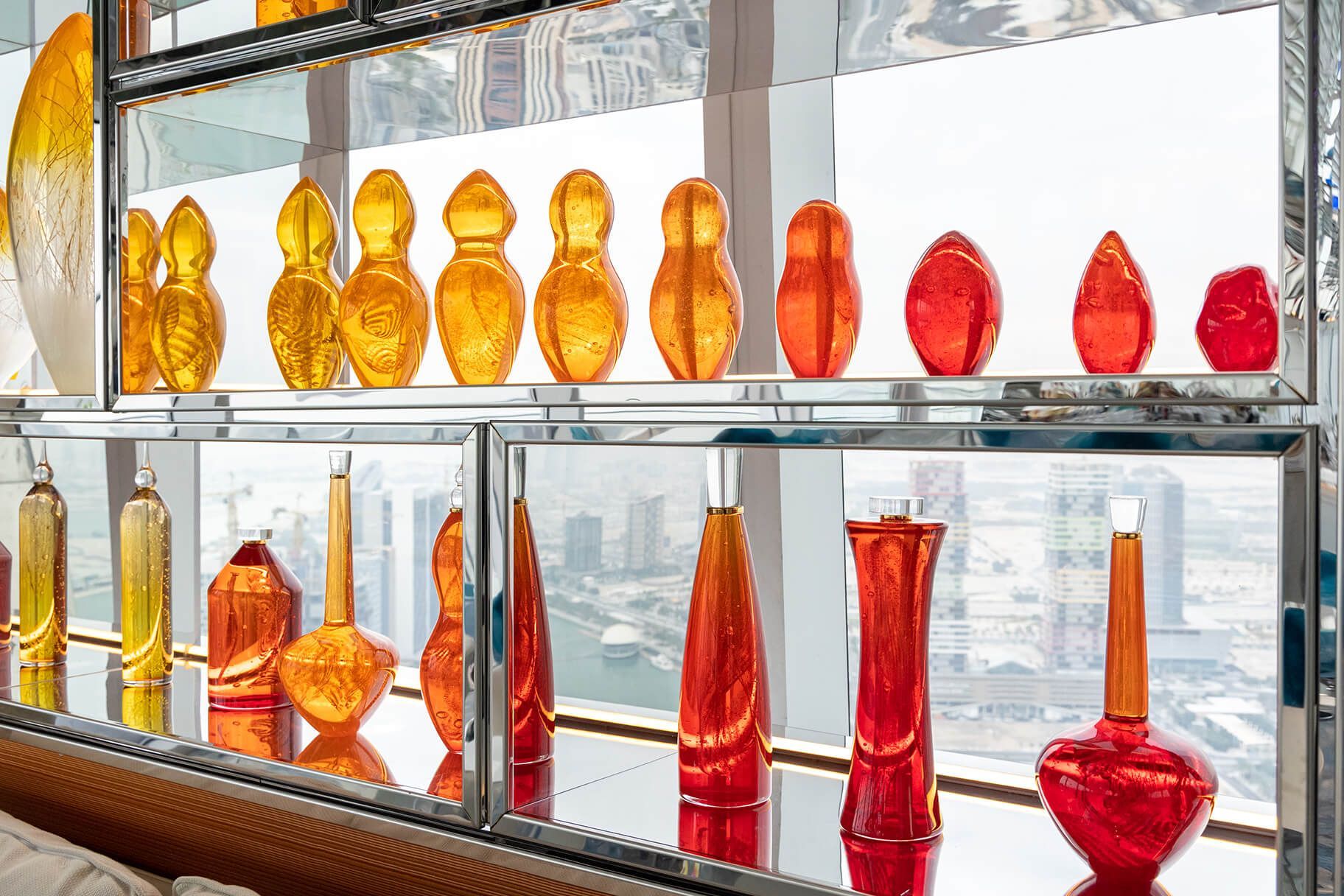 Crafted into solid glass, the pieces cleverly simulate the illusion of a containing a local specifmen suspended in a richly coloured medium. Each piece that is adorned with a lid or stopper enhances the illusion of a liquid-filled vessel, evoking the sense of an archival collection made up of precious inclusions from Qatar.