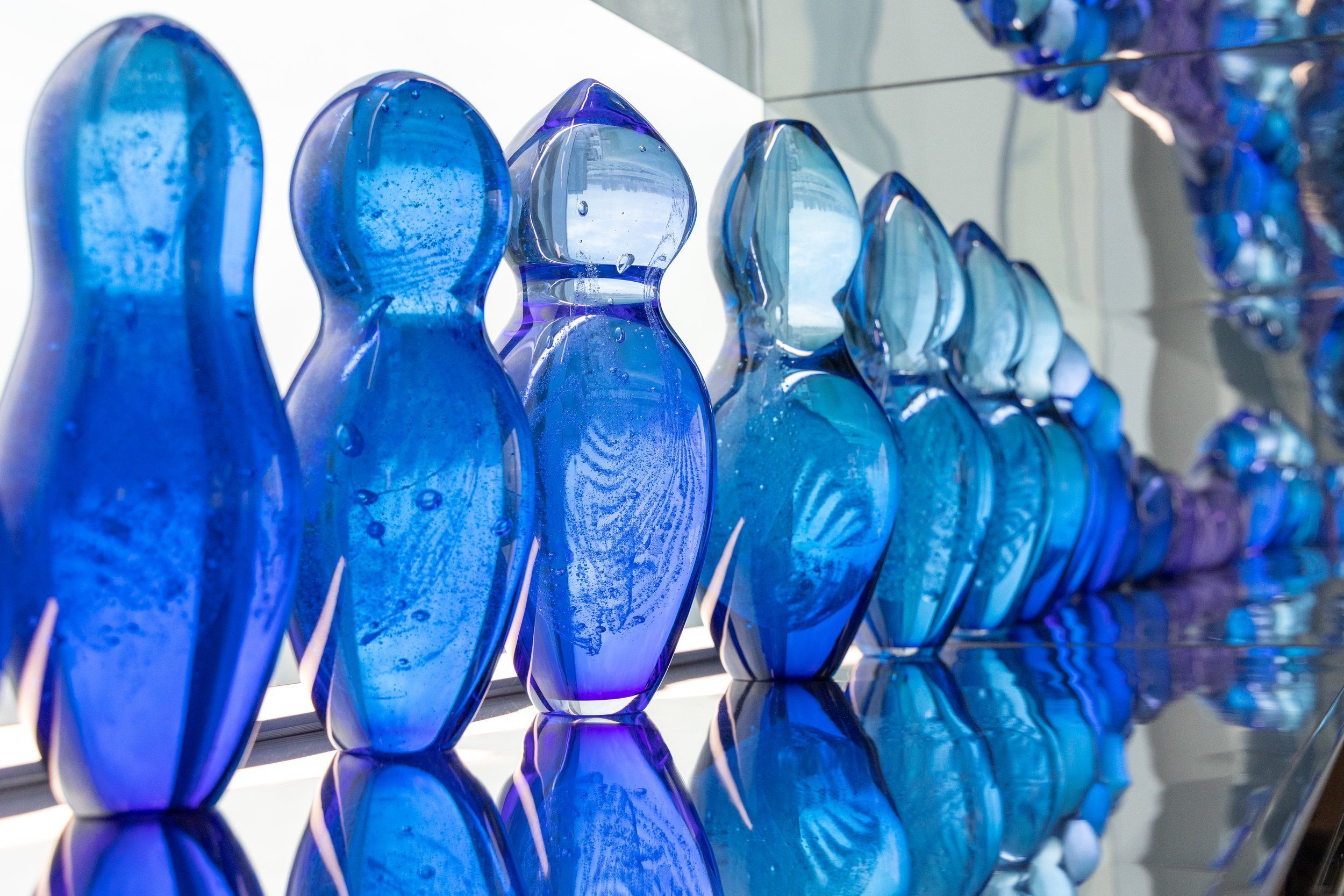 The installation comprises a total of 108 works, a number symbolizing spiritual completion. Fashioned after the notion of a “work in progress” towards spiritual completion, the display features multiple series of glassworks, each offering a glimpse into an evolutionary process. Beginning with the initial form in its raw state, the subsequent pieces gradually progress toward their ultimate finished state.