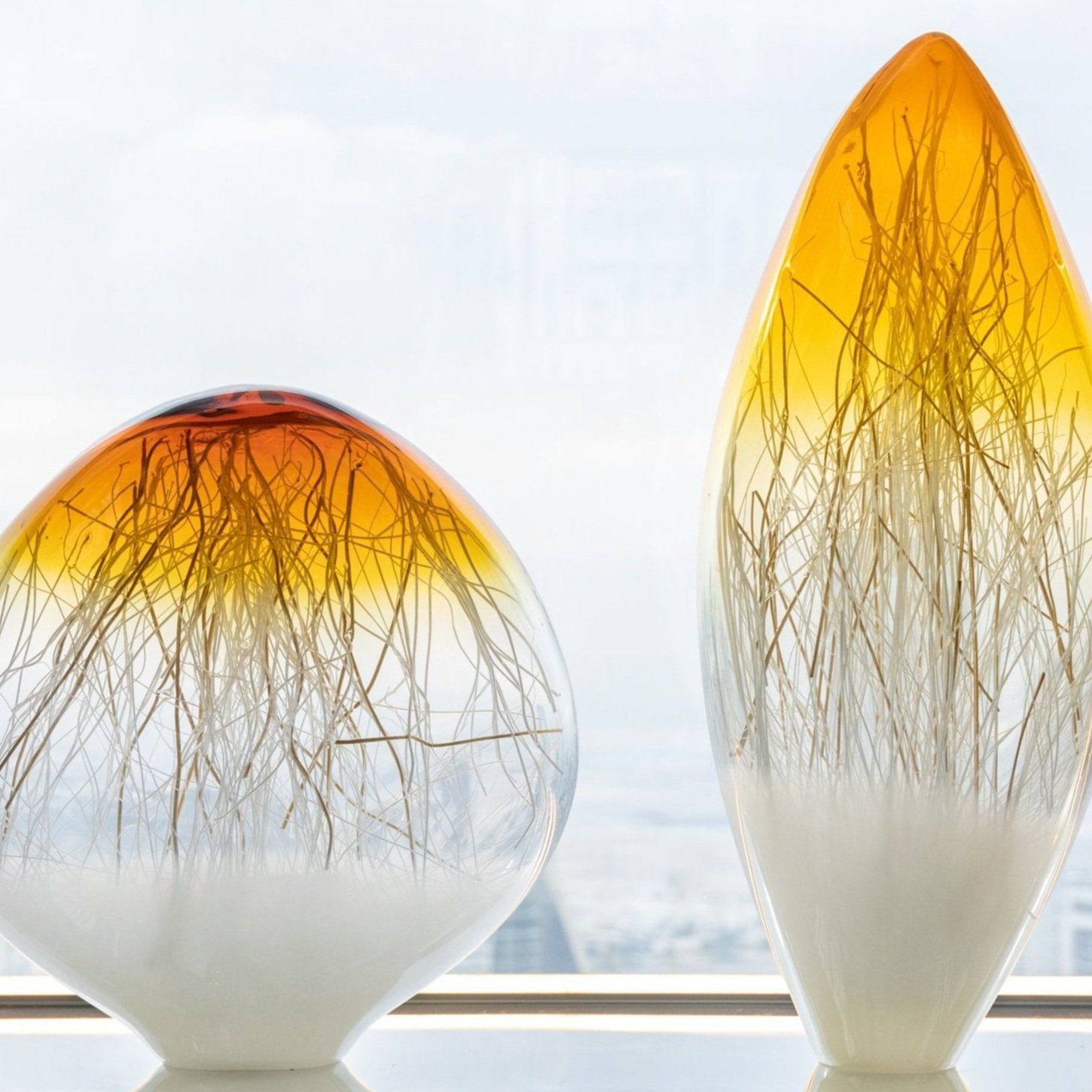 Embedded inside each one are a multitude of glass threads coated with precious metals, serving as a tribute to Qatar's rich historical legacy of metalworking excellence. Employing warm-toned 22K gold for the FIRE pieces and cool-toned platinum for their ICE counterparts, the artist further honours the innate preciousness of natural materials of the sun and water.