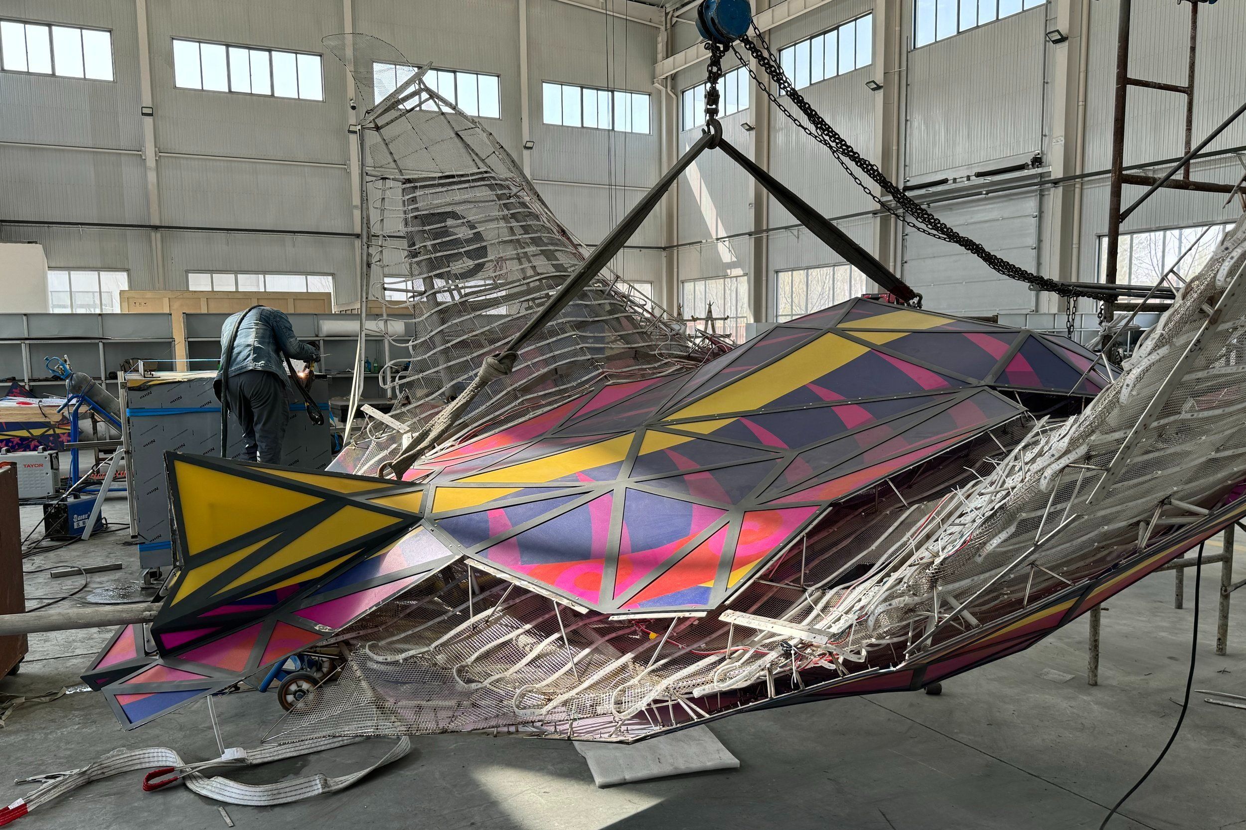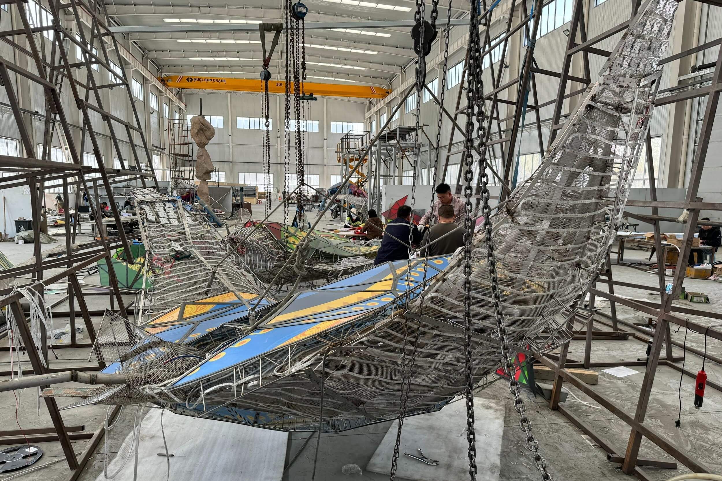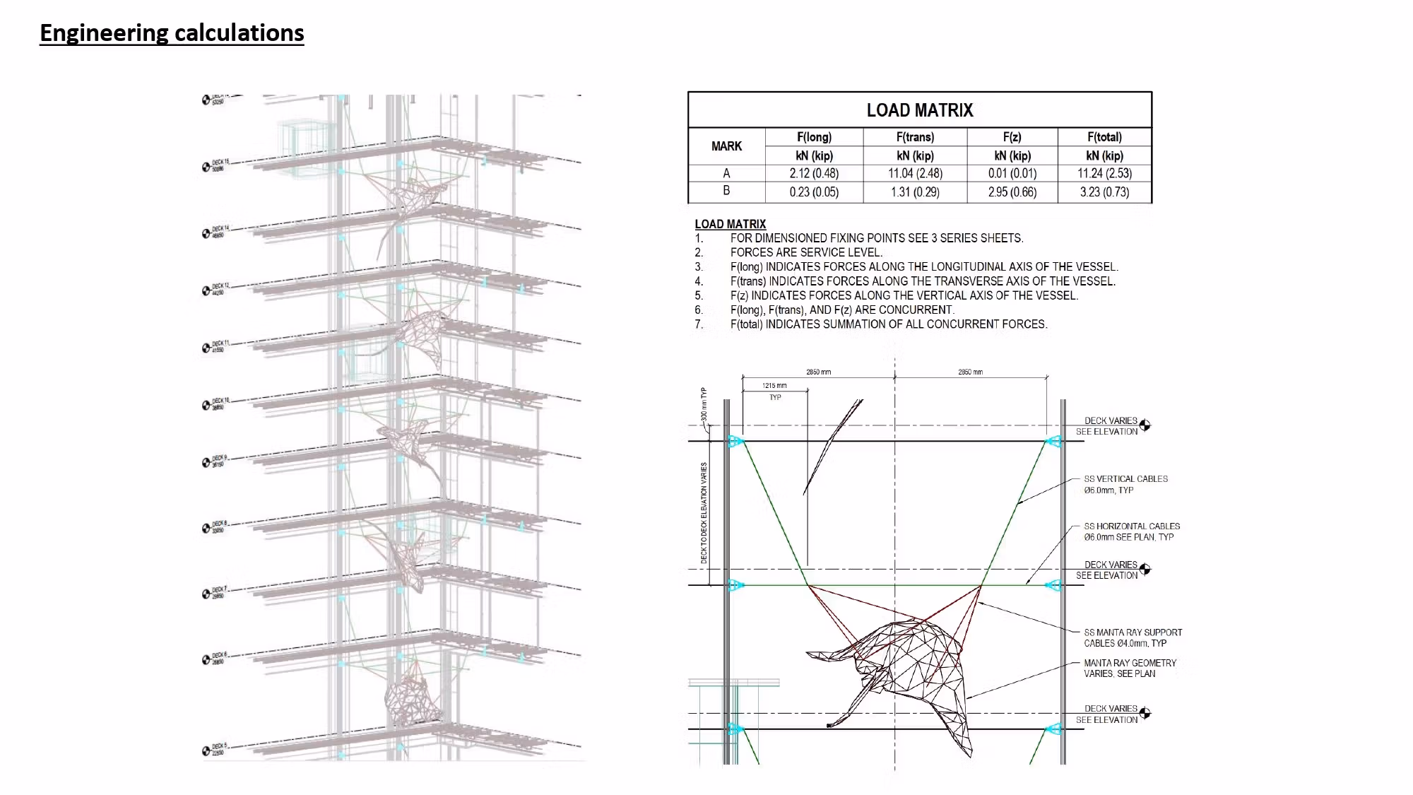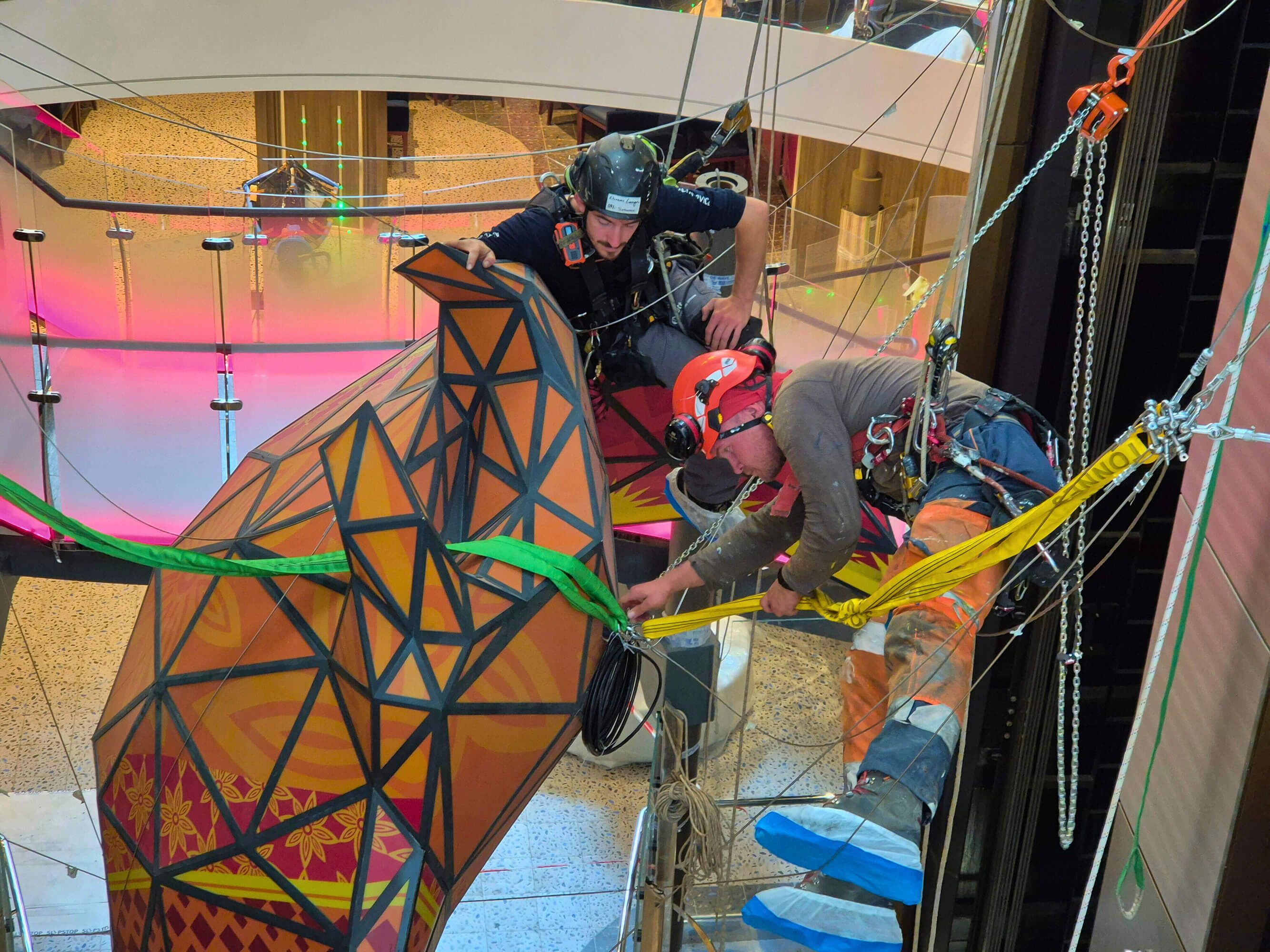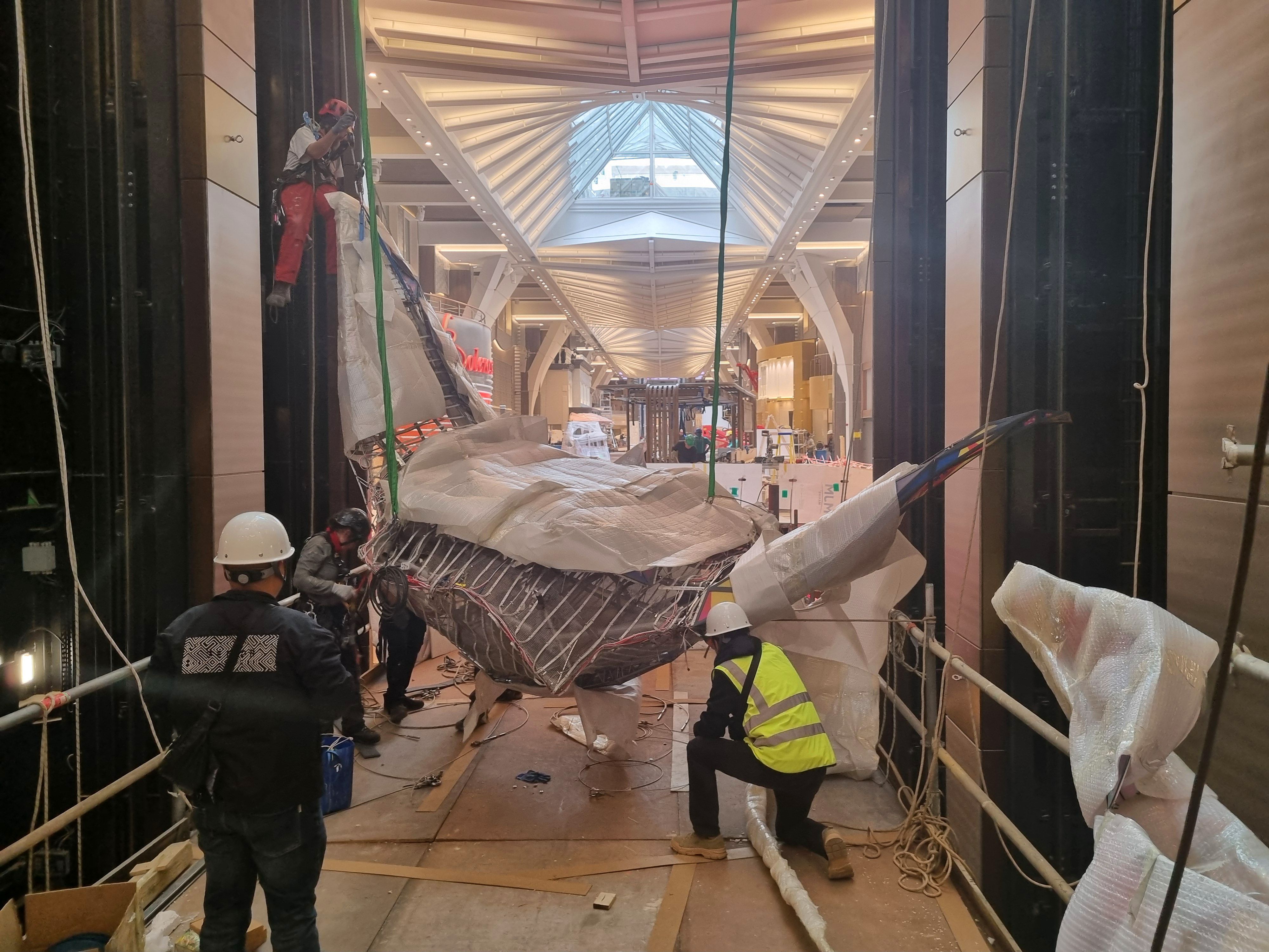 After an extensive structural analysis including detailed calculations and mechanical specifications for connection points, cable systems, and the assembly process, the ArtLink logistics team devised a a sophisticated matrix of steel cables that would securely anchor the manta rays to the atrium walls. This setup not only ensured safety but also gives the illusion of the rays gracefully swimming through the space.