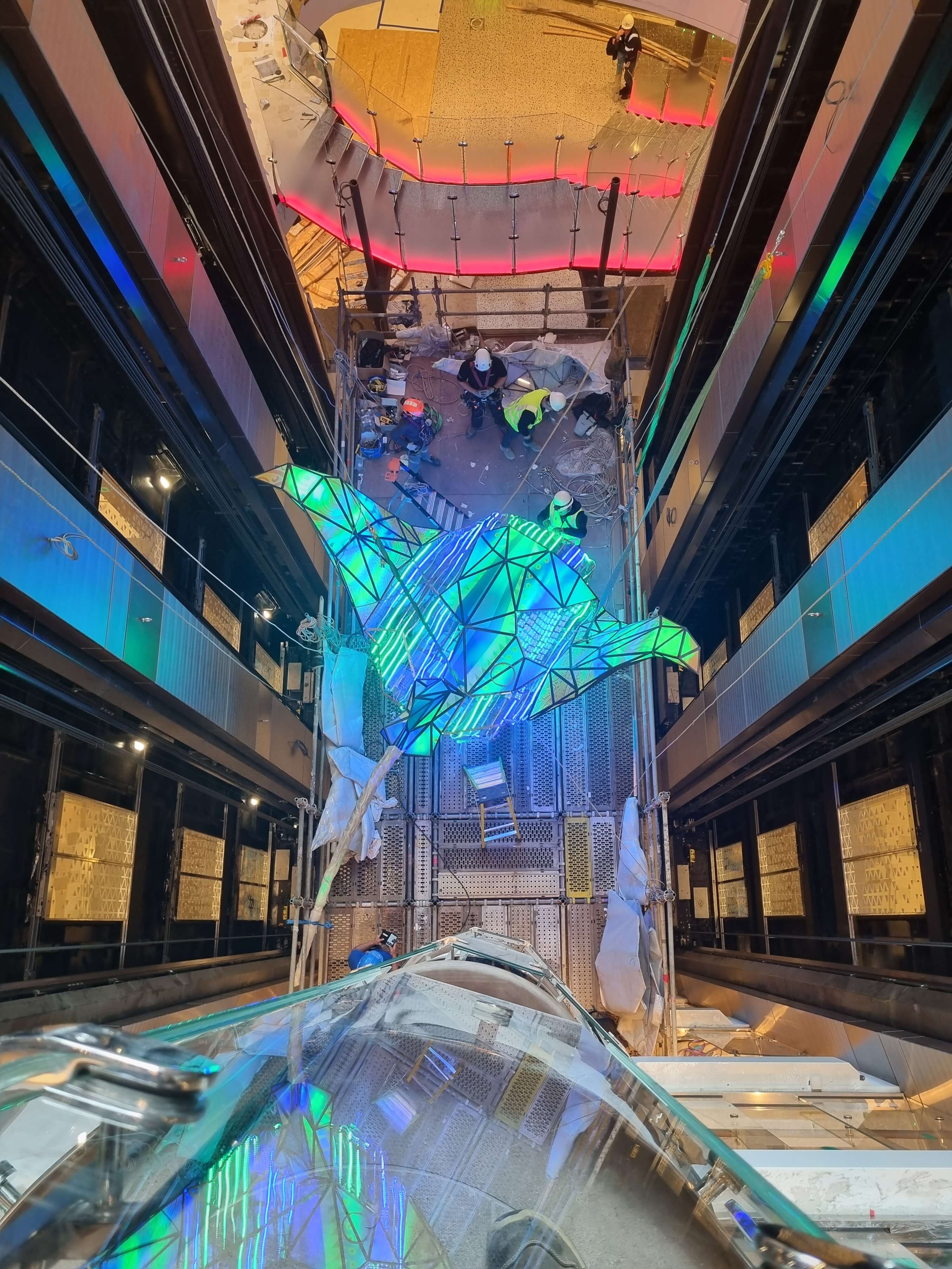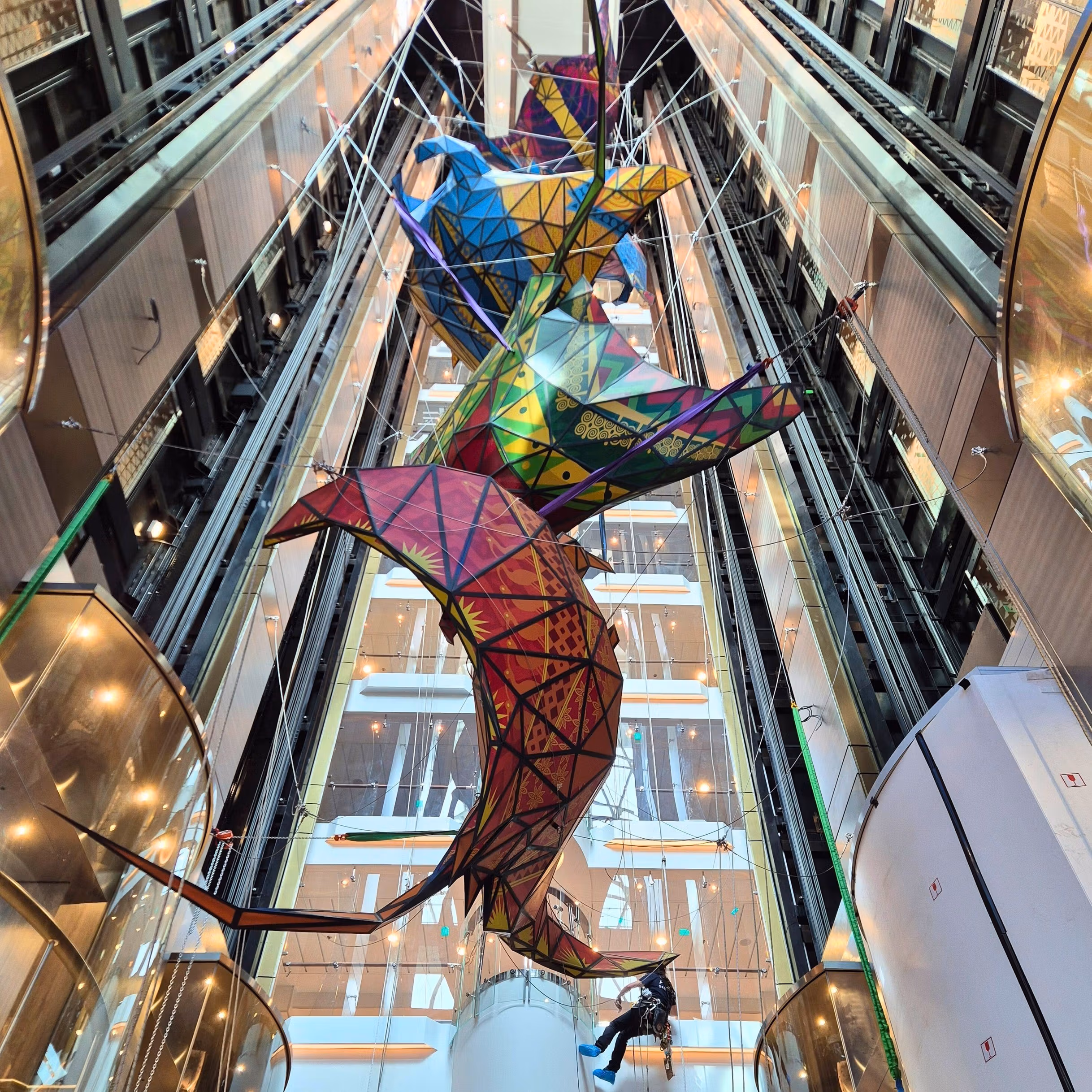 The project began with a vision to fill the ship's expansive atrium space with an installation that could be seen and admired from every height and angle. The idea was to suspend five manta ray sculptures from level 2 to level 16, creating a dynamic visual experience for anyone moving through the atrium, especially as they rode the panoramic elevators.