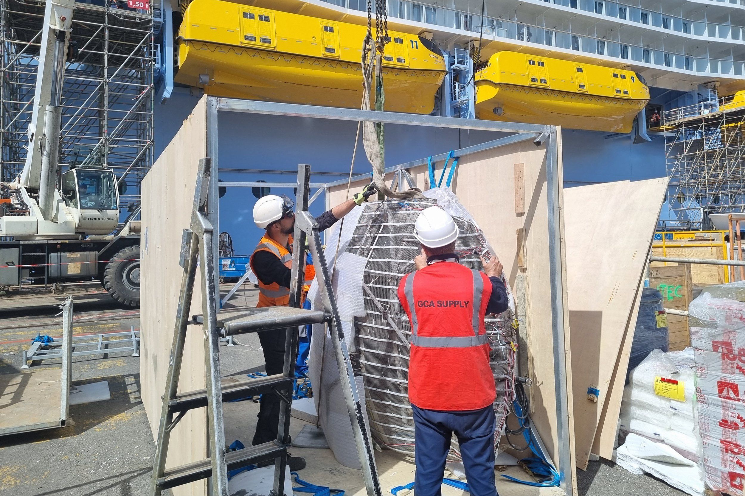 Once the crates for each manta ray were delivered to the pier, the crate was disassembled, and our logistics team oversaw each section craned onto the ship. A specially made trolley was used to safely transport the manta ray parts to the assembly platform. The five manta rays were assembled by our local installation team together with the fabricator’s technicians.