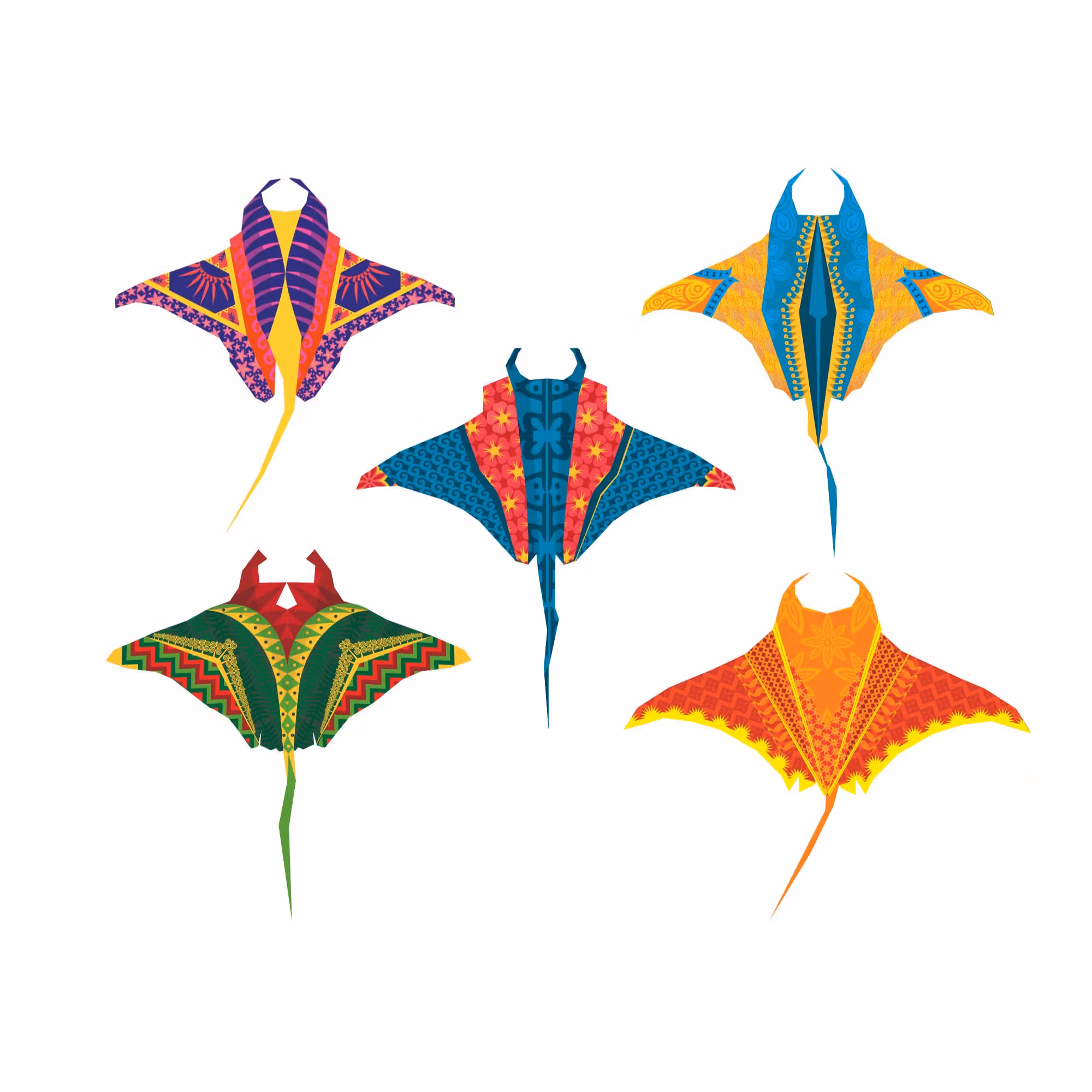 The two Bahamian manta rays blend elements from the national flag, sea-related symbols such as conch shells and starfish, wildlife motifs such as the flamingo, the national bird, and waves representing the power of the sea; The Puerto Rican manta ray blends symbols from Taino culture, such as the coqui (a native frog), the sun, and the national flower, the flor de maga; The Barbadian manta ray blends the symbols of the national flag, the flying fish, representations of the national flower, the Caesalpinia pulcherrima, and other local wild life; The Jamaican manta ray features national symbols like the hummingbird, tropical flora, and cultural motifs from Jamaican festivals such as musical symbols; and The Trinidadian and Tobagonian manta ray features Carnival-inspired designs and motifs from calypso music such as steelpan musical instruments, alongside national symbols like the scarlet ibis and the Chaconia flower.